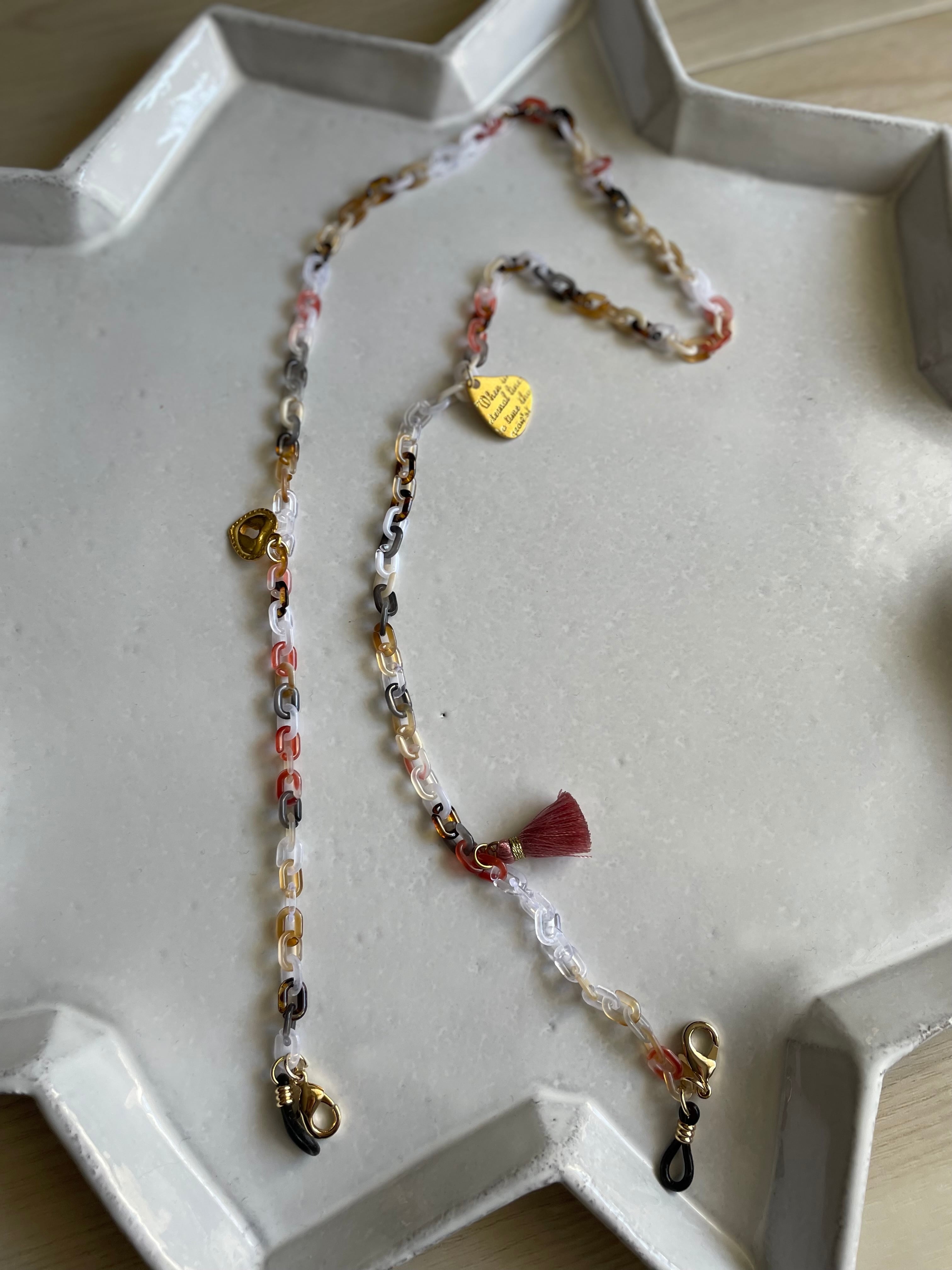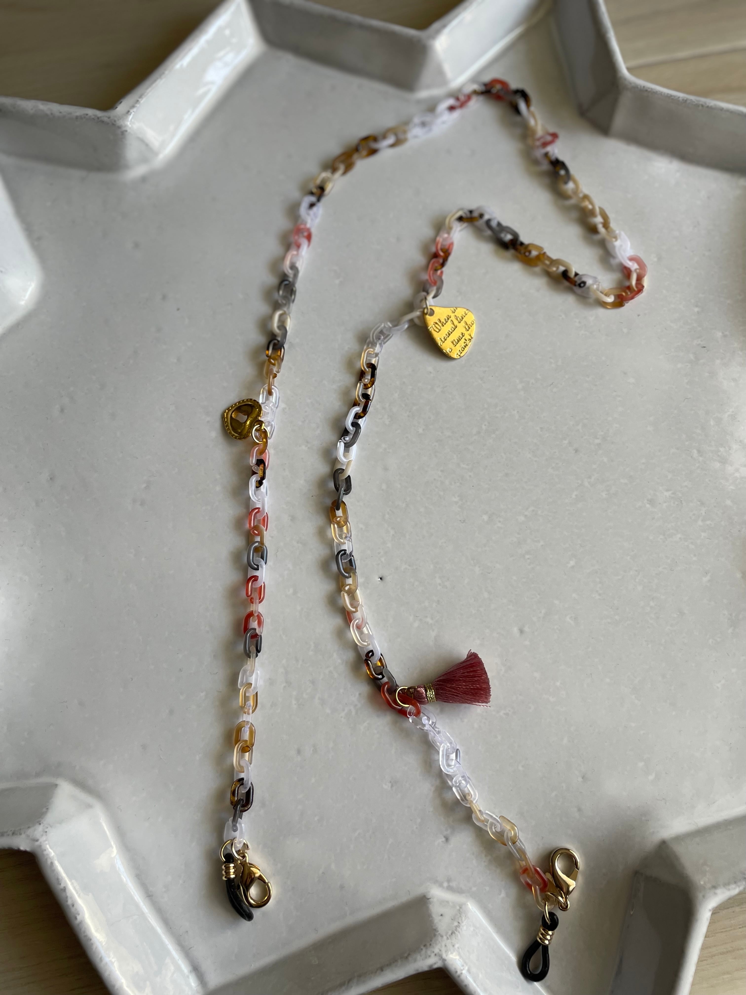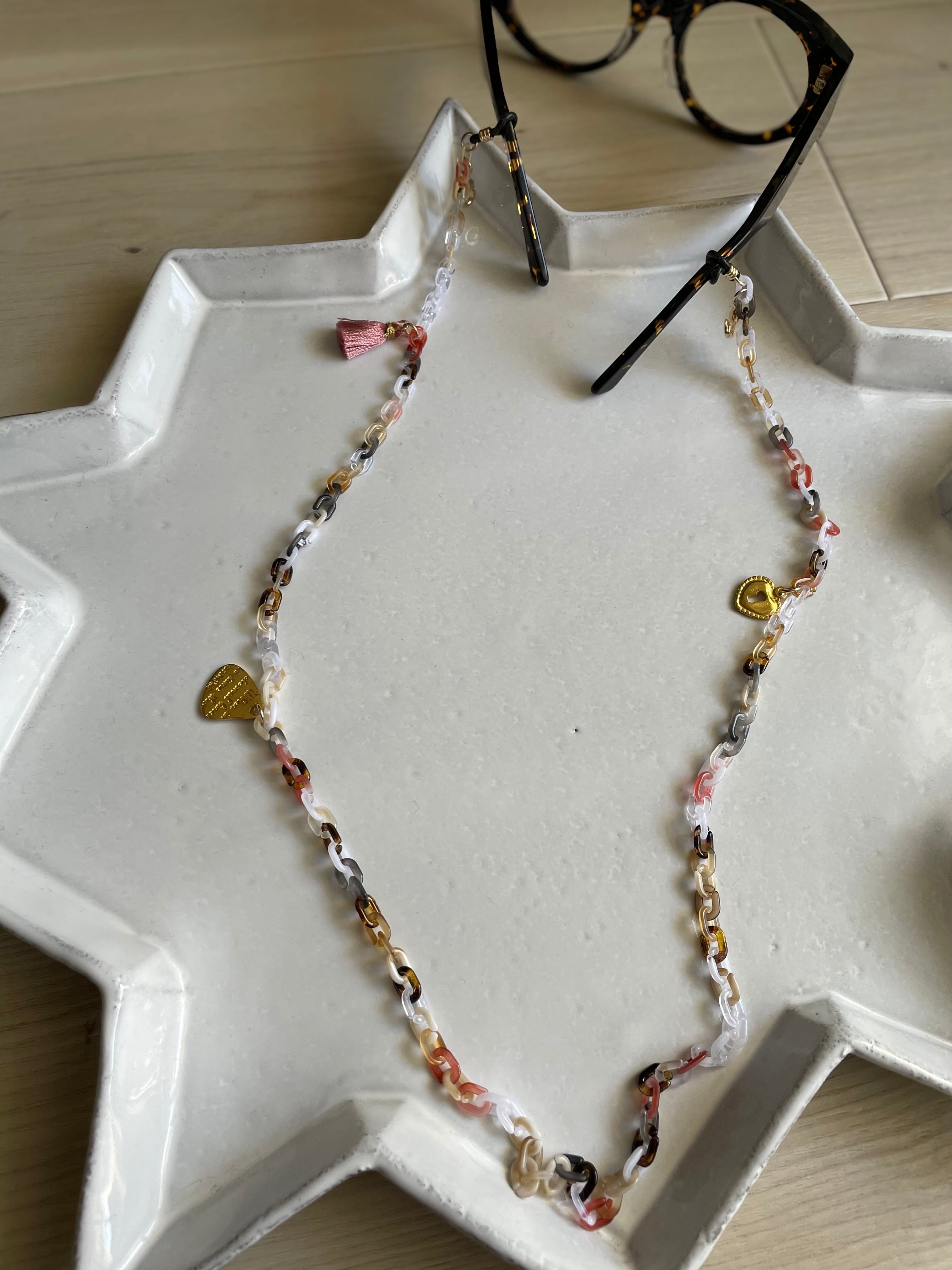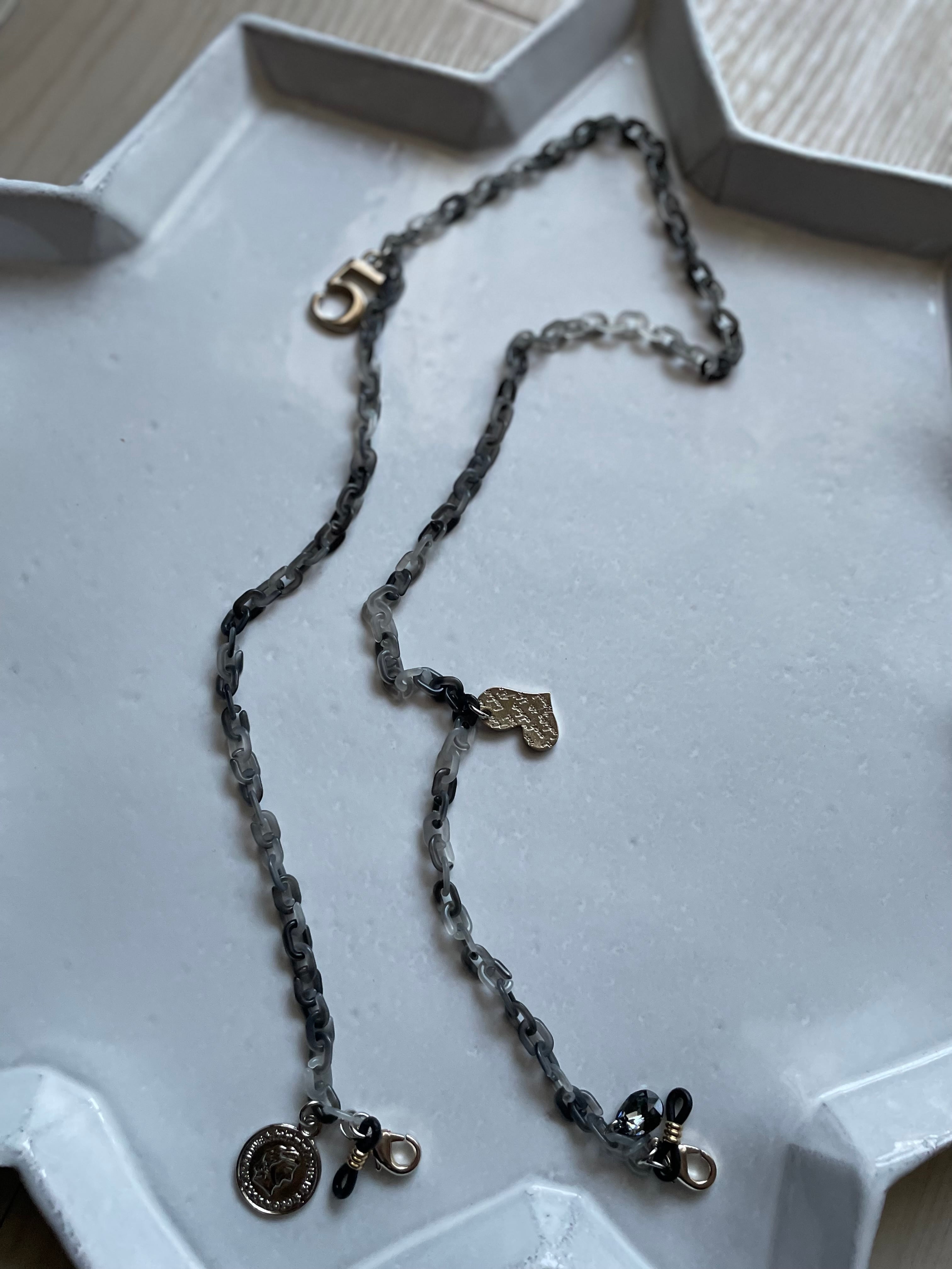マーブルのアクリルチェーンにタッセルやクリスタルガラス、チャームを付けて、大人の遊び心あるメガネチェーンです。