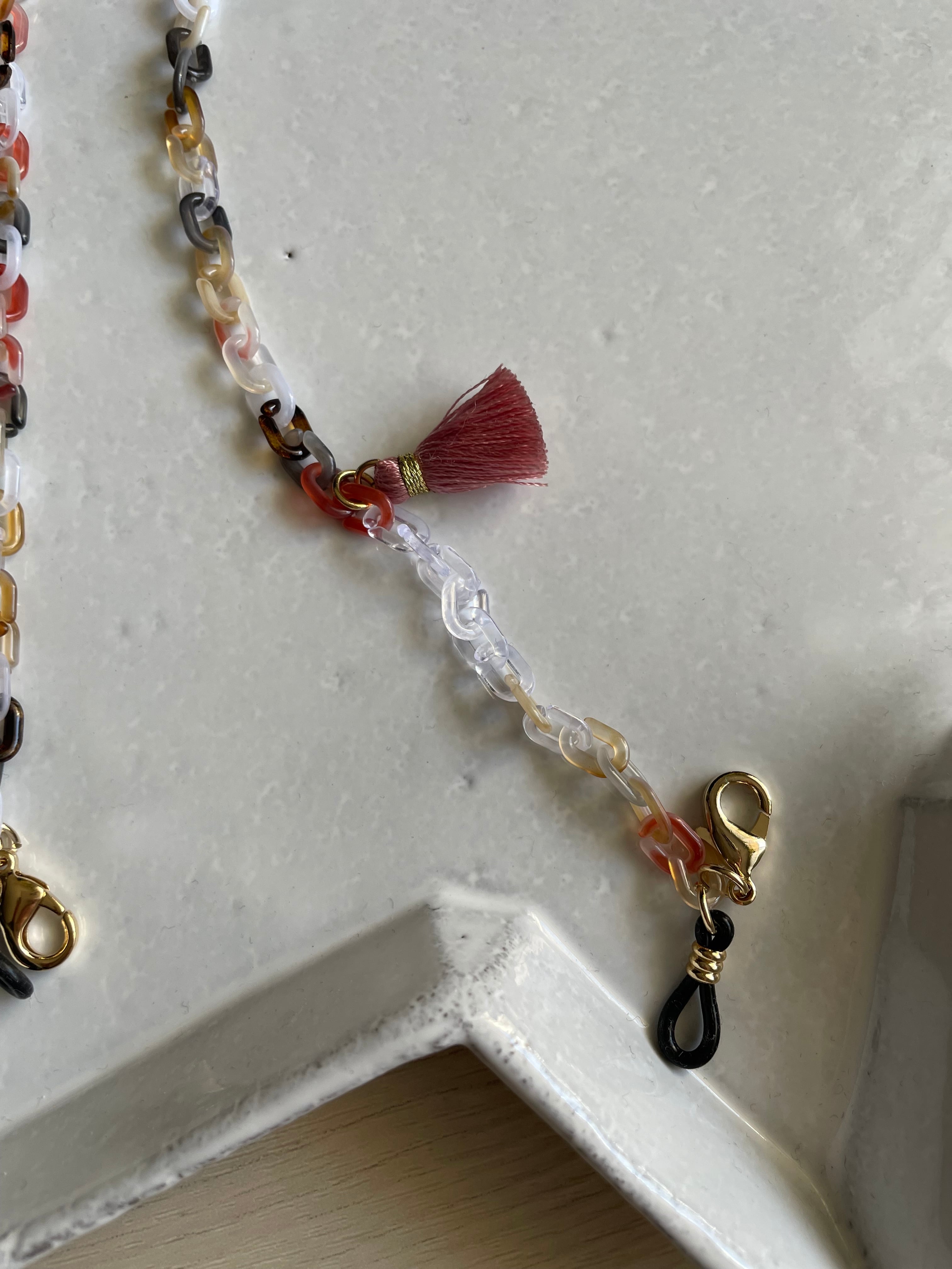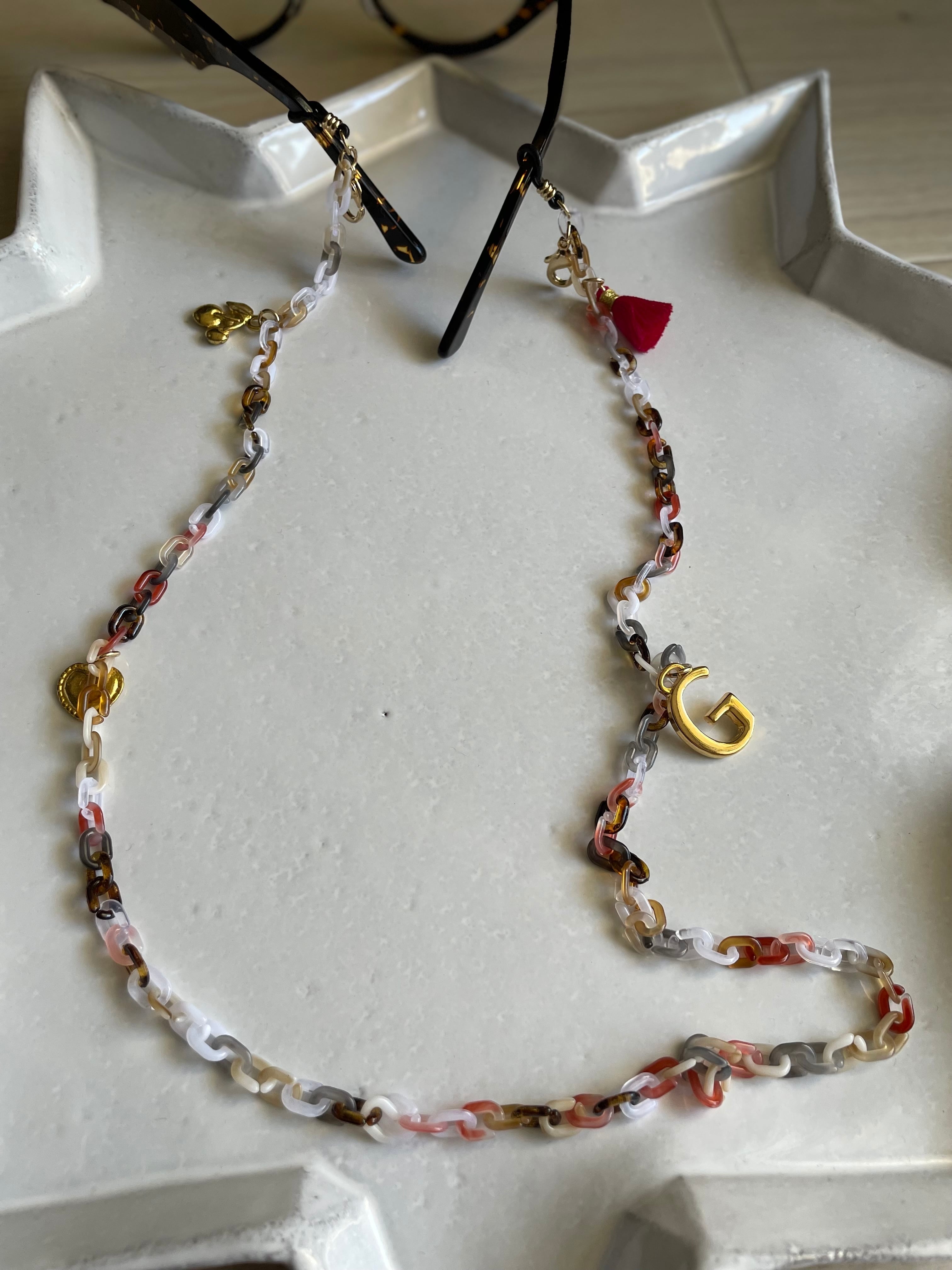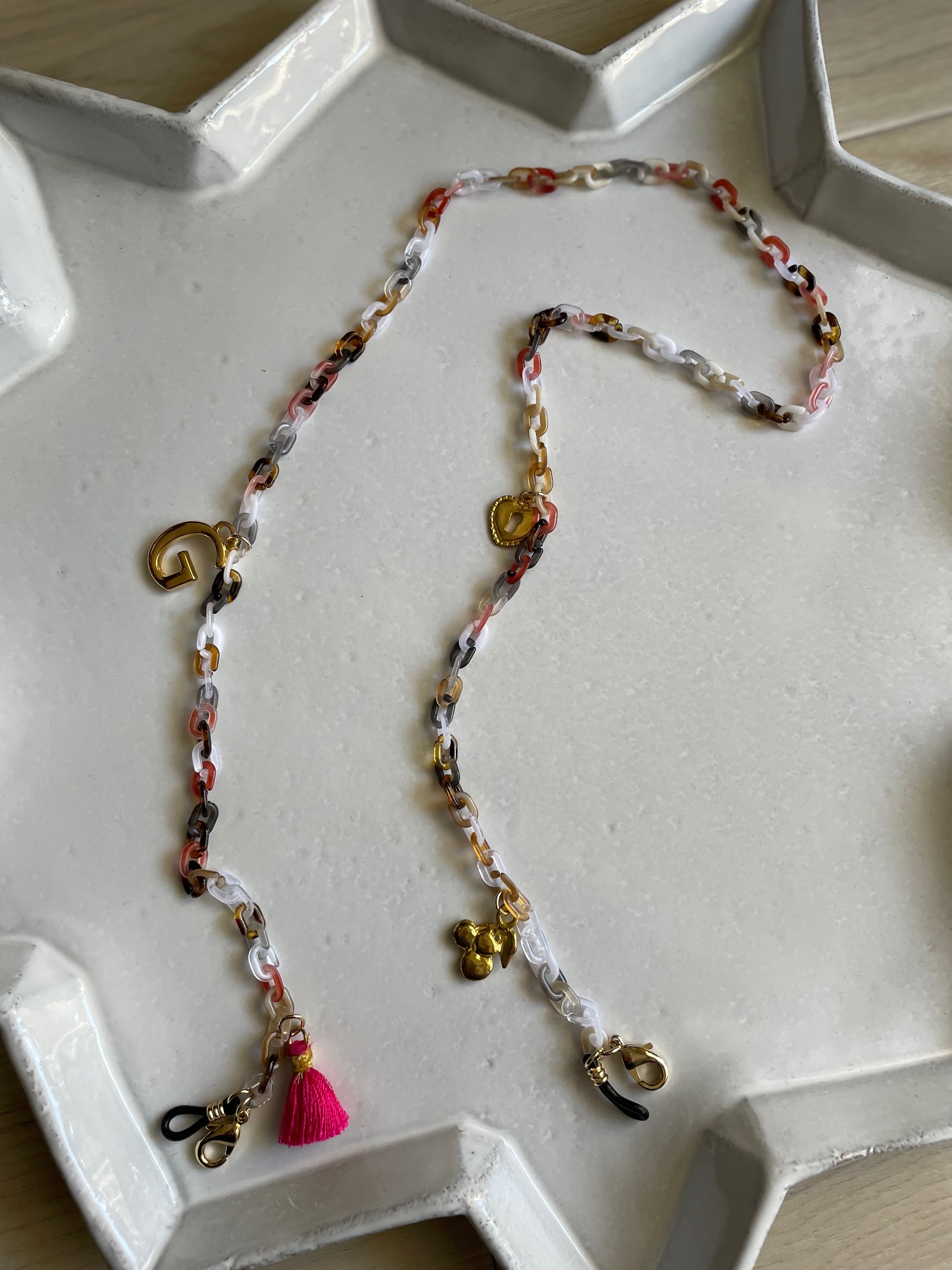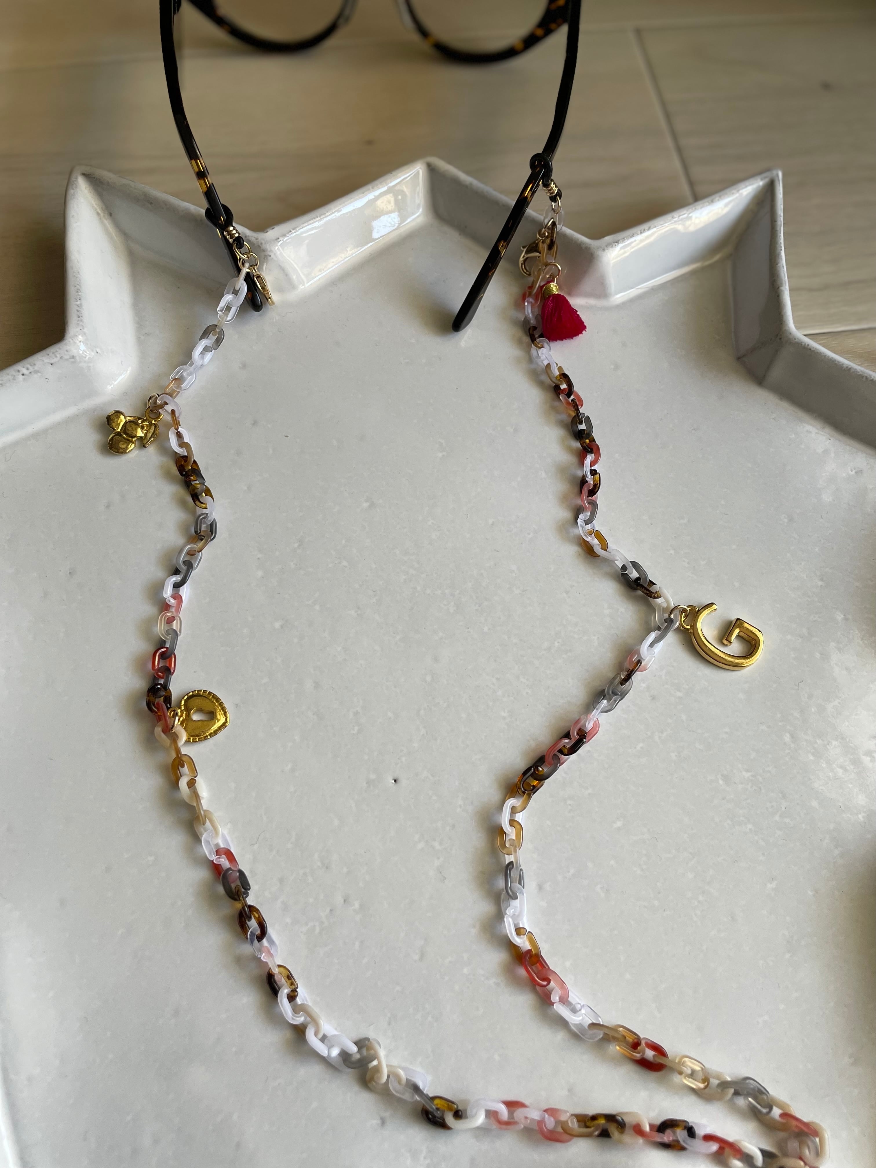 マーブルのアクリルチェーンにタッセルやクリスタルガラス、チャームを付けて、大人の遊び心あるメガネチェーンです。