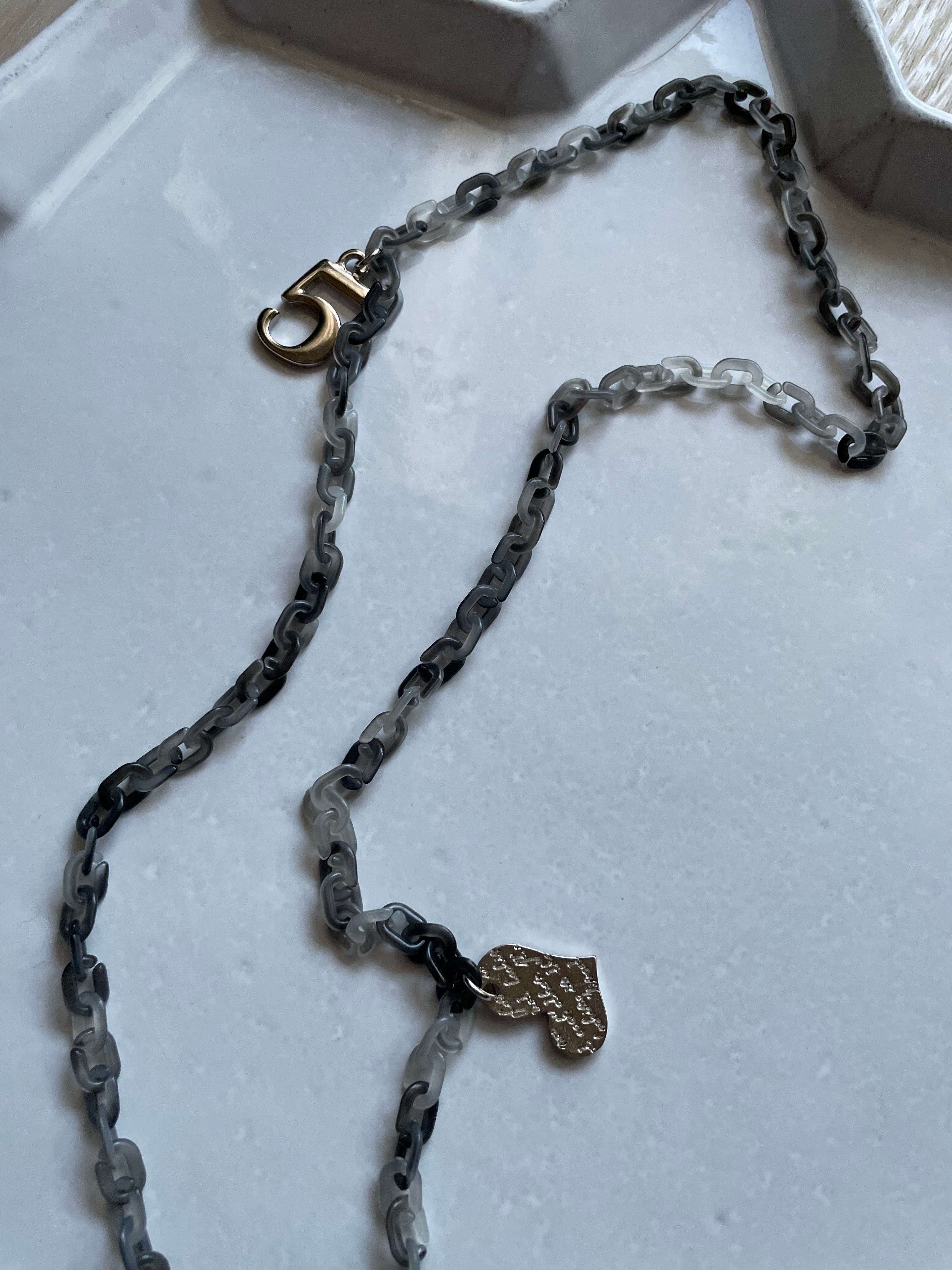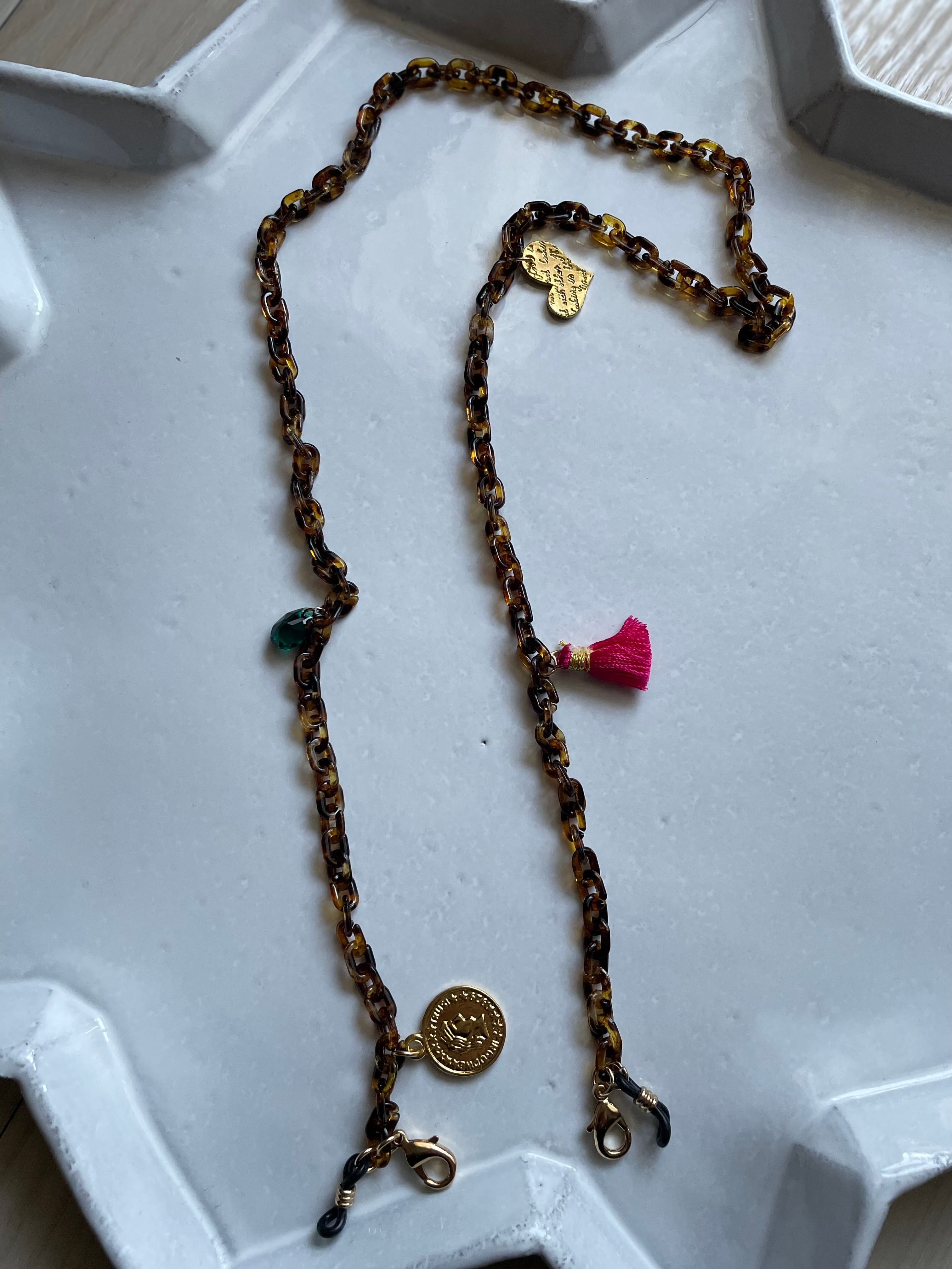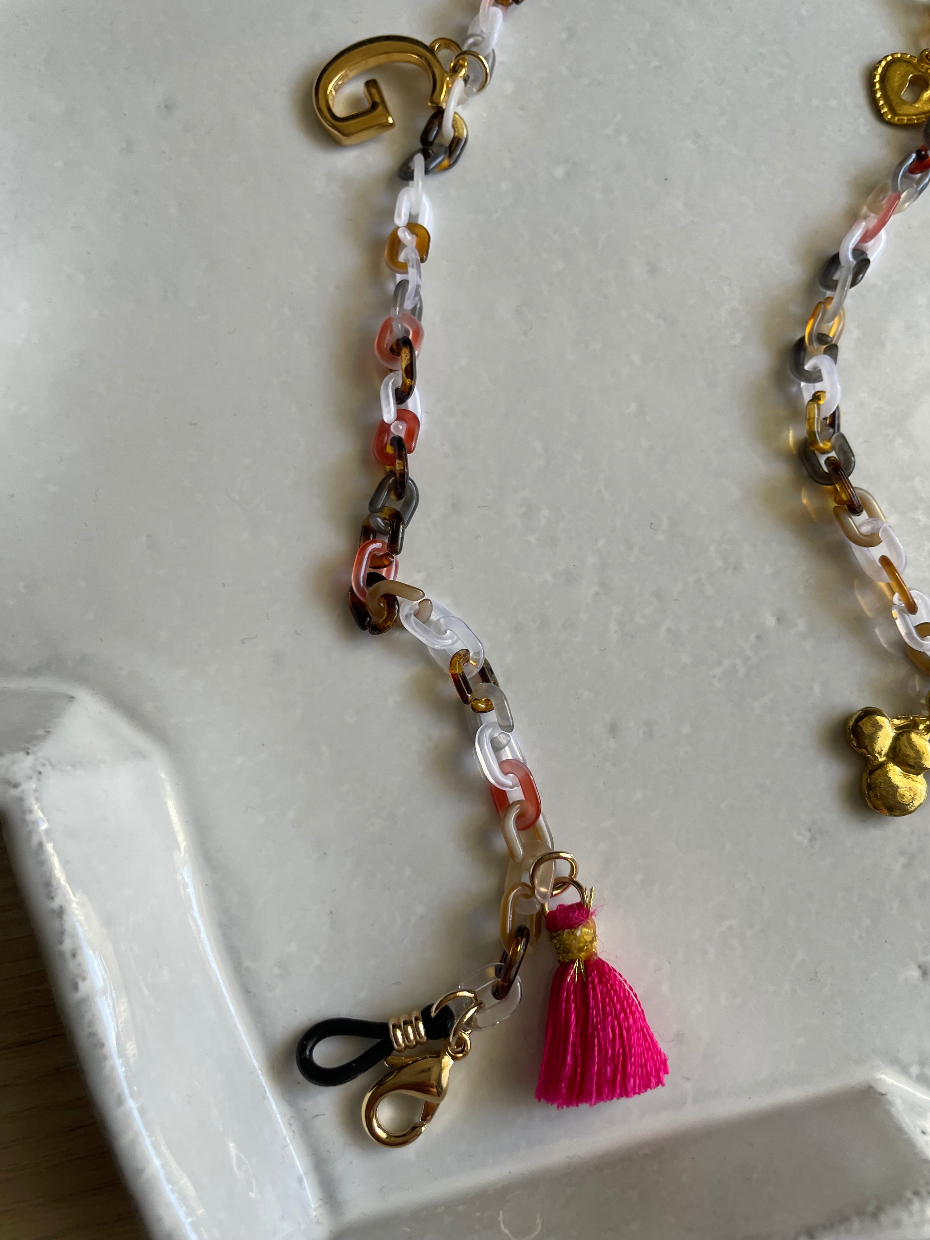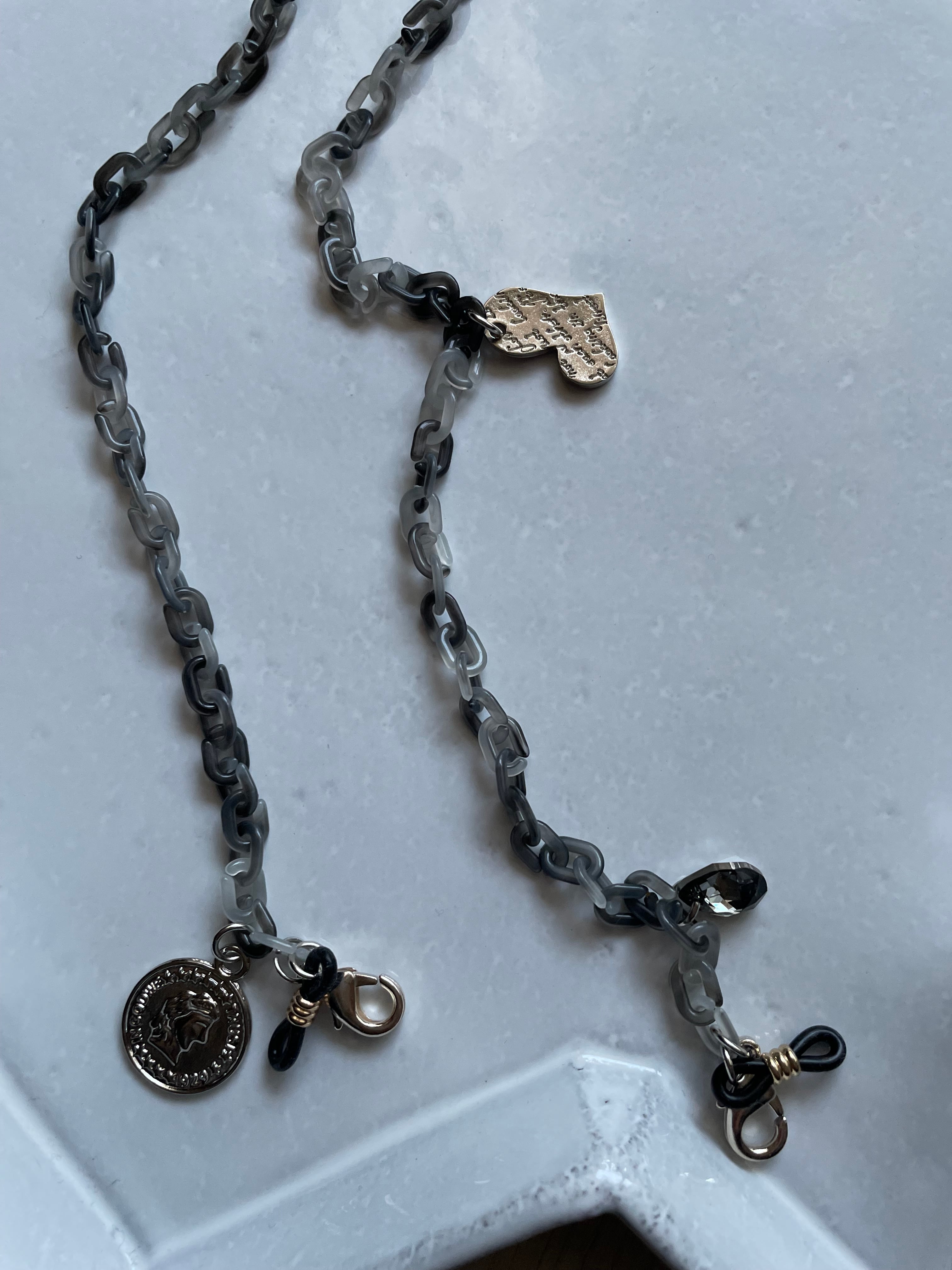 マーブルのアクリルチェーンにタッセルやクリスタルガラス、チャームを付けて、大人の遊び心あるメガネチェーンです。