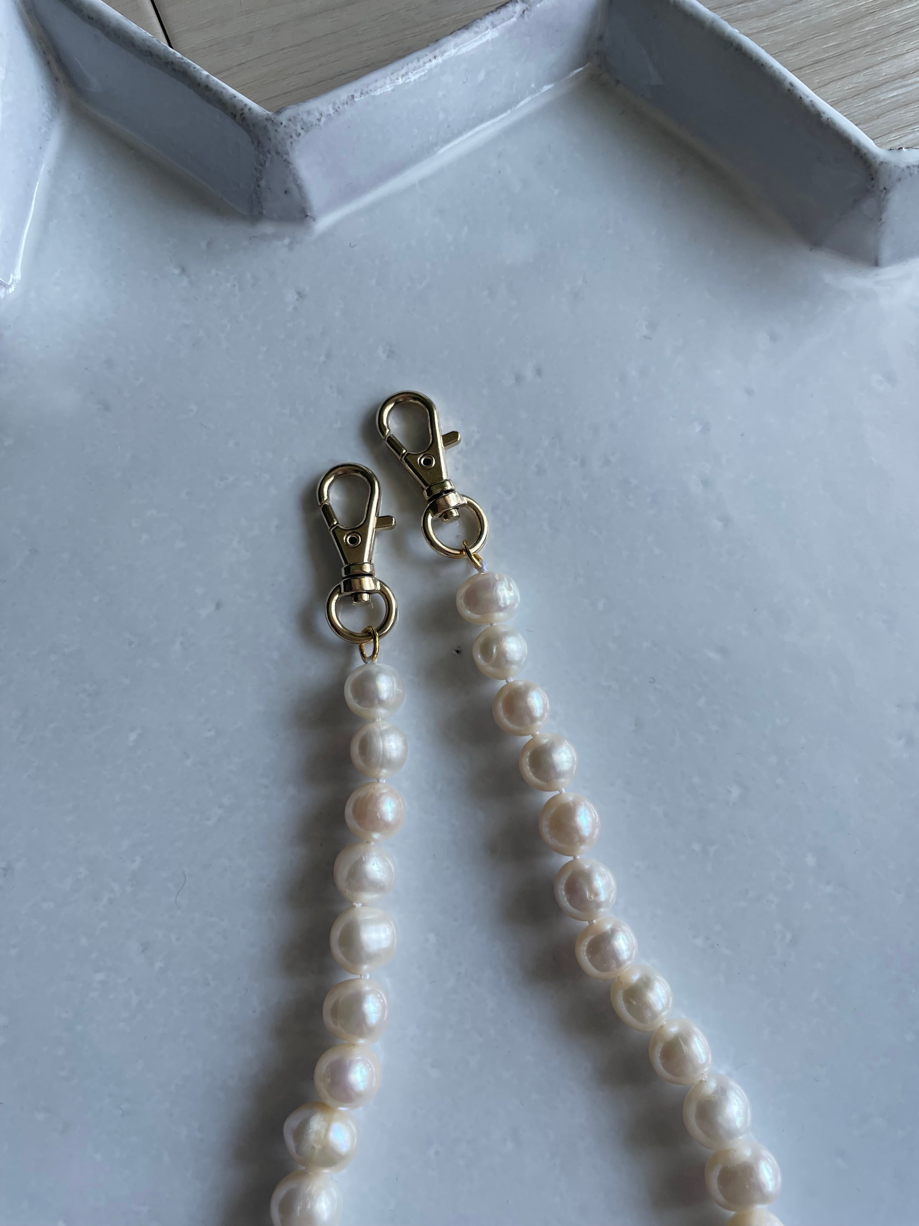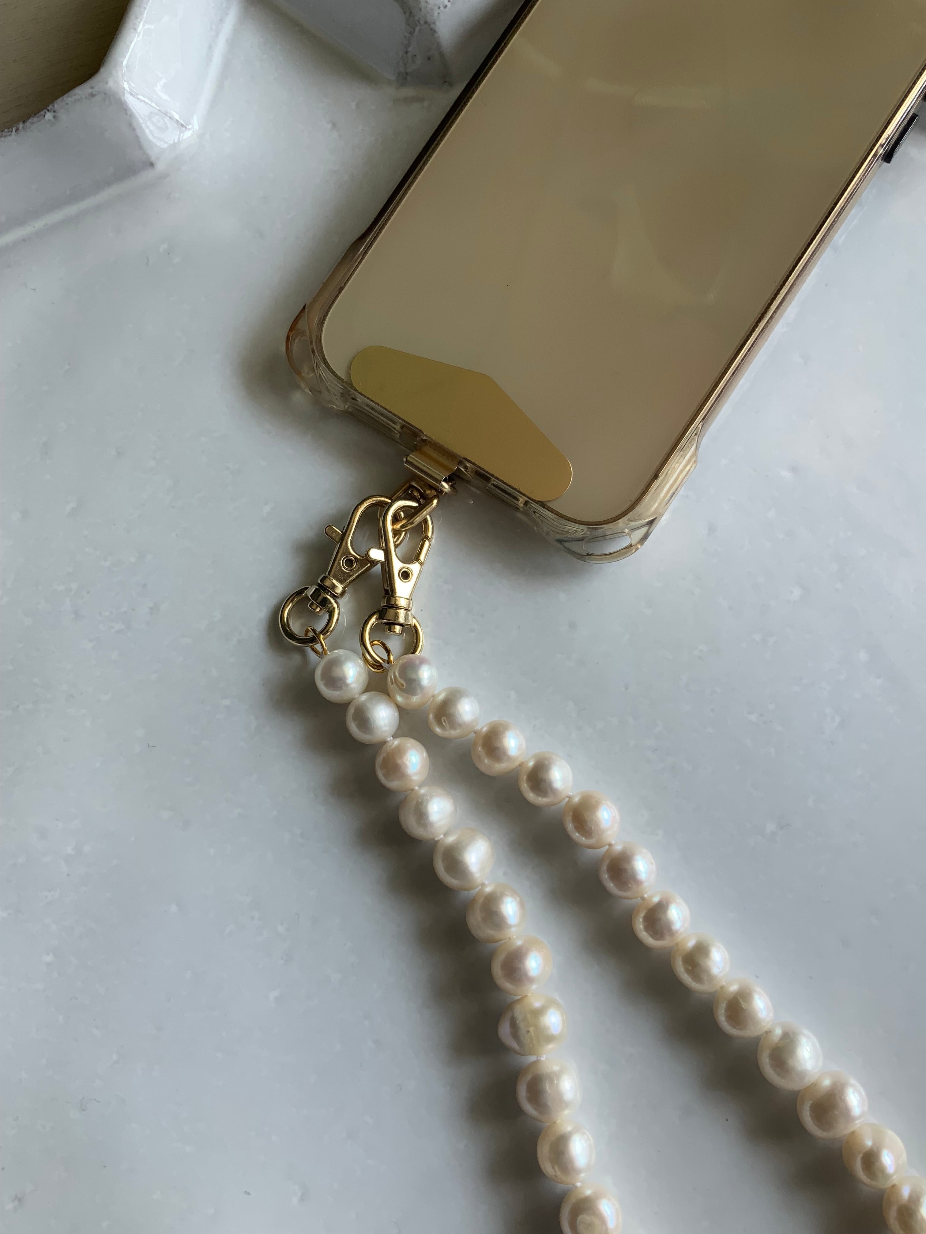 美しい大珠のパールを白糸で丁寧にオールノットで組み上げて仕上げているので強度も考えた本物のpearlのスマホストラップです。