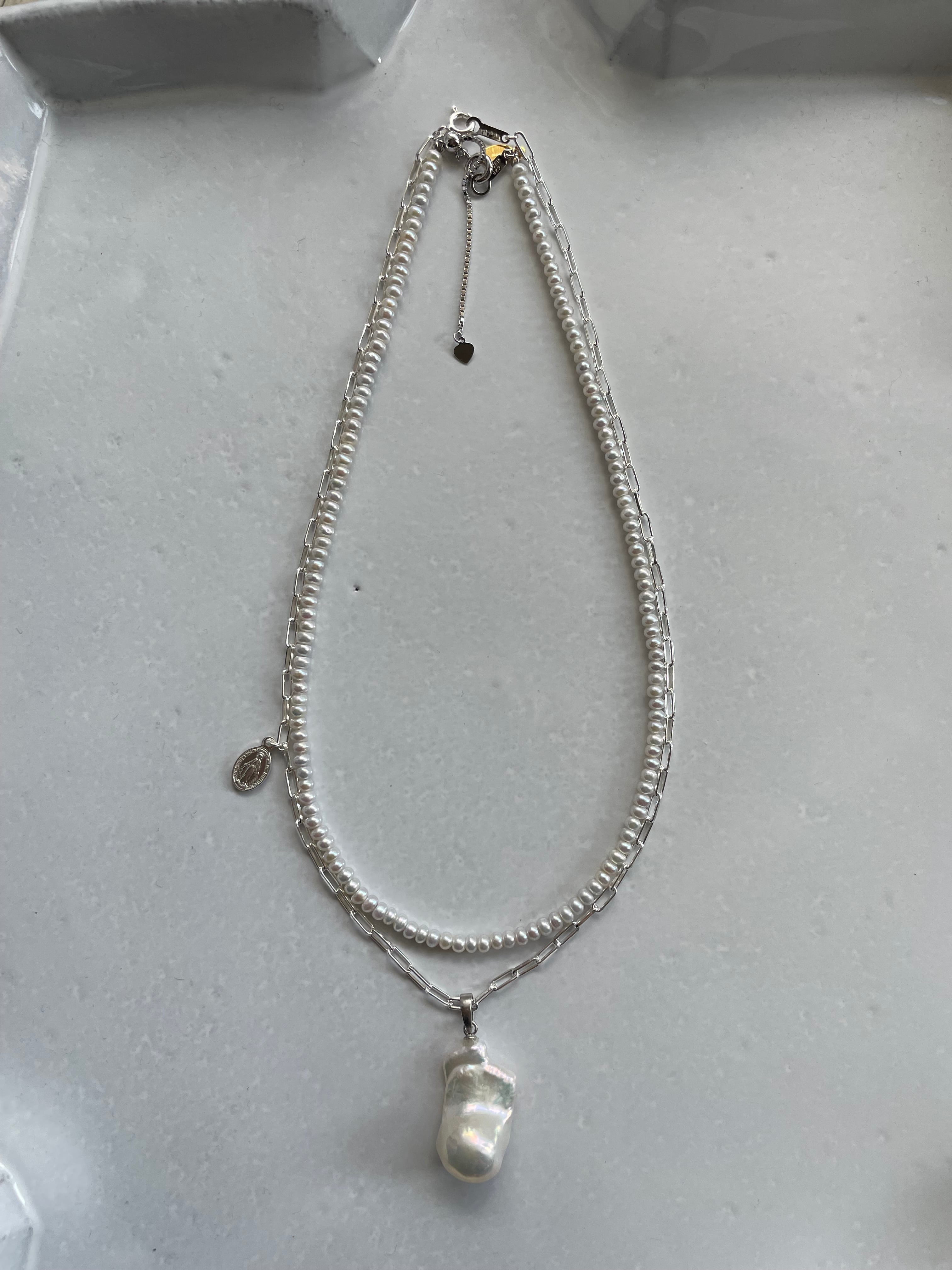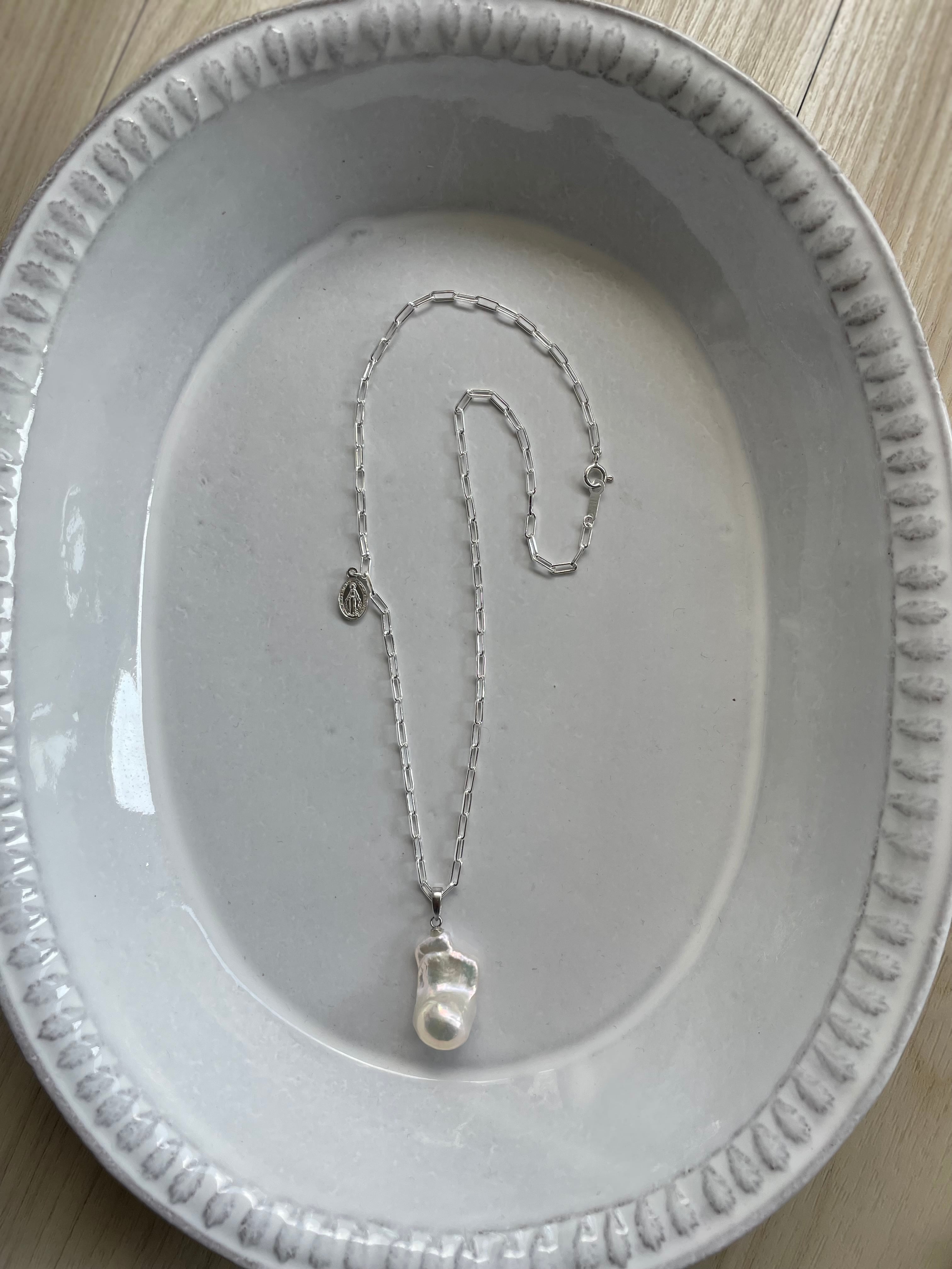 大人気のsilver925のchainに世界に一つの唯一無二のオイスター型バロックパールとsilverメダイチャームをおつけしたネックレスです。