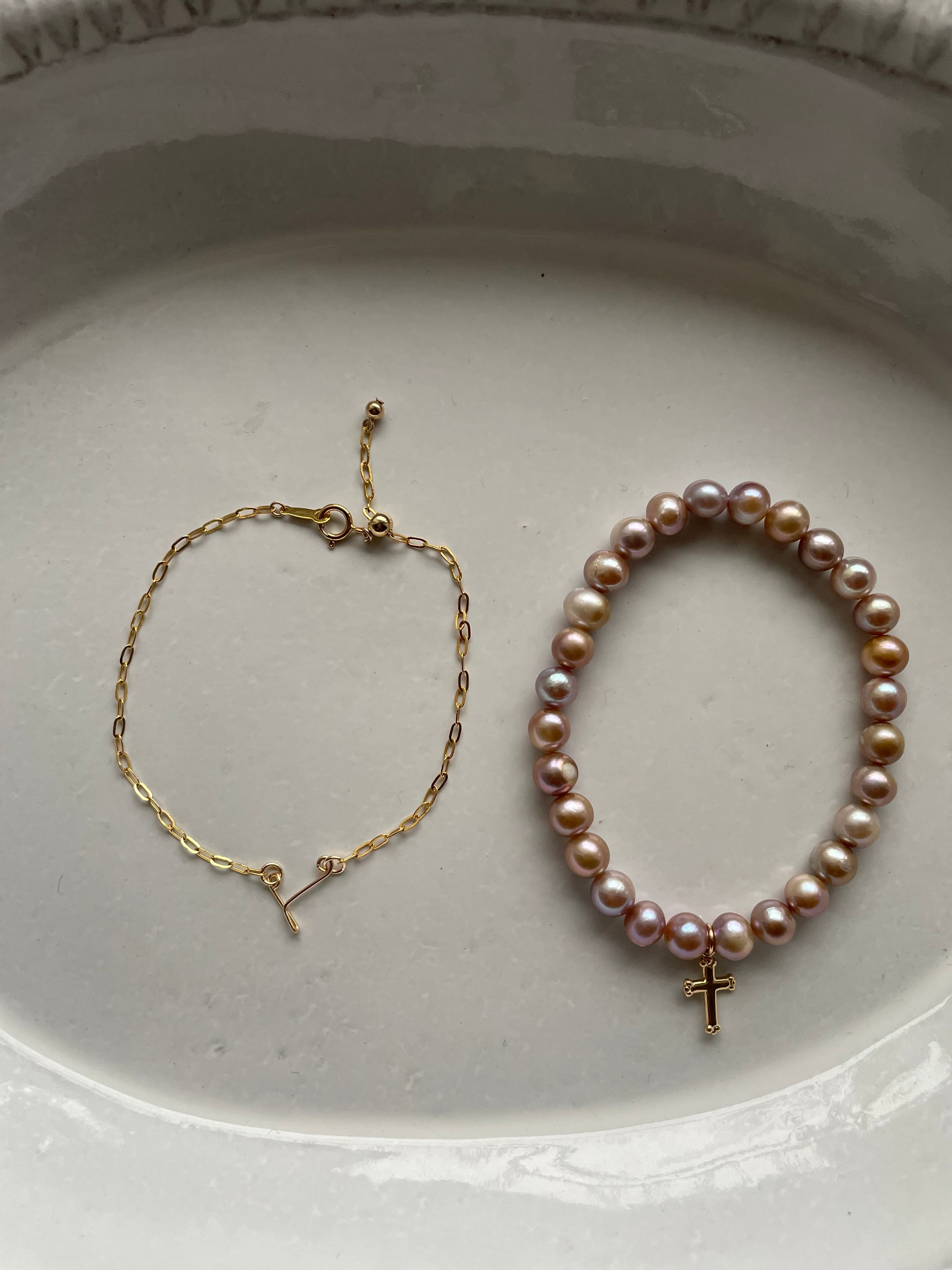 パールブレスレットには14KGFクロスチャーム付きです。