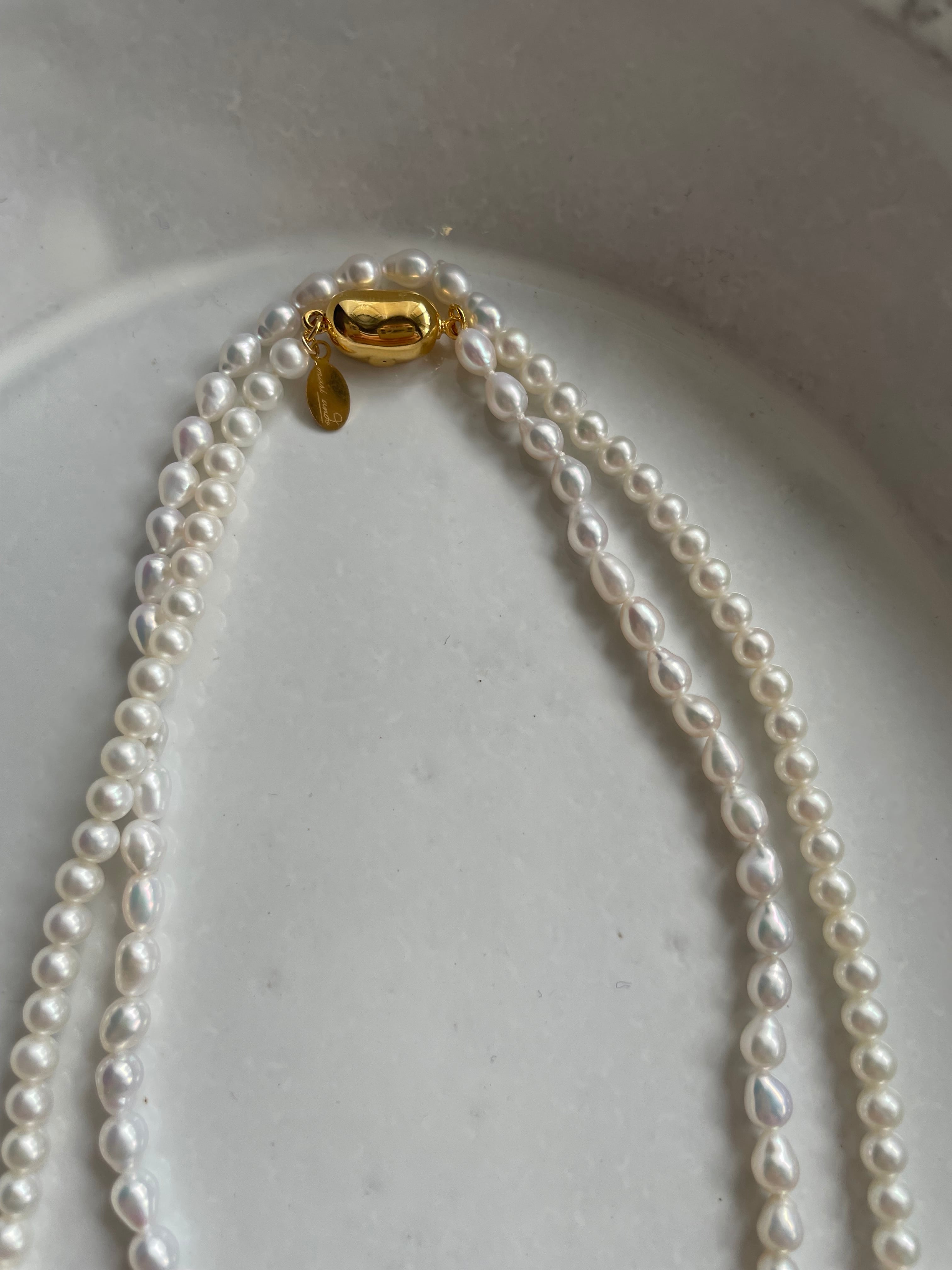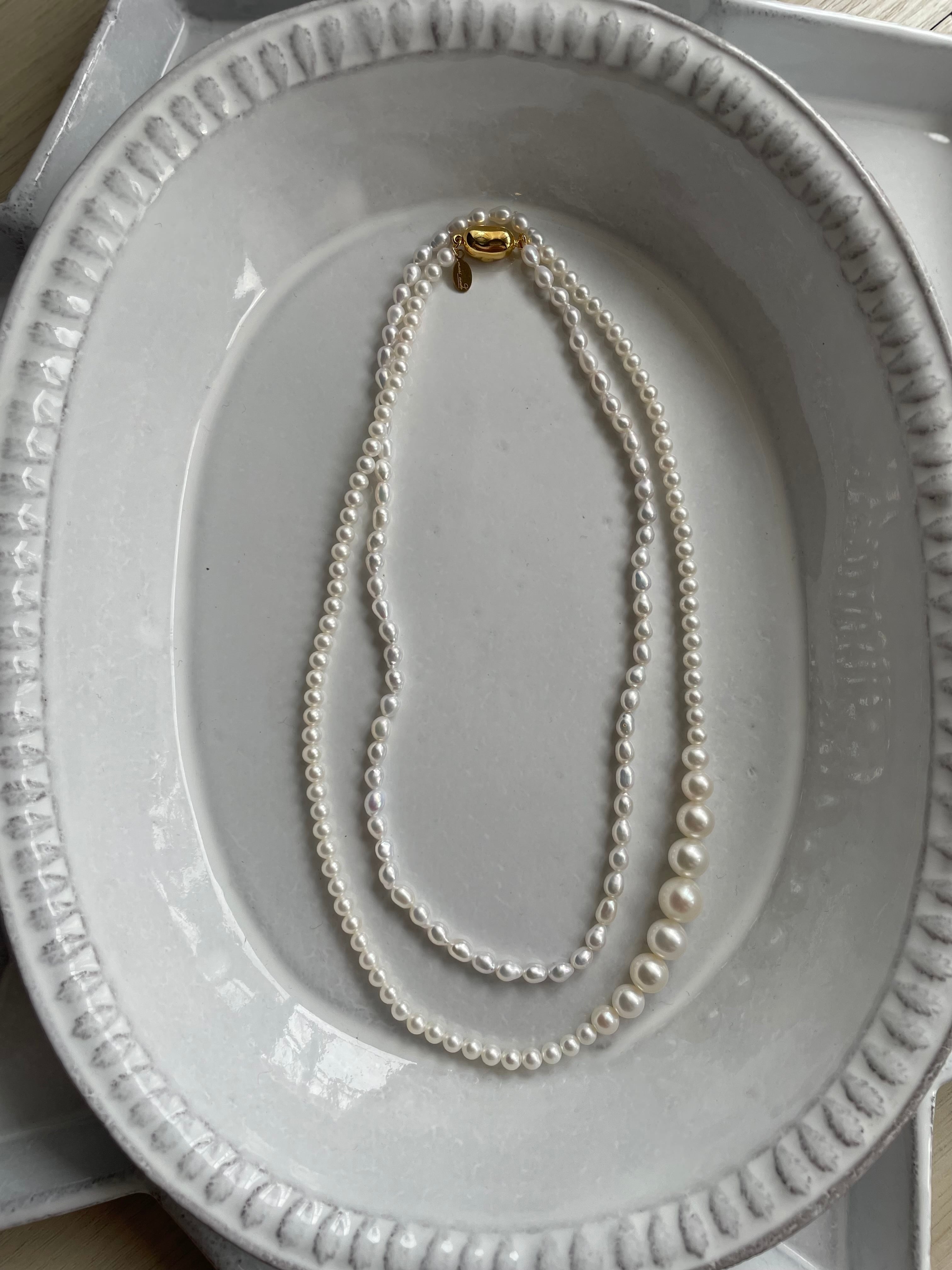 美しいテリと艶のgradationのパールはロングで一本でも2本にしても美しいグラデーションになるように組み上げたネックレスです。