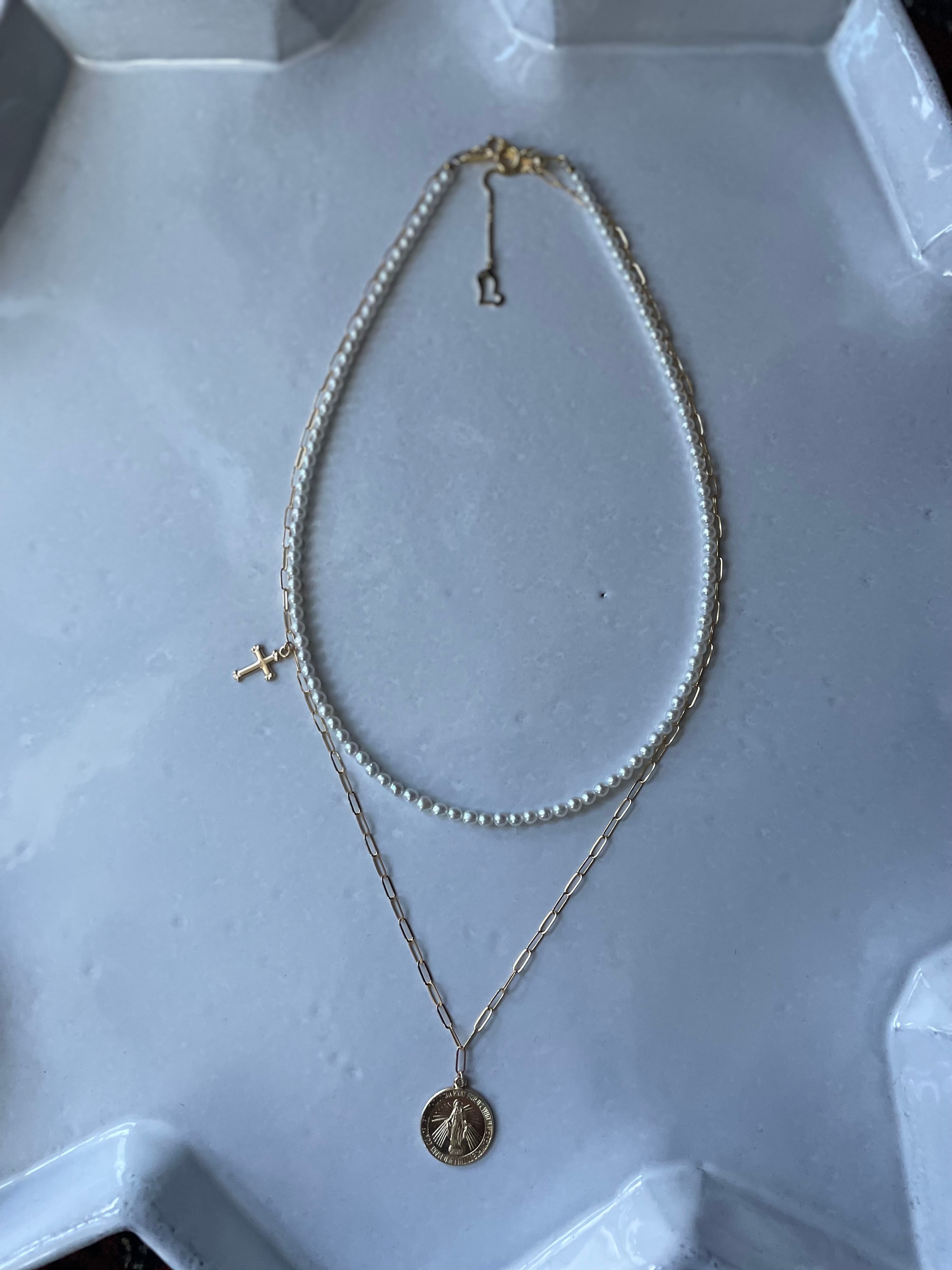 シンプルな pearl一連のネックレスと合わせて重ね付けもおすすめです。