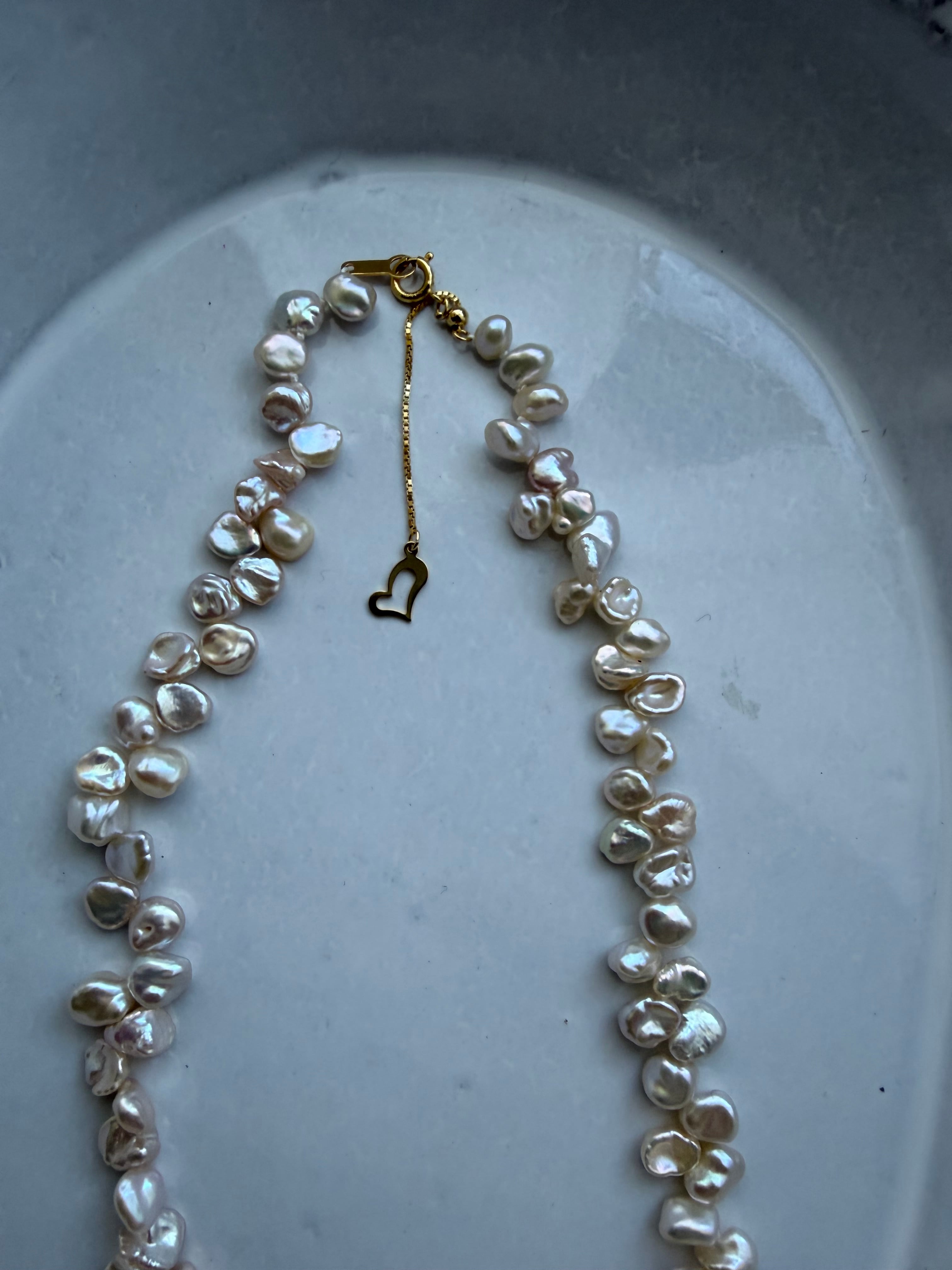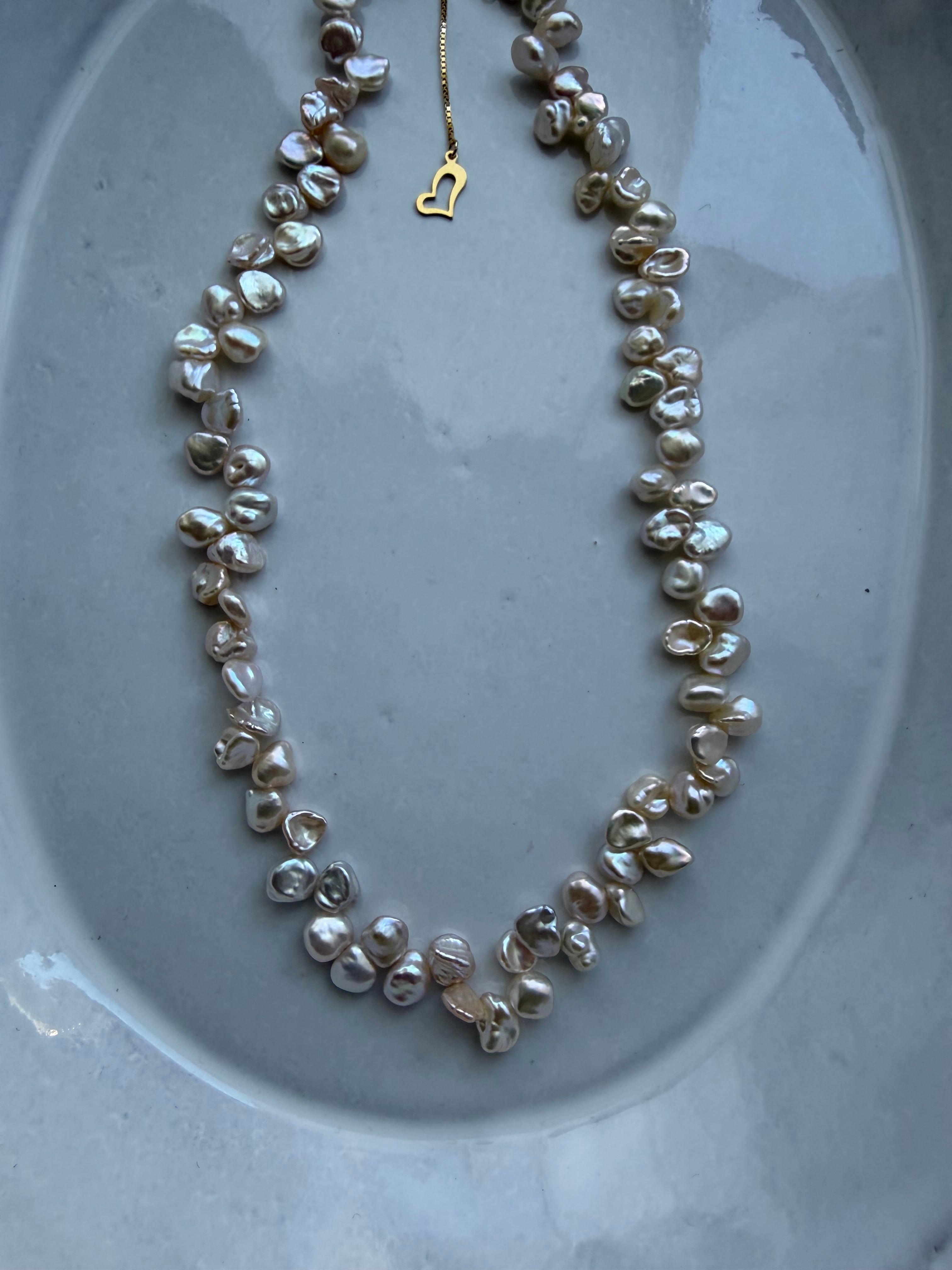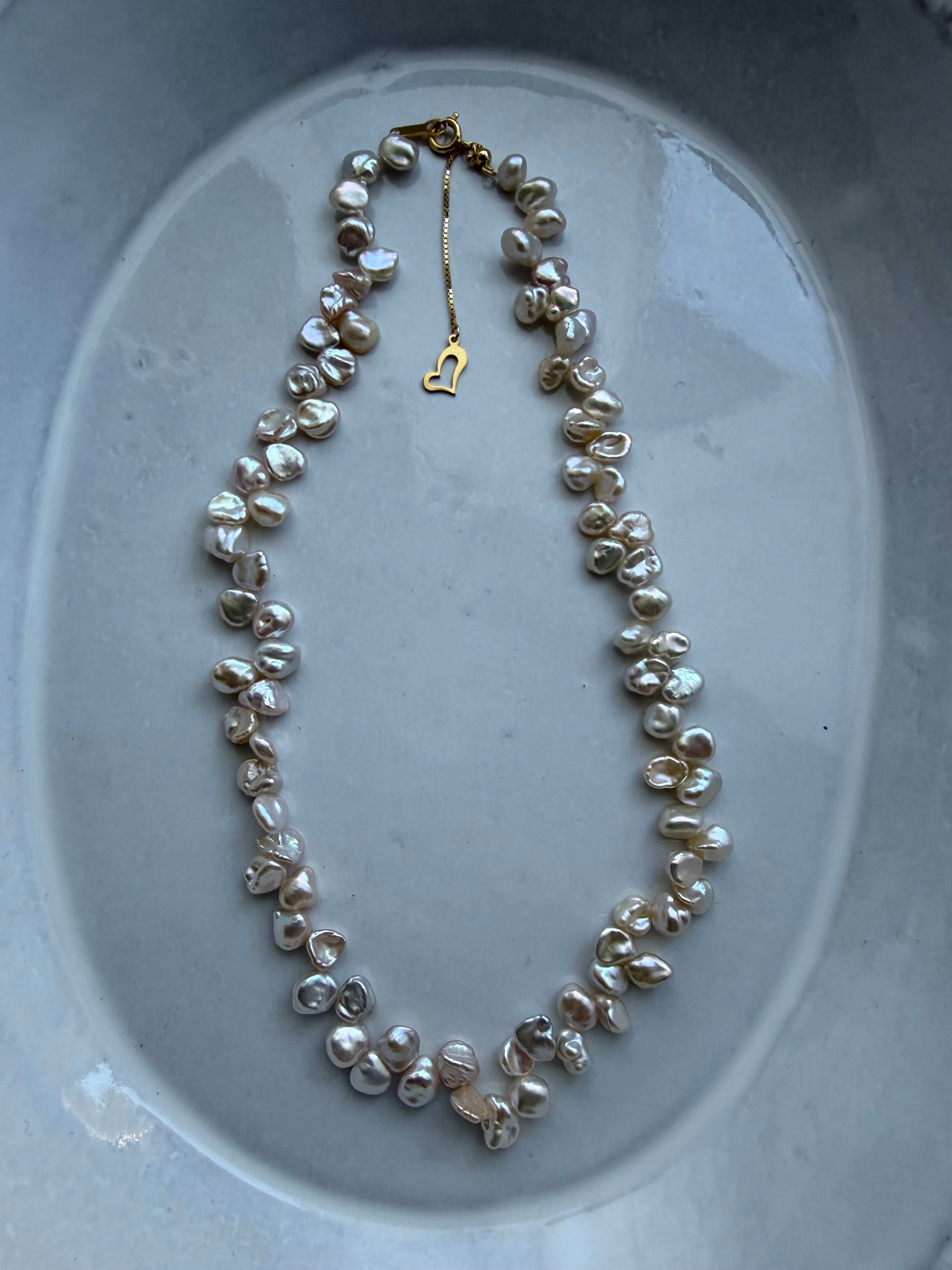 自然が描く、不揃いな美しさのひとつひとつ形が異なる「ケシ風」の淡水パールを贅沢に連ねたネックレスです。