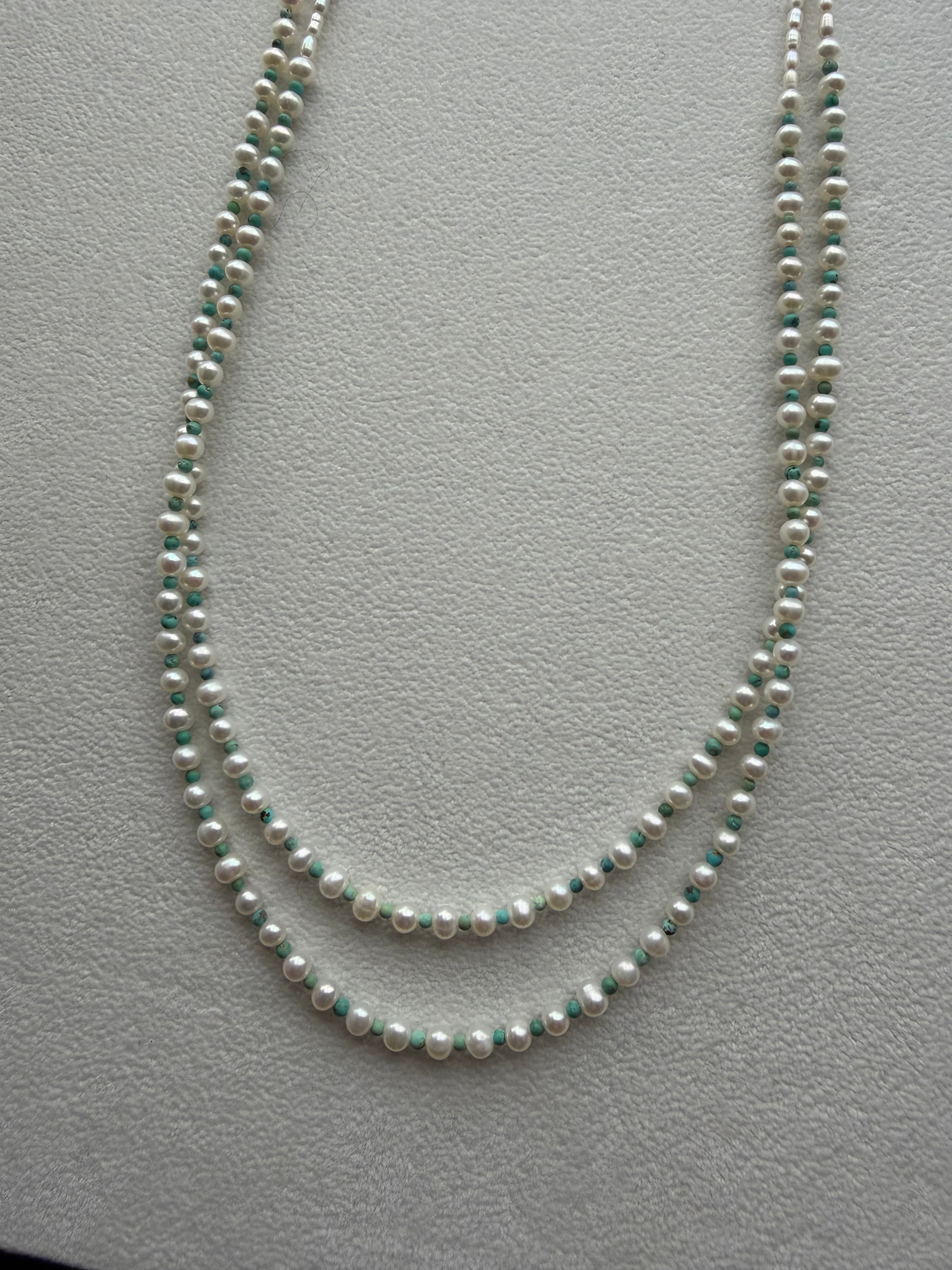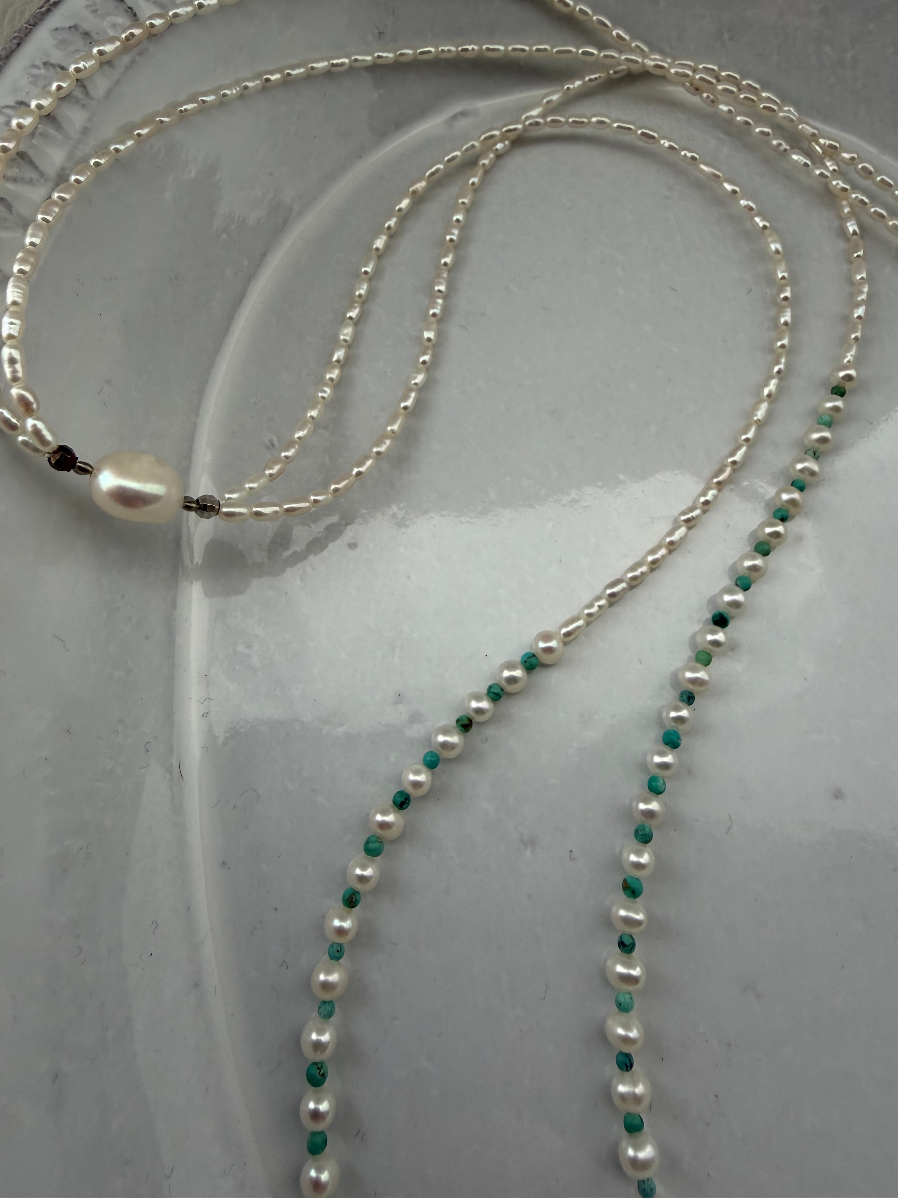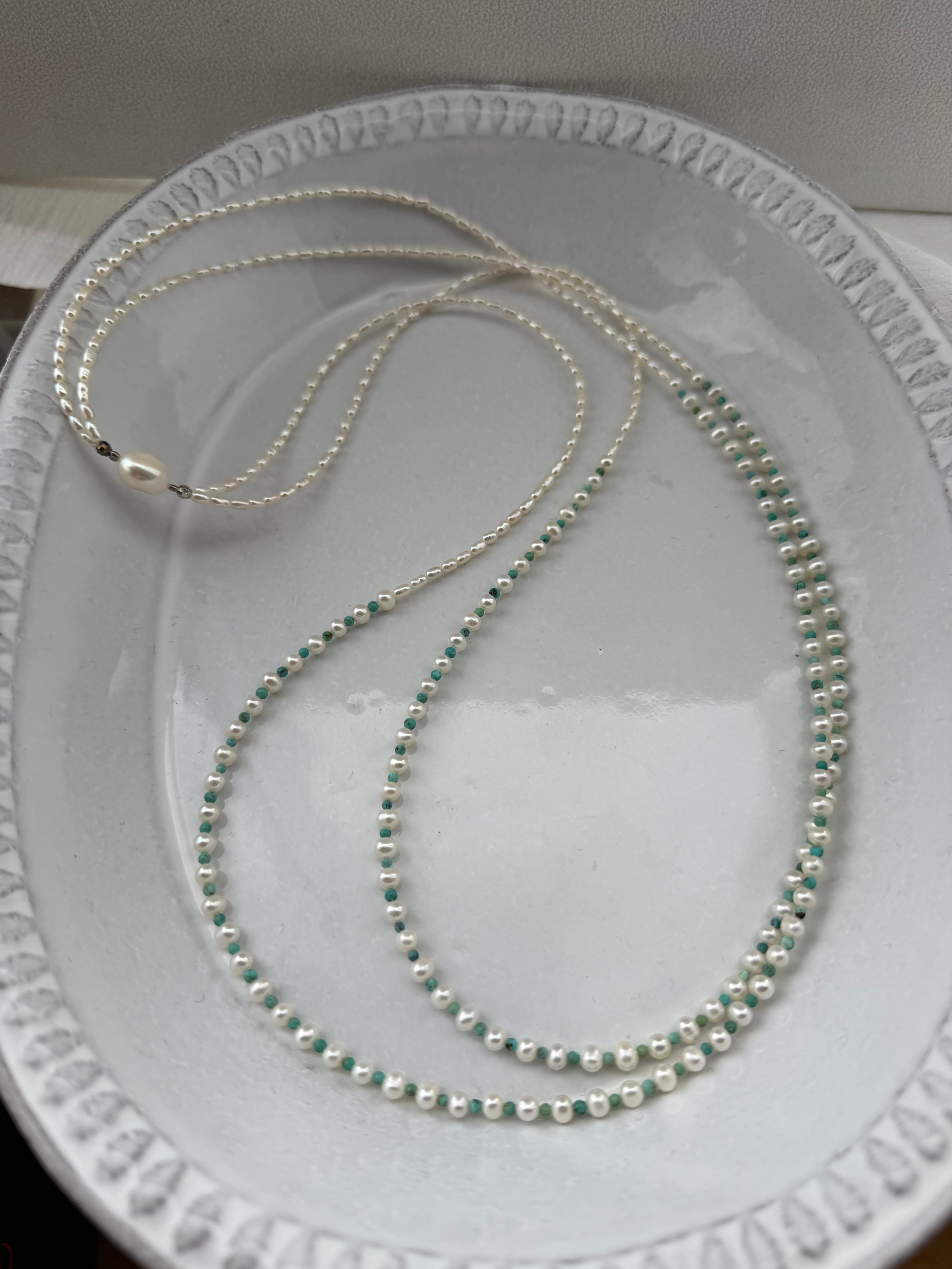 繊細な輝きを放つ「baby pearl」と、鮮やかな「ターコイズ」を贅沢にmixしたロングネックレス。