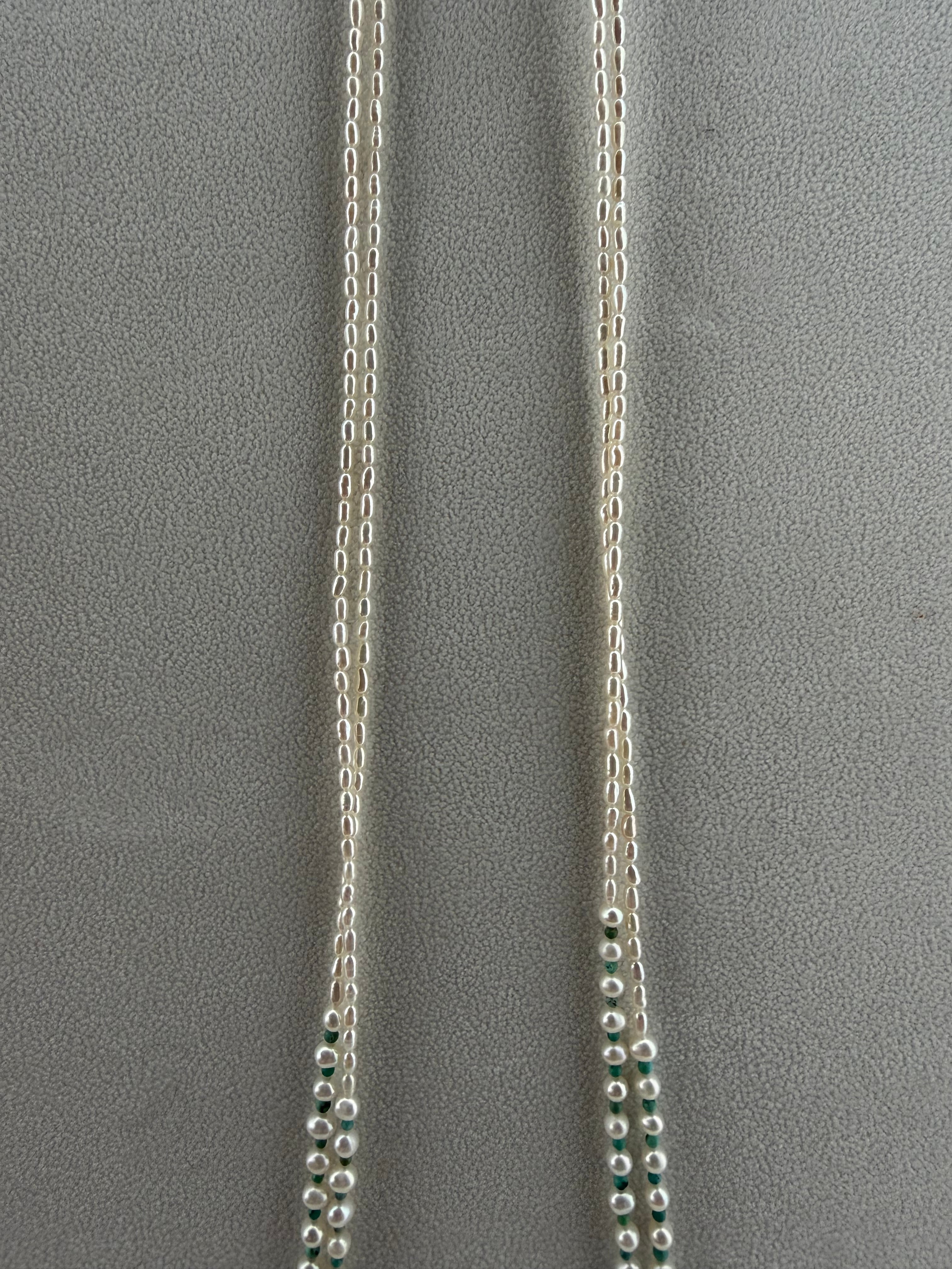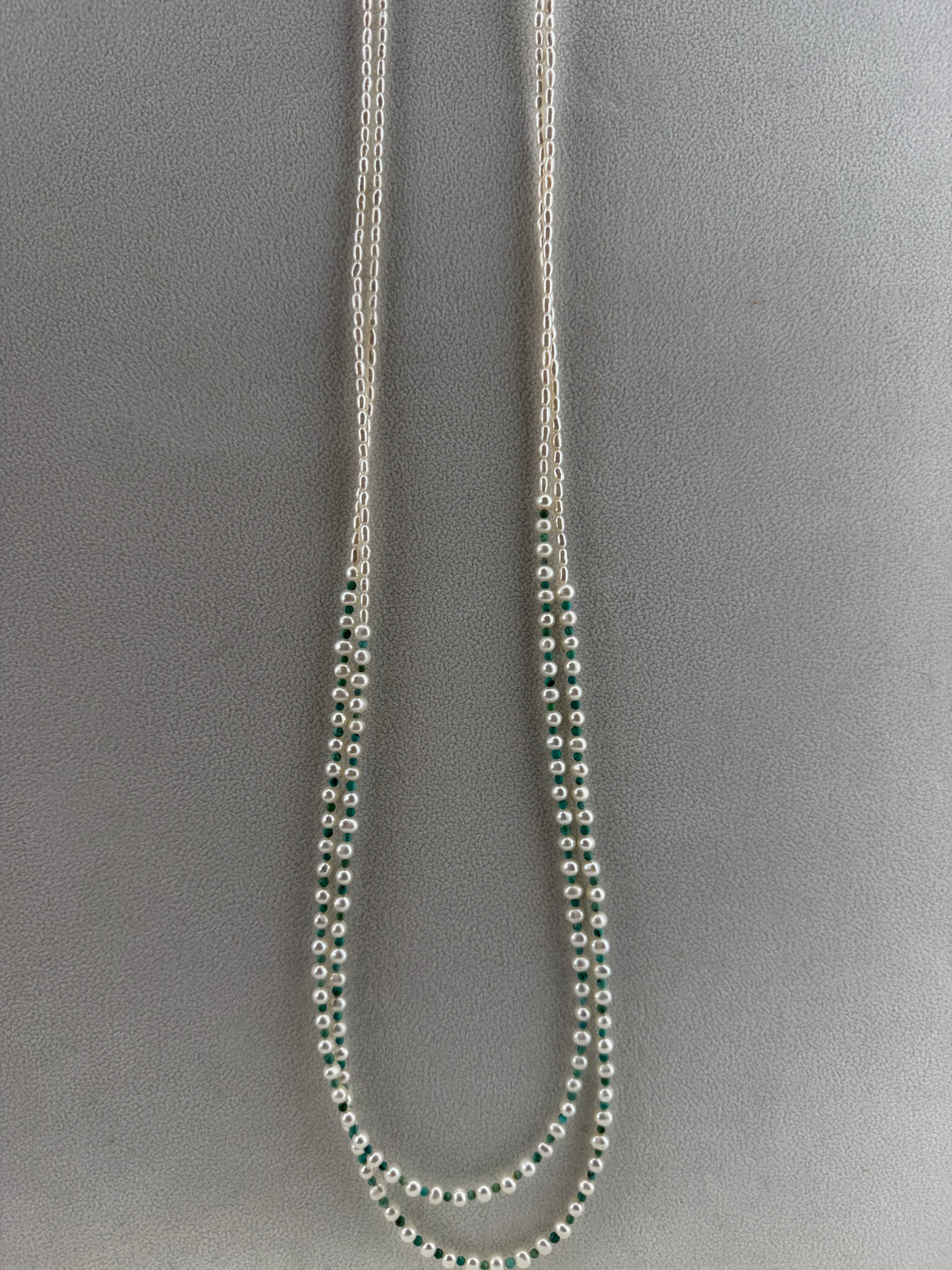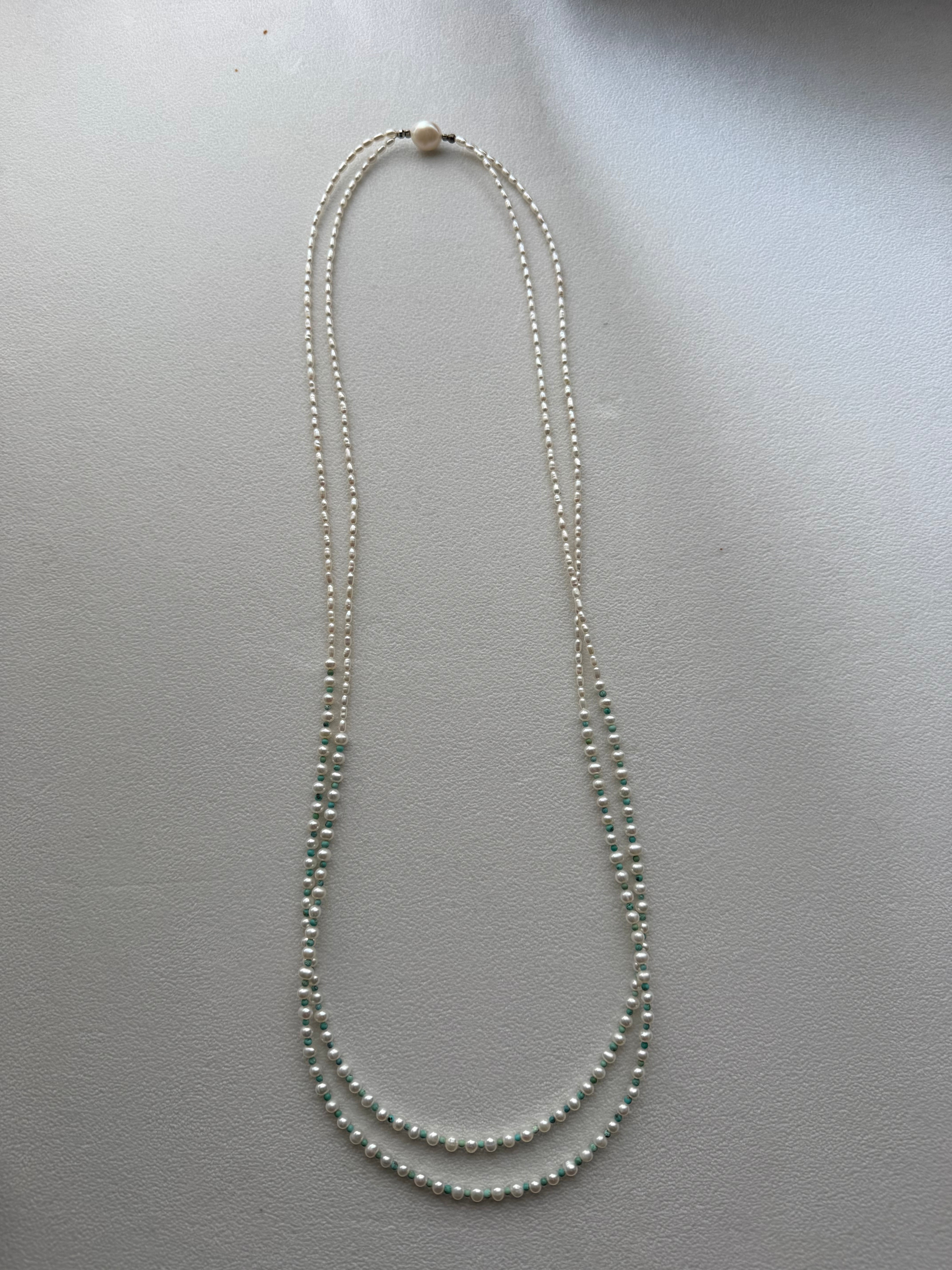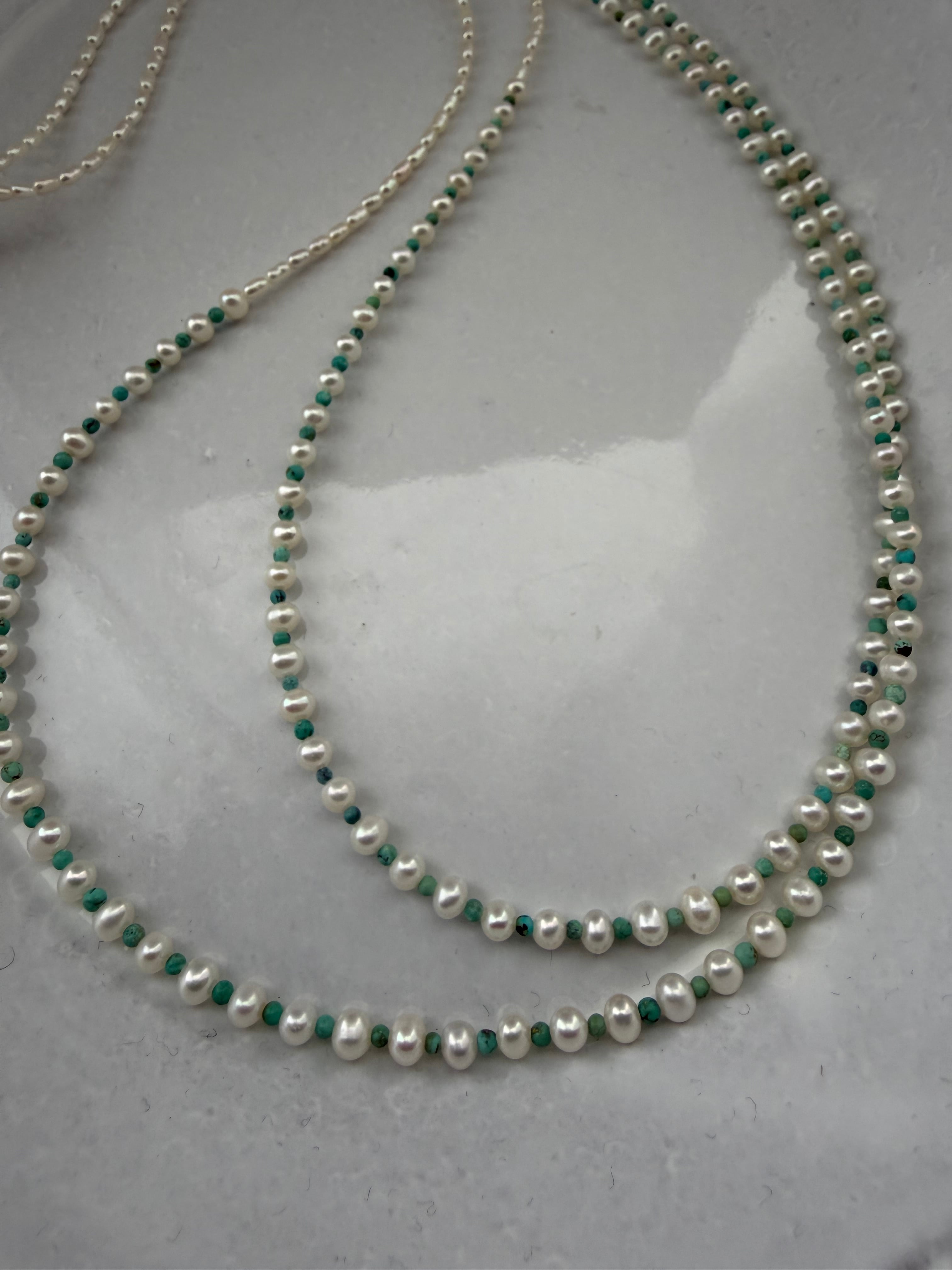 繊細な輝きを放つ「baby pearl」と、鮮やかな「ターコイズ」を贅沢にmixしたロングネックレス。