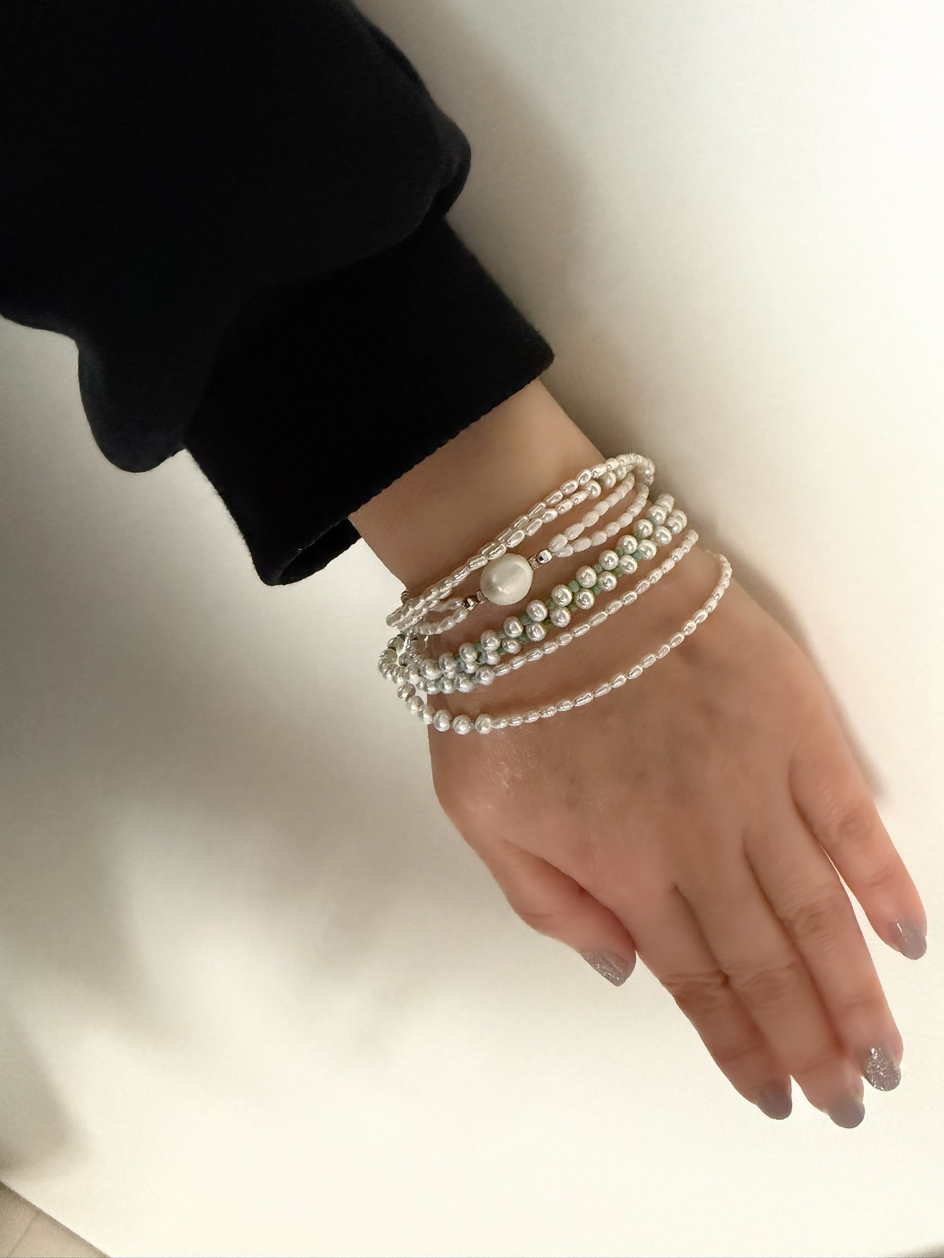 • 希少なベビーパールの2サイズ使い: 約2.0〜2.5mmと、少し大きめの約3.5〜4.0mmという2種類のサイズをミックス。リズム感のあるシルエットが生まれます。