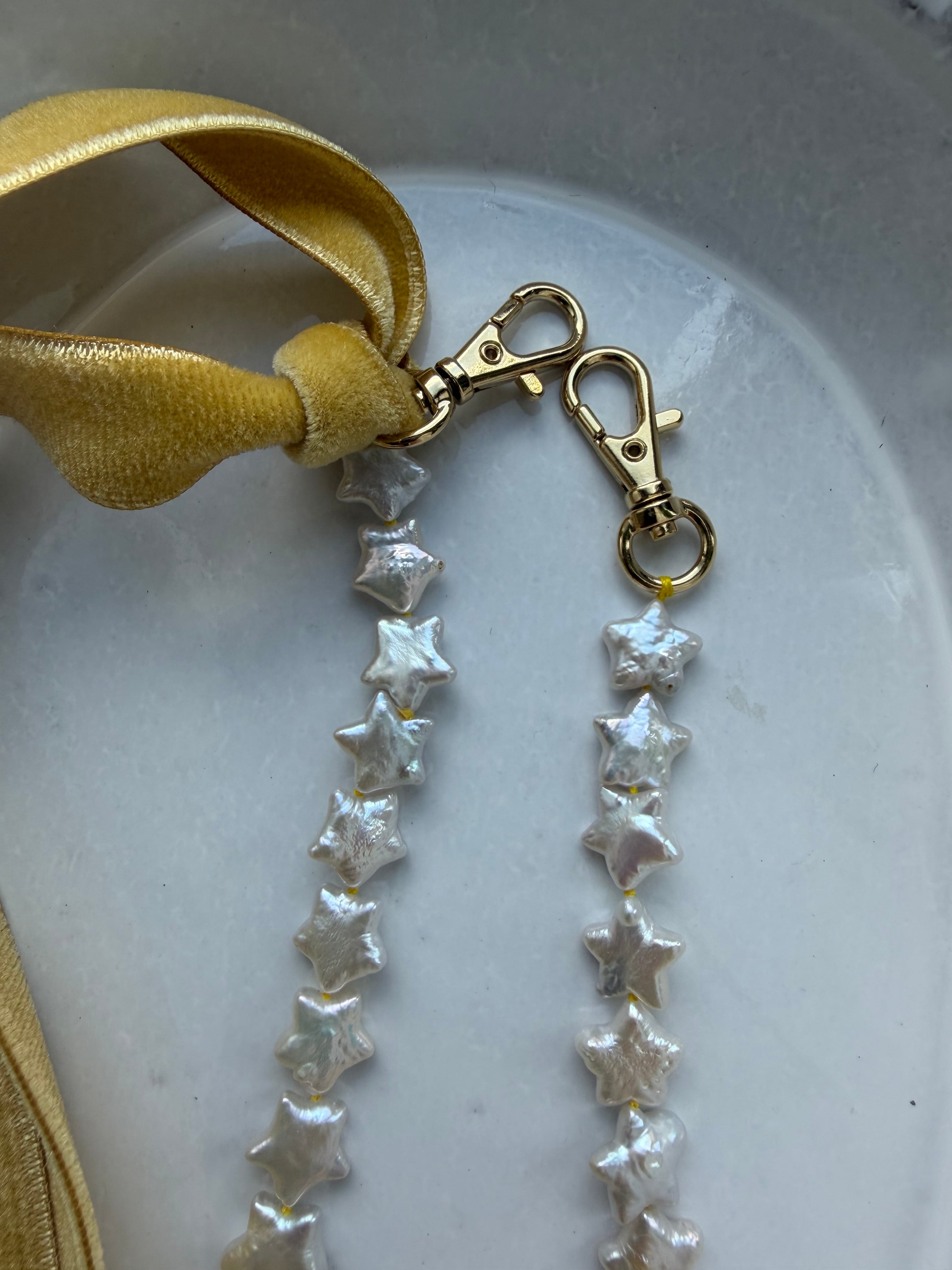 • 素材: 淡水真珠(星型)、別珍リボン、糸(イエロー)、合金(ゴールドカラーメッキ)(シルバーカラーメッキ)