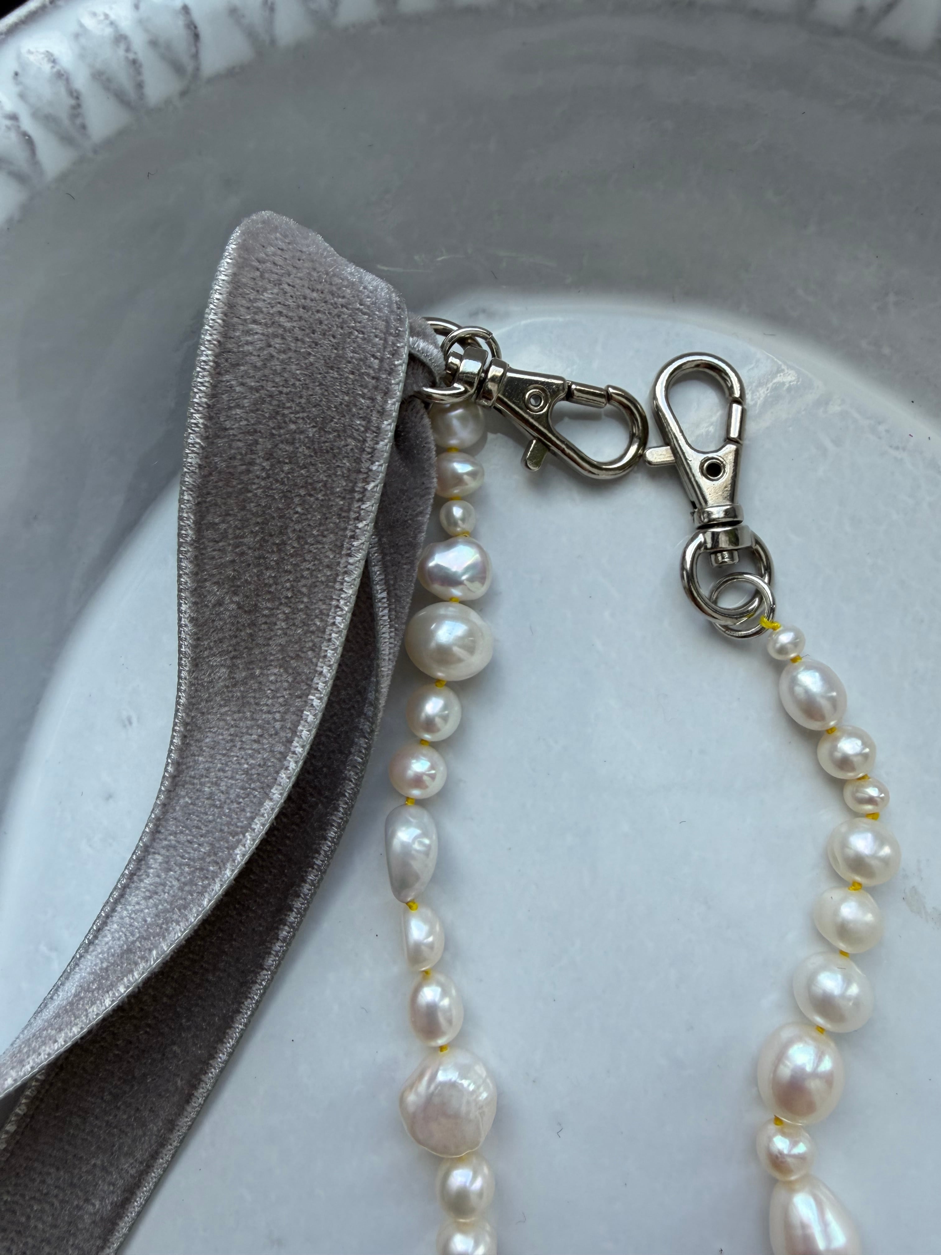 仕上げには、パールの白さを更に柔らかく見せてくれる淡いグレーのベルベットリボンを添えました。