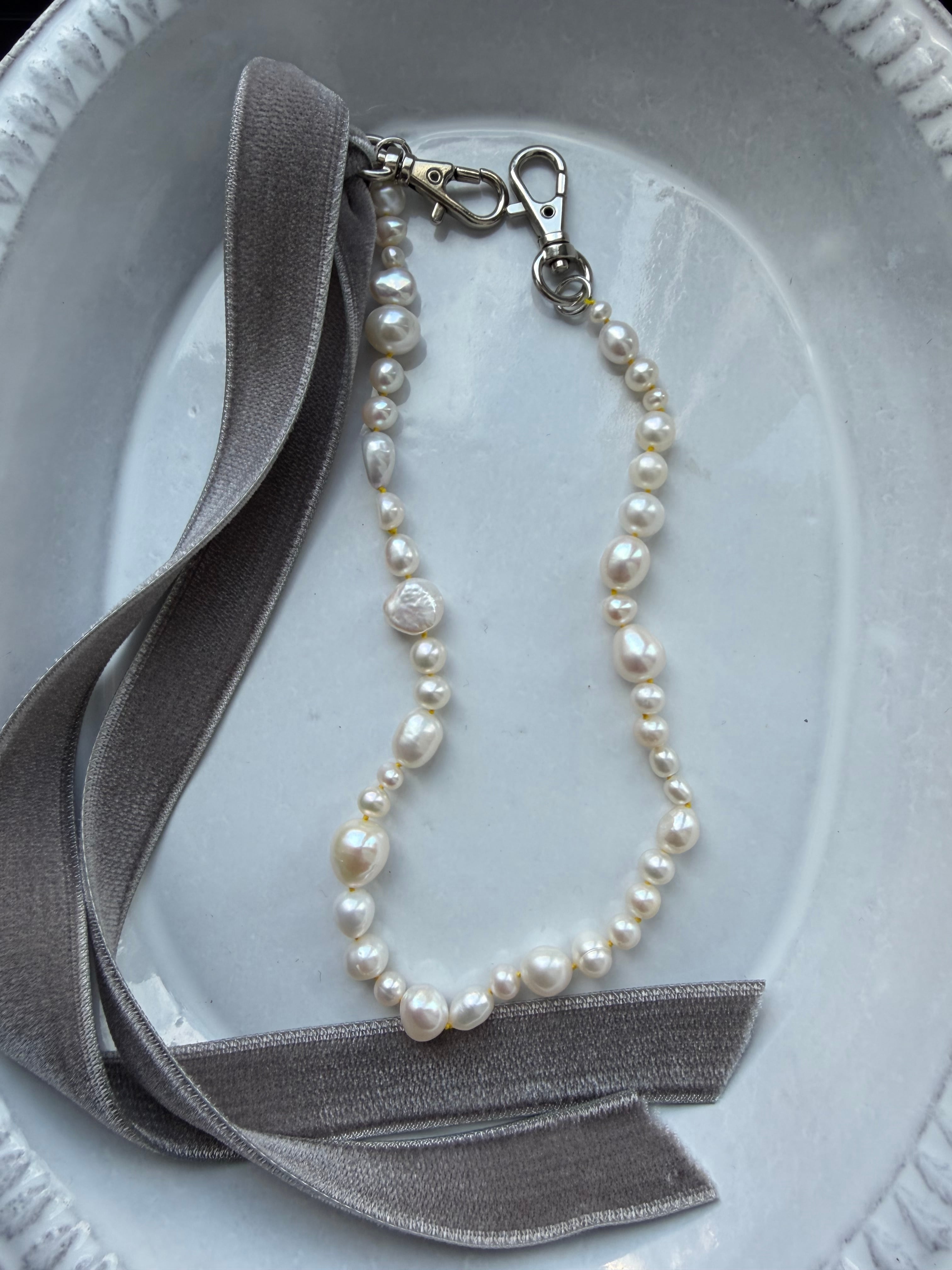 • Bag Charm: スマホだけでなく、バッグのハンドルに付けてチャームとしても。ランダムなパールの粒が揺れるたび、印象的な手元を作ります。