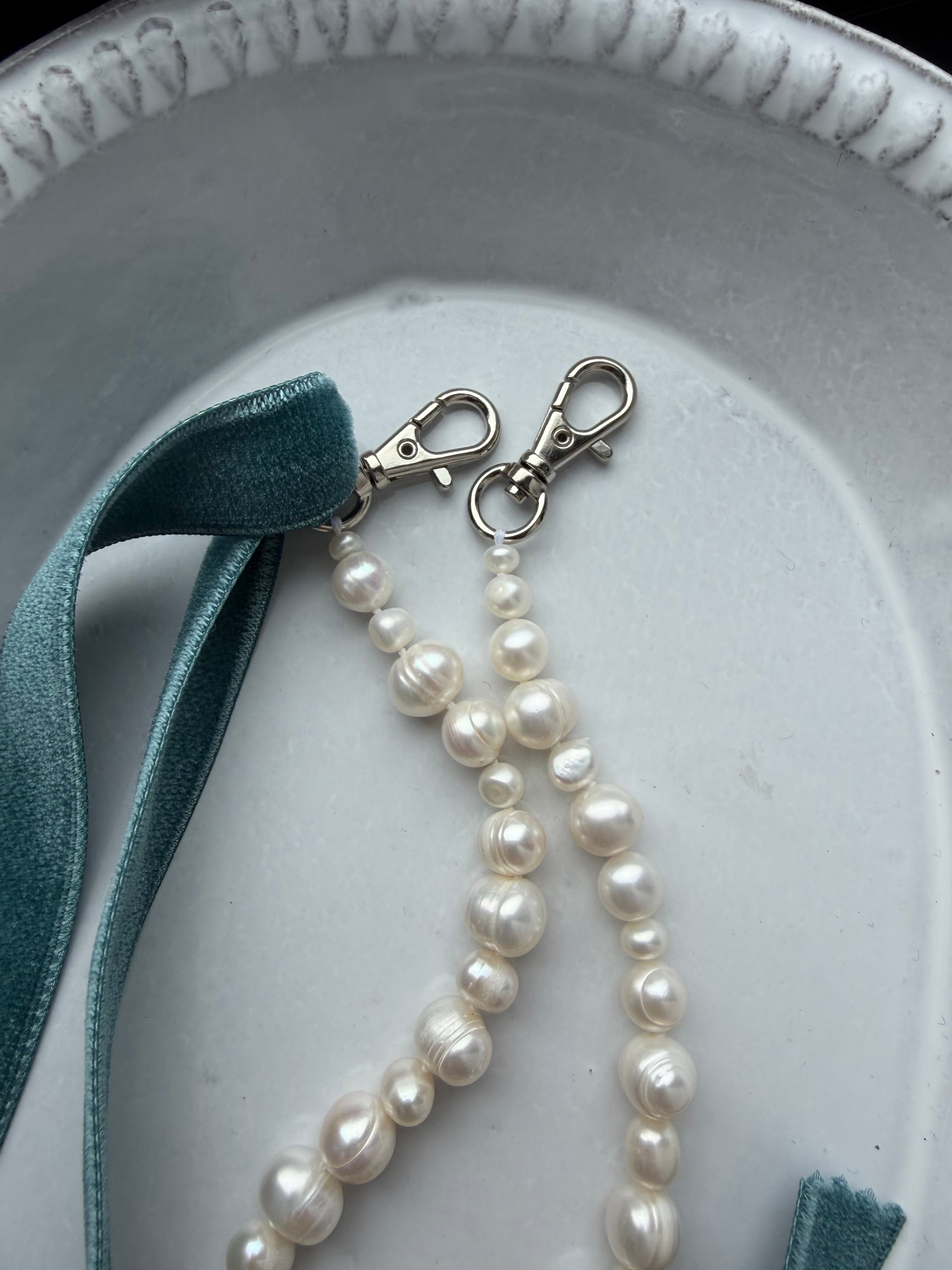 • 素材: 淡水pearl(ホワイト)、ベルベットリボン(ライトブルー)、糸(ホワイト)、金具(シルバーカラー)