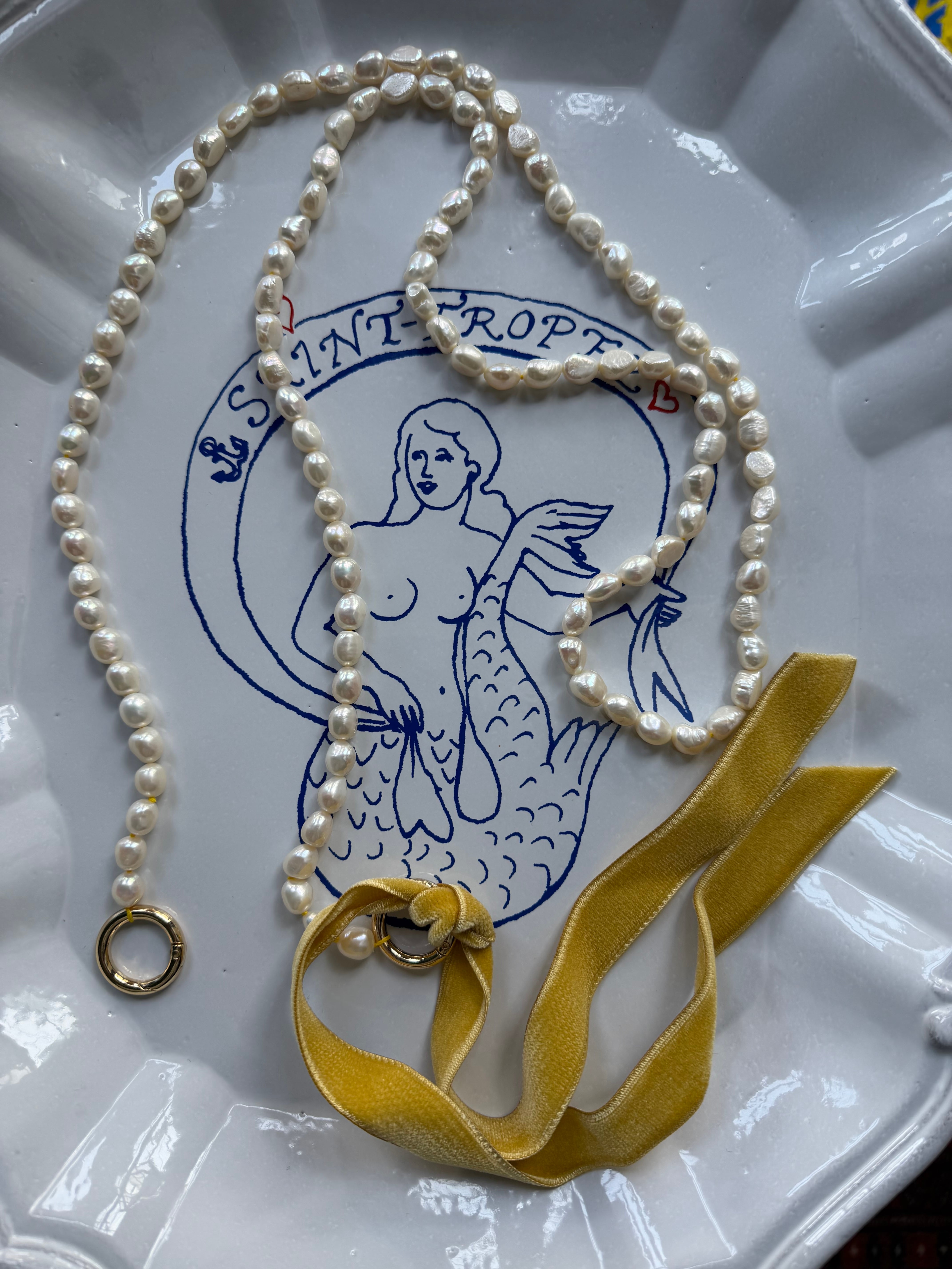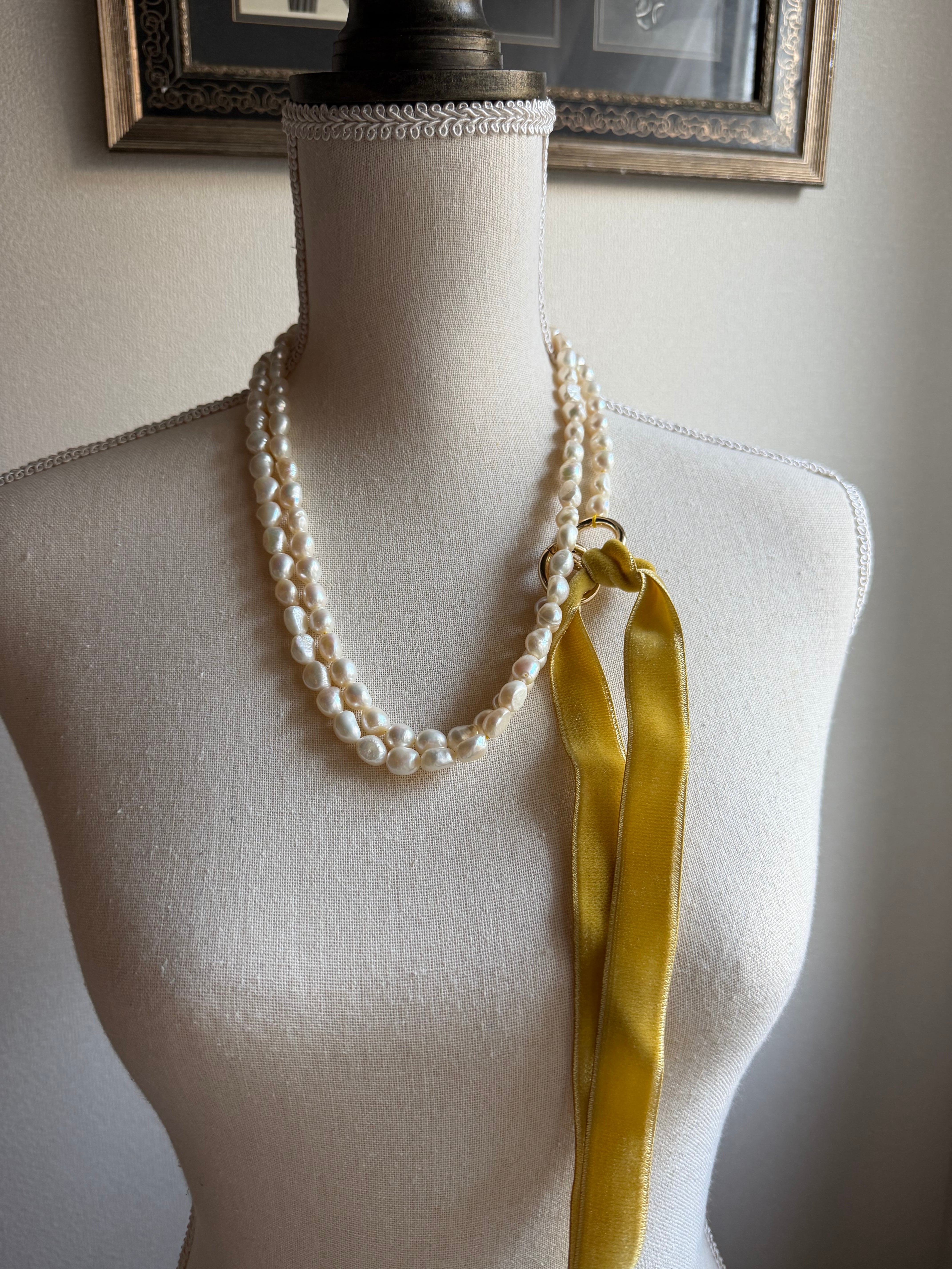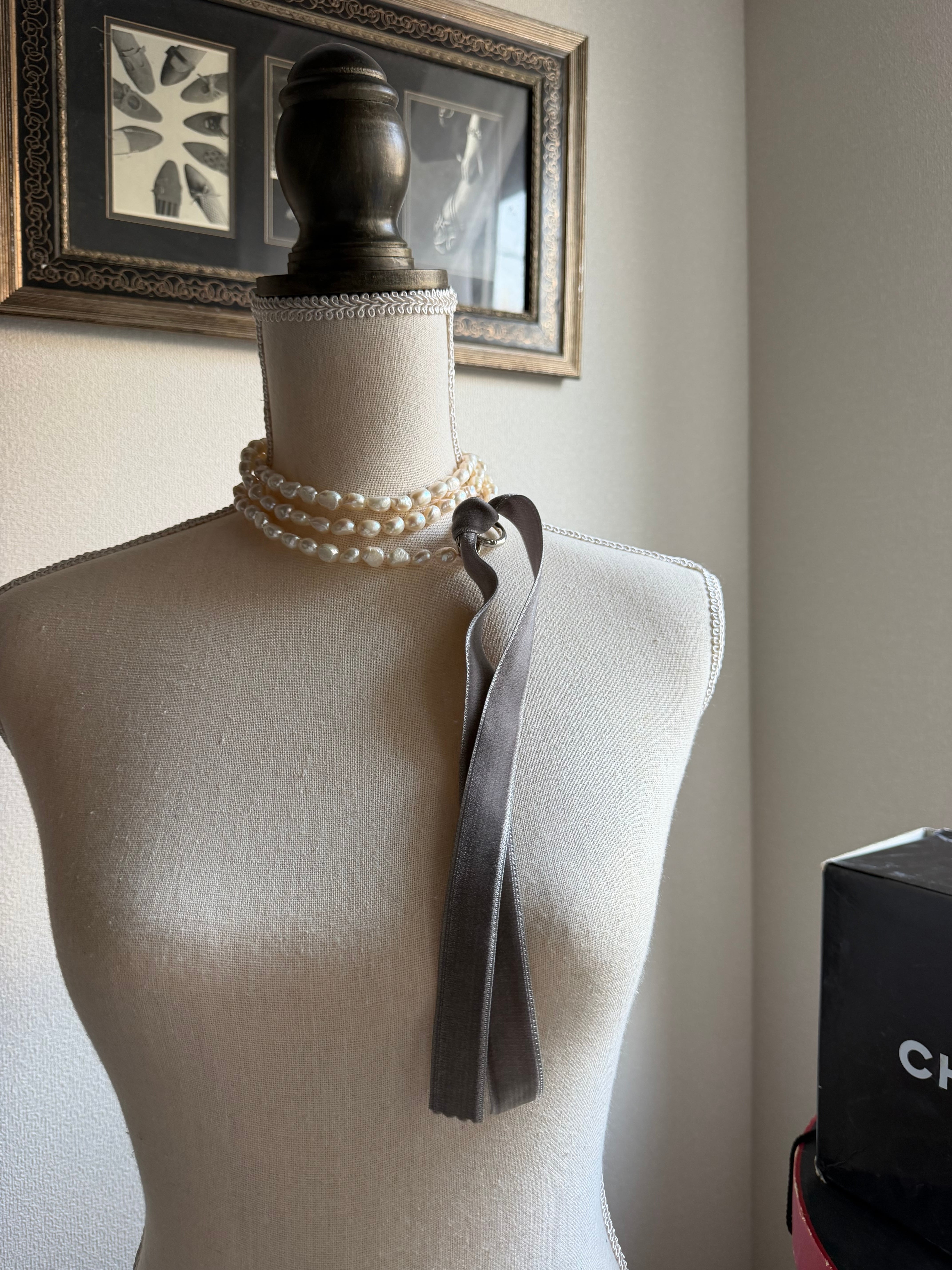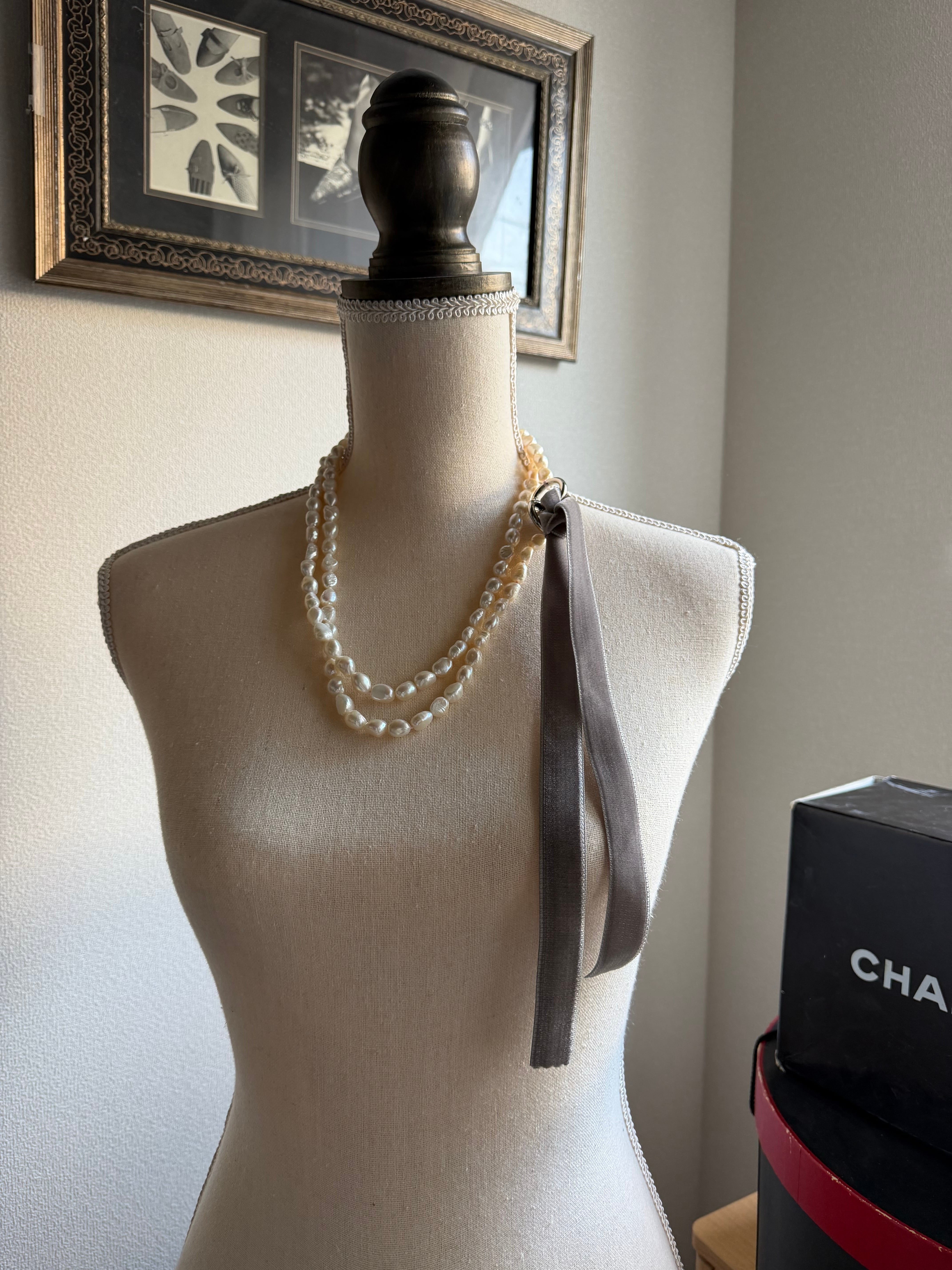 • 素材: 淡水真珠(バロックパール 約8.0〜8.5mm)、ベルベットリボン、真鍮(金具パーツ)