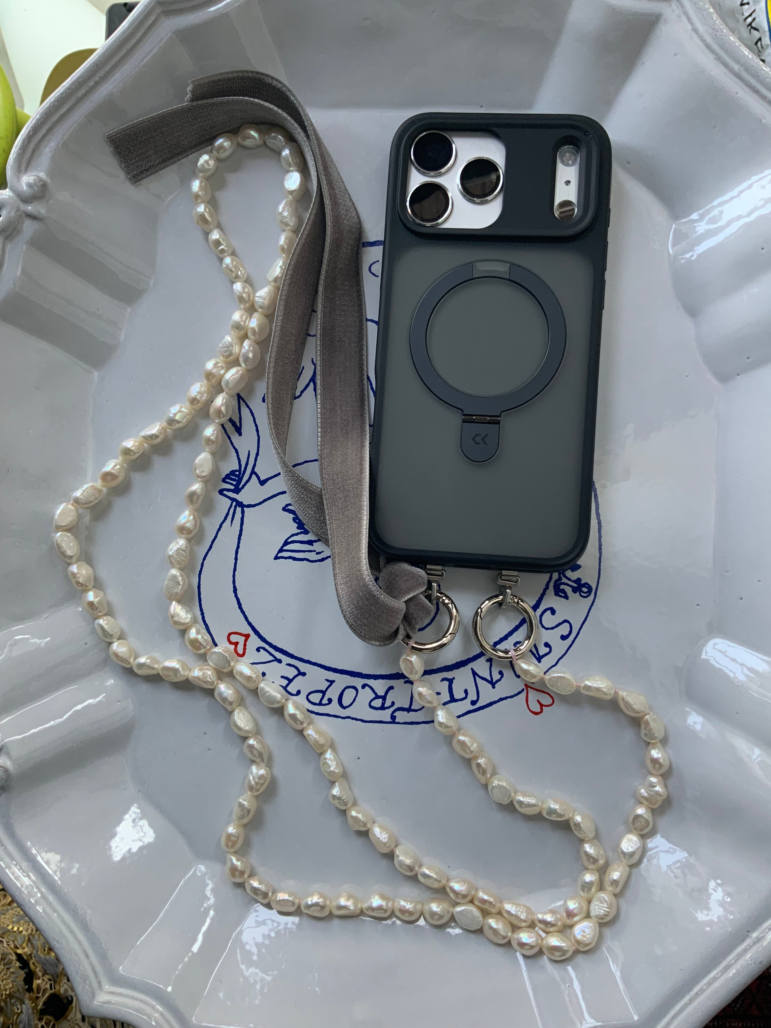 艶やかな大粒のバロックパールに、上質なベルベットリボンを添えた、大人の遊び心あふれるマルチストラップです。