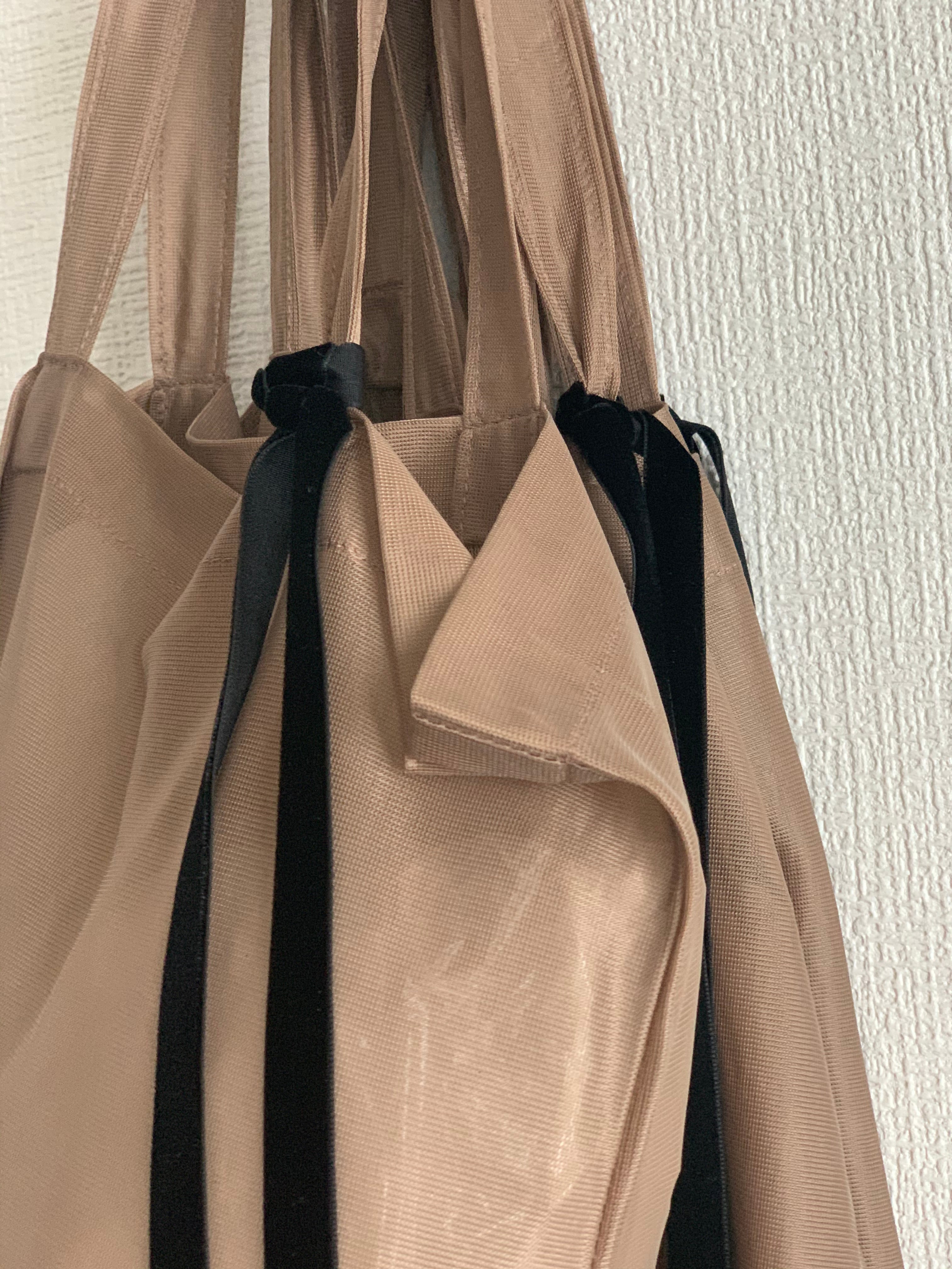茶系の伸縮性のある少し透けた感じの薄くて軽い生地に黒のロゴをプリントしたバッグです。
