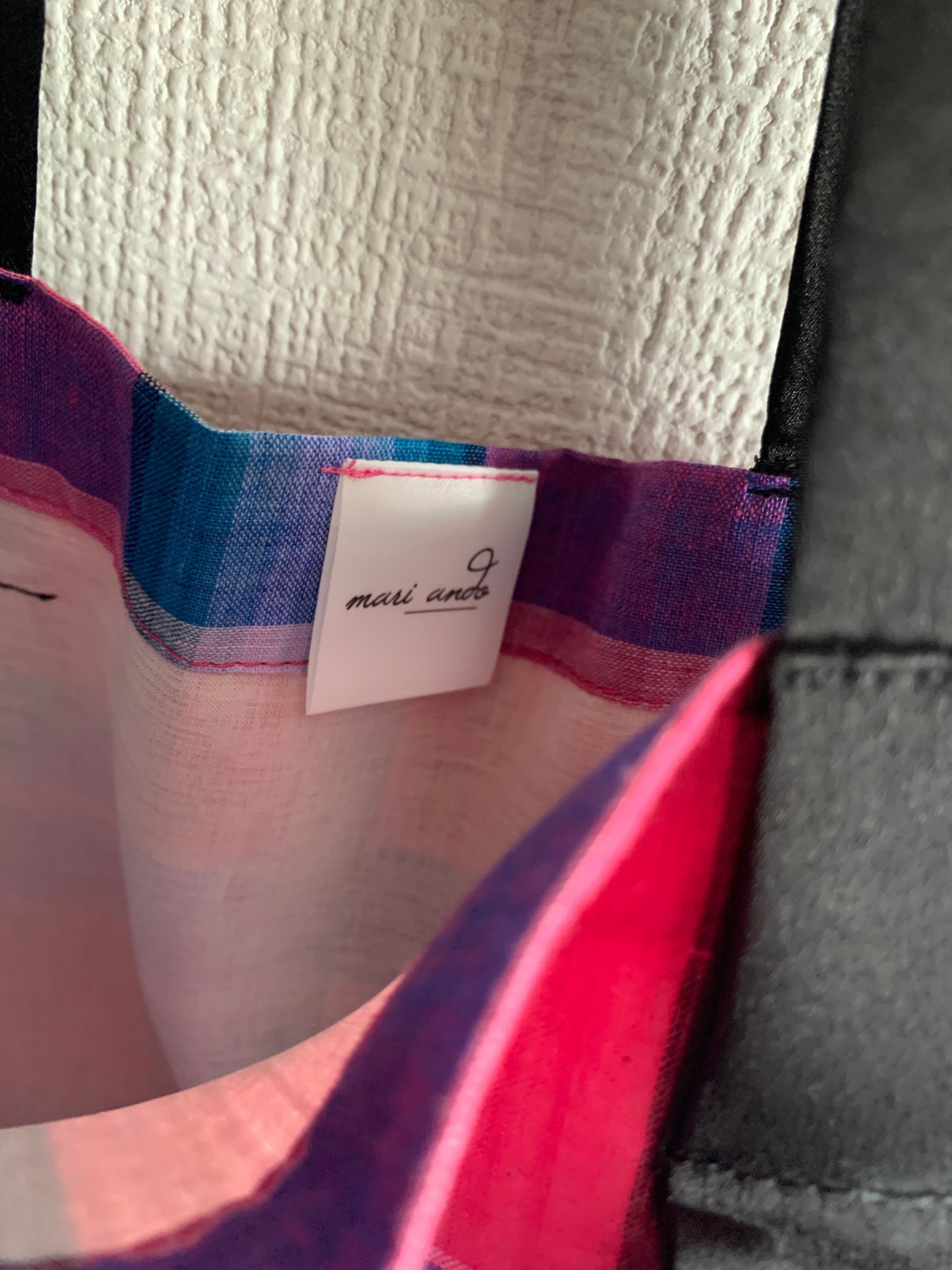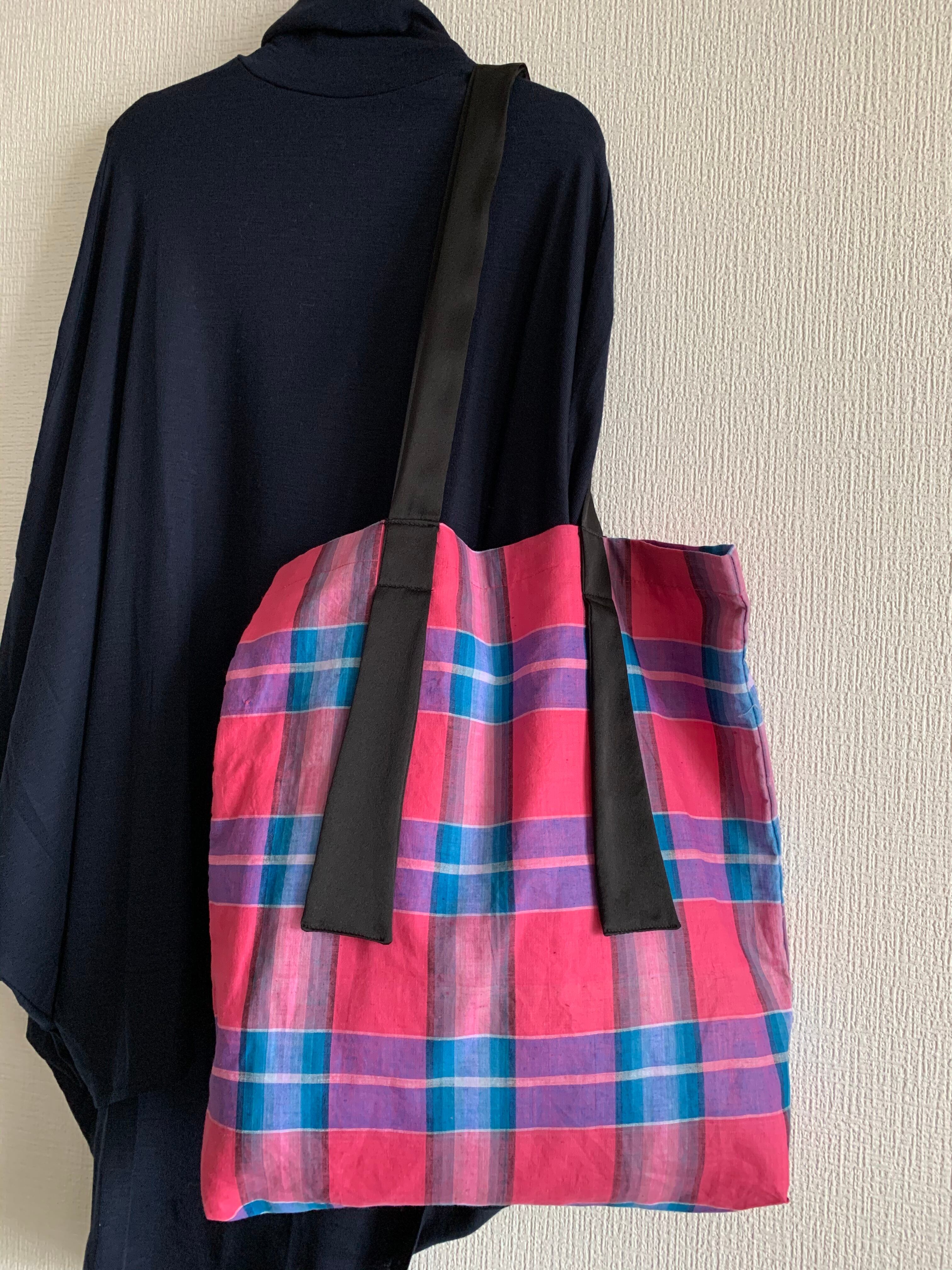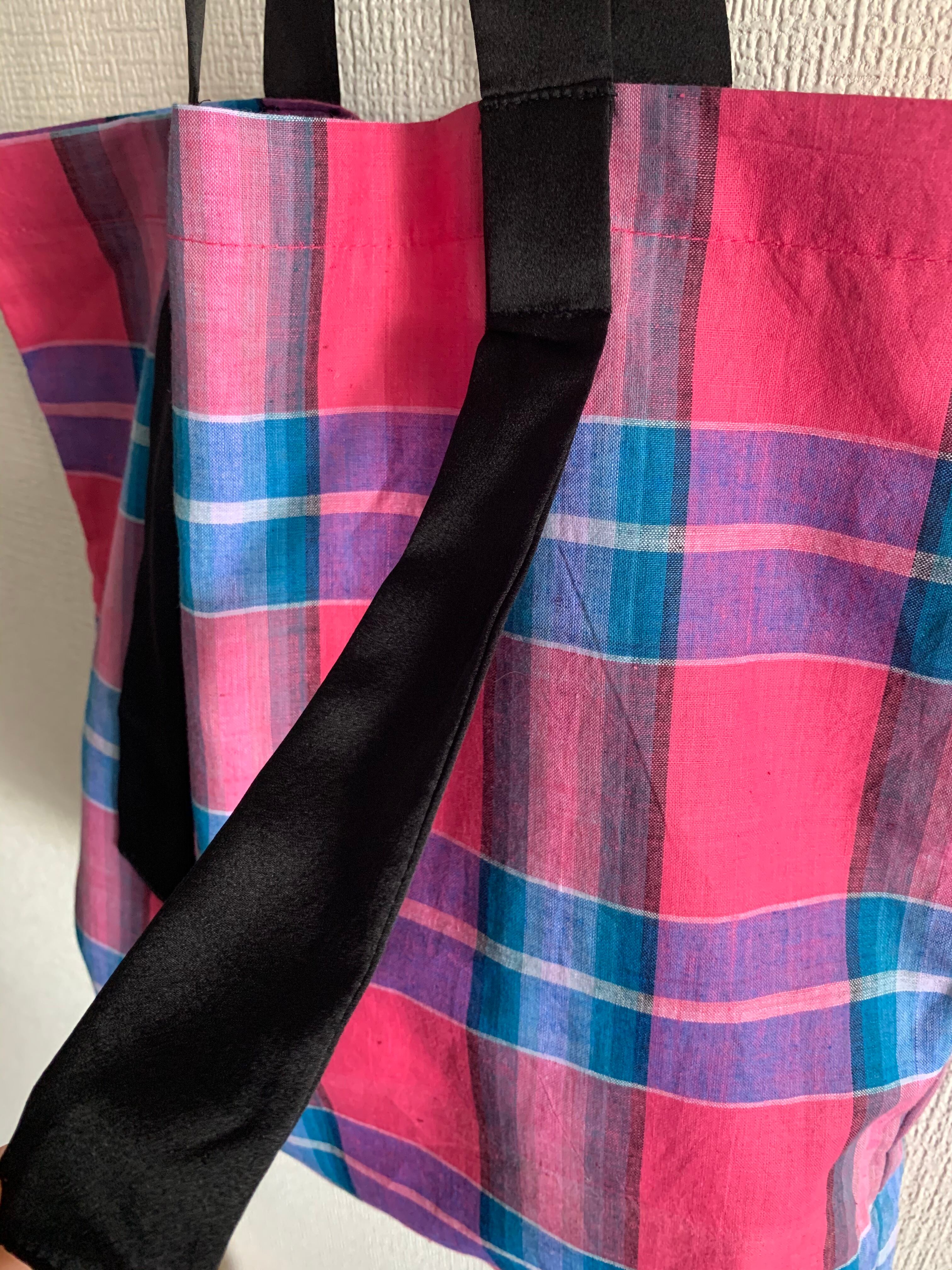 以前インドで購入したピンクのチェック生地を使用して、持ち手は黒のシルクでお作りしました。