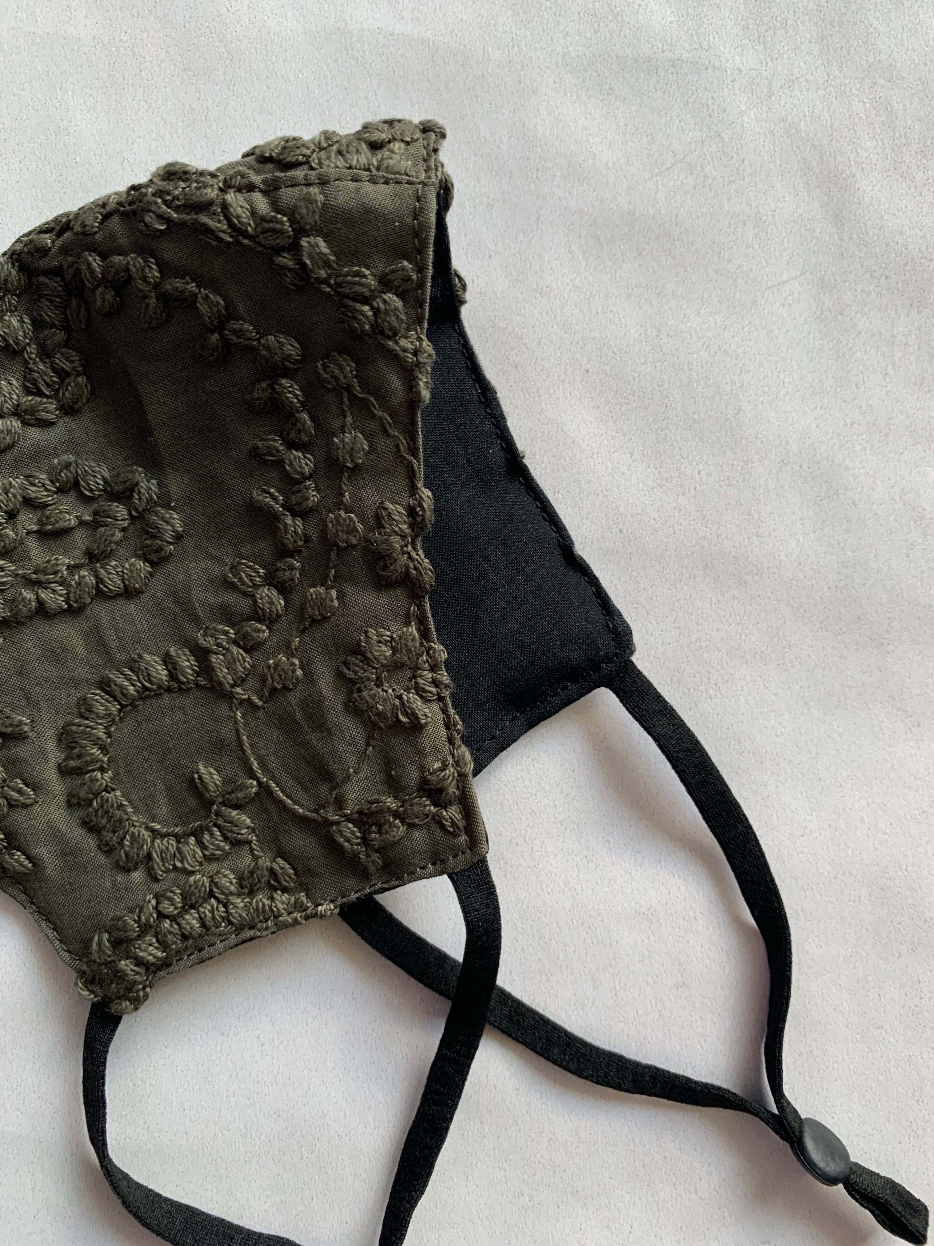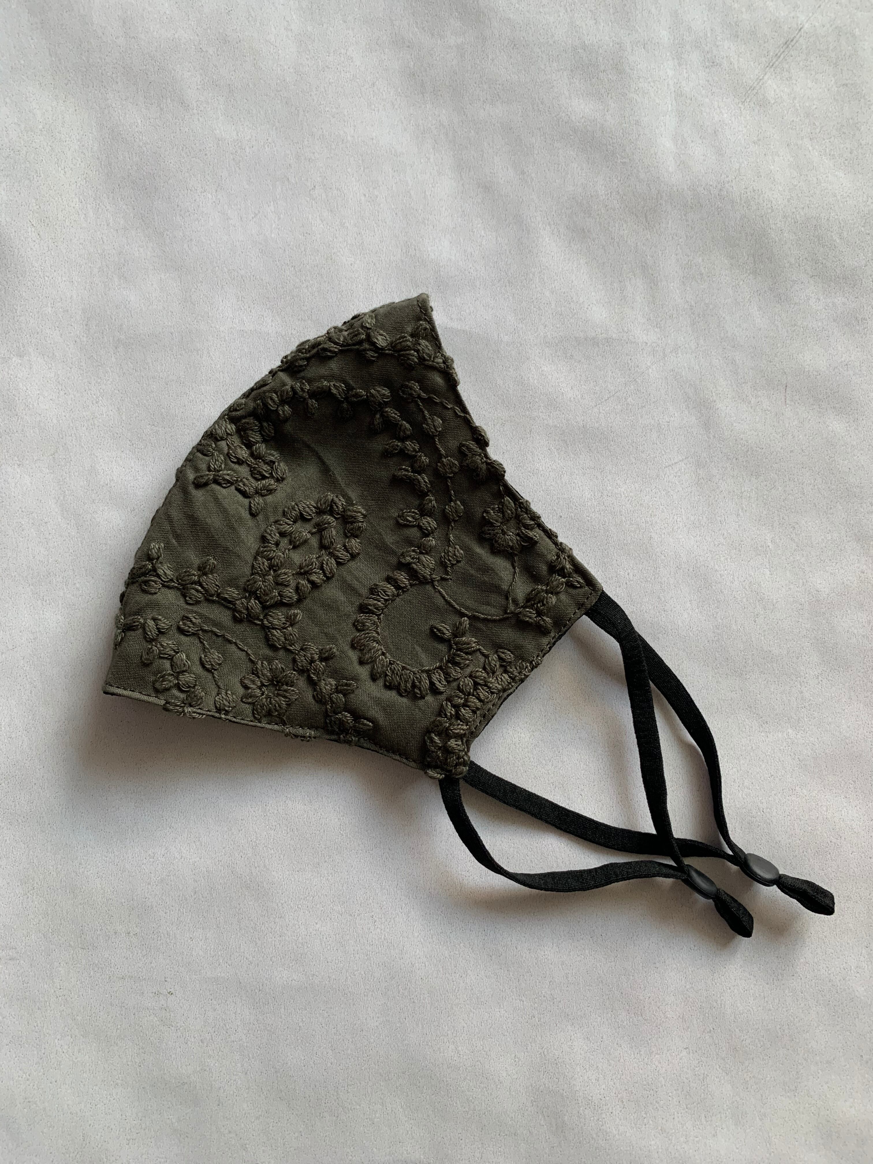 カーキのコットン生地に同カラーで刺繍がされた無地で表情のある生地です。