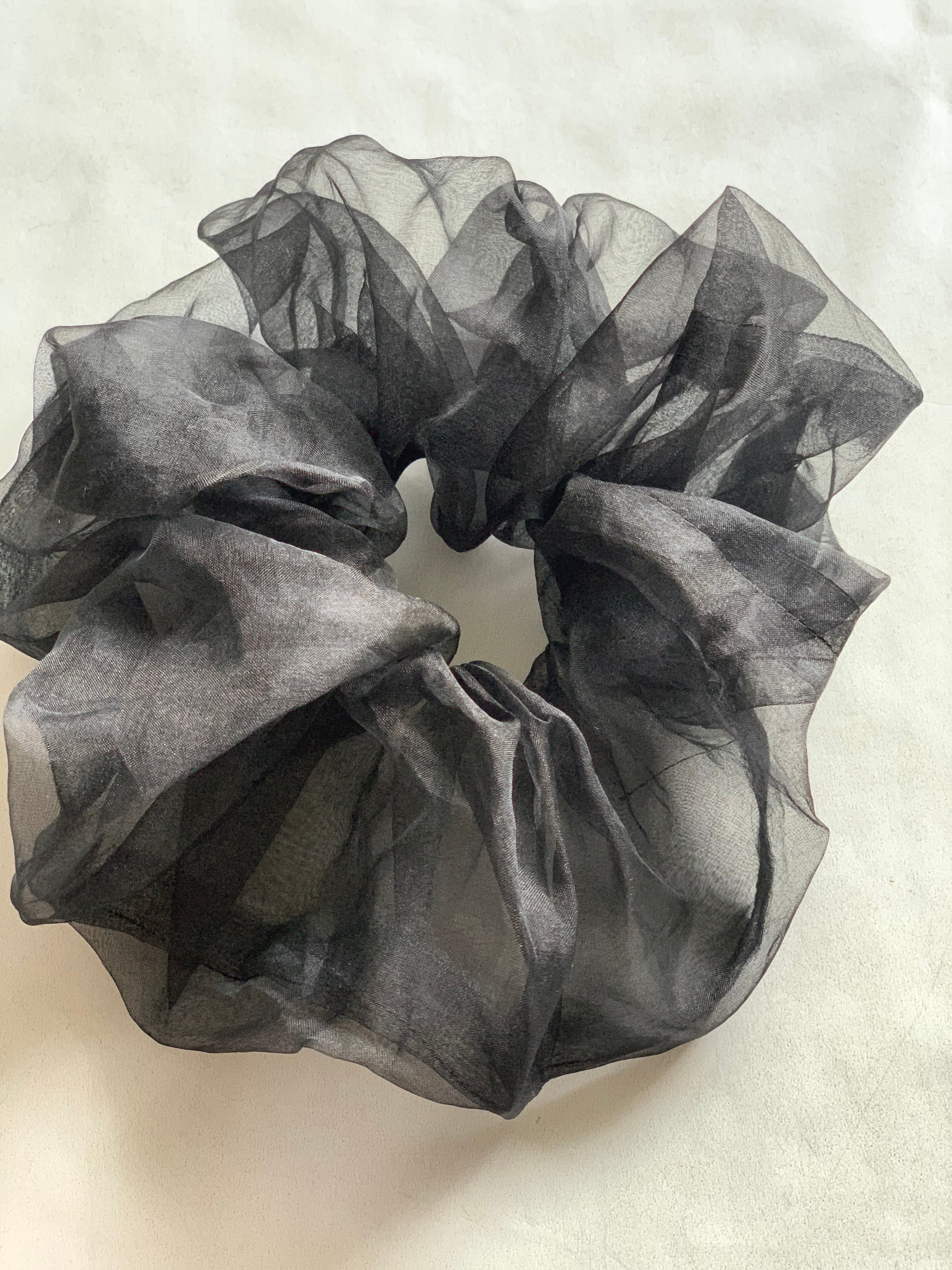 黒のシルクオーガンジーのモード感のあるお洒落で大人っぽい前回のbigより一回り小さくなったミドルサイズシュシュです。