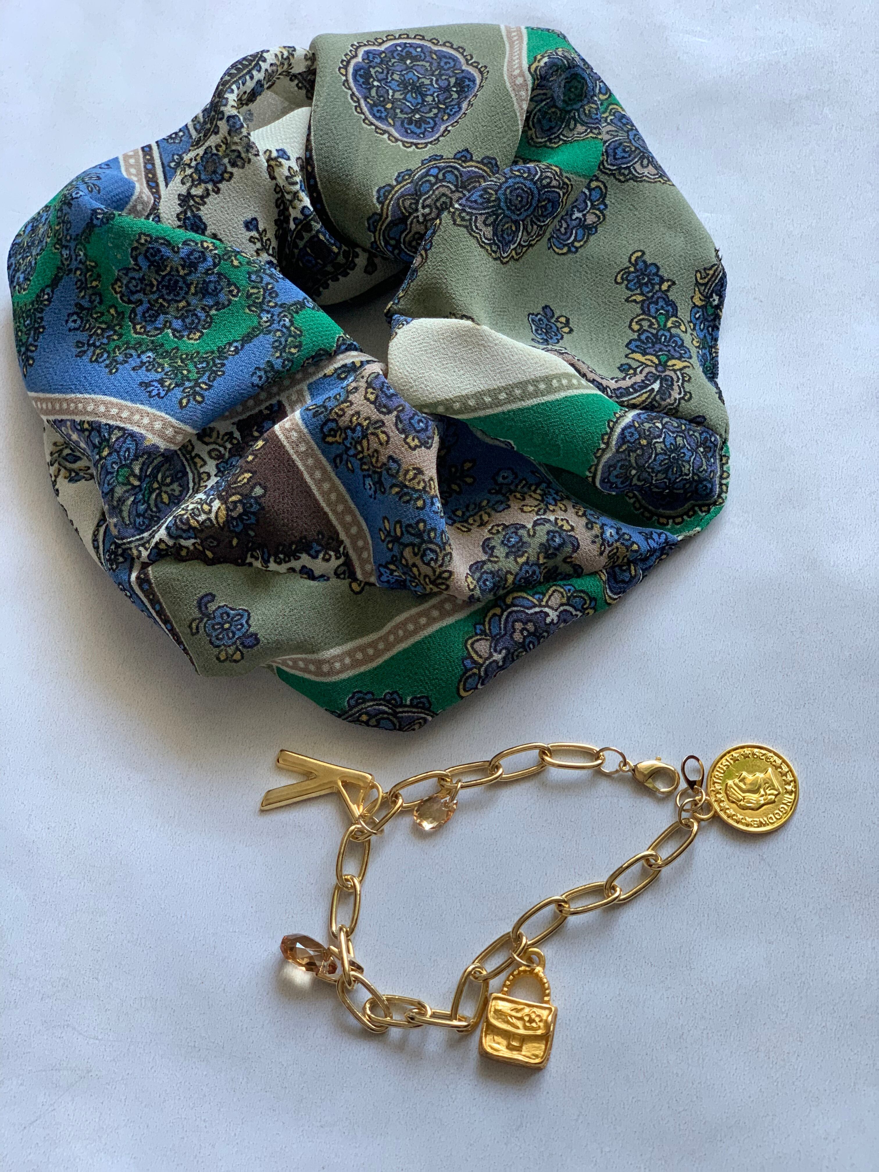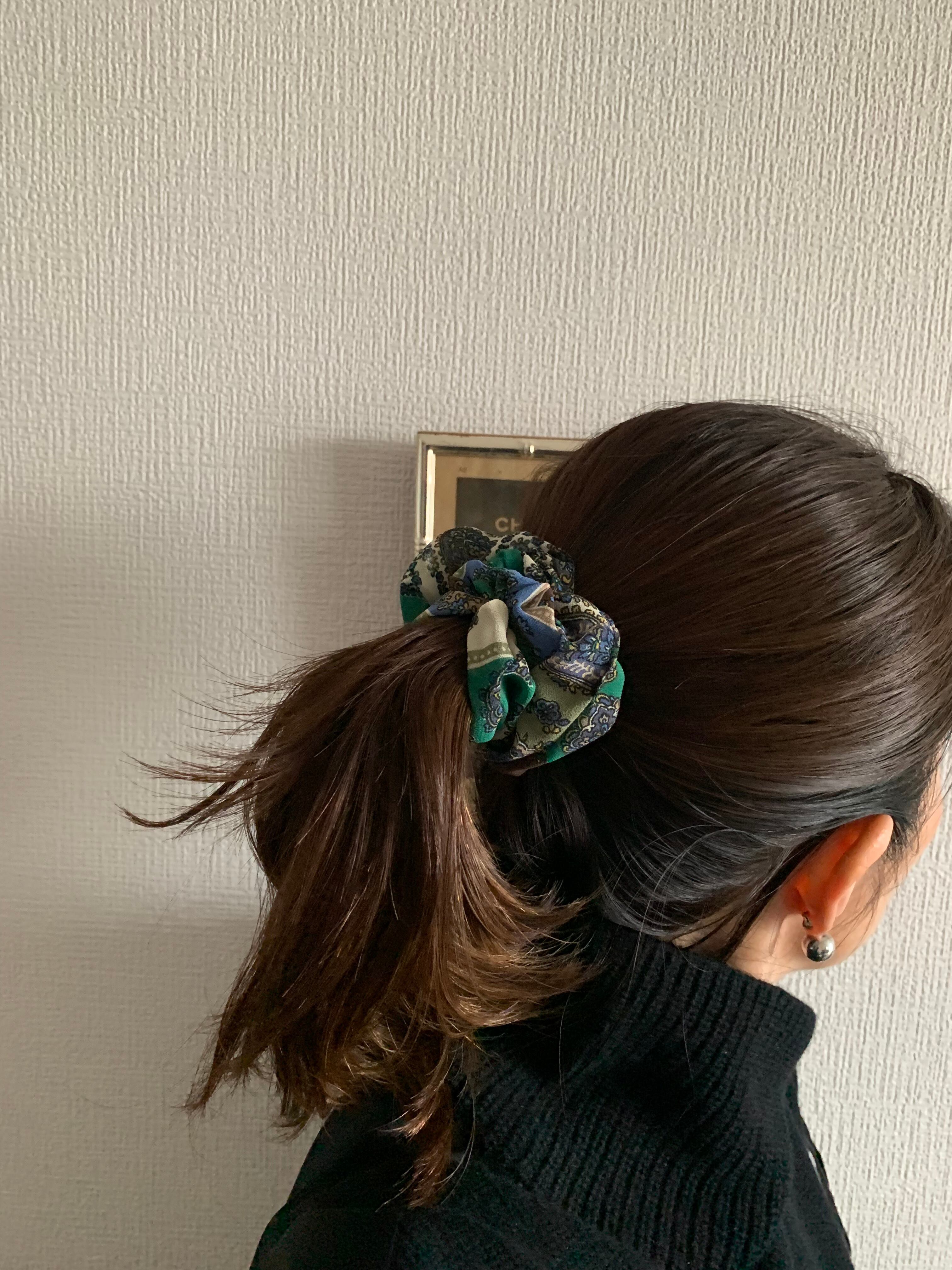 こちらはブレスレットとしてお使い頂くのですが、このようにシュシュと合わせて2wayでもお楽しみください。