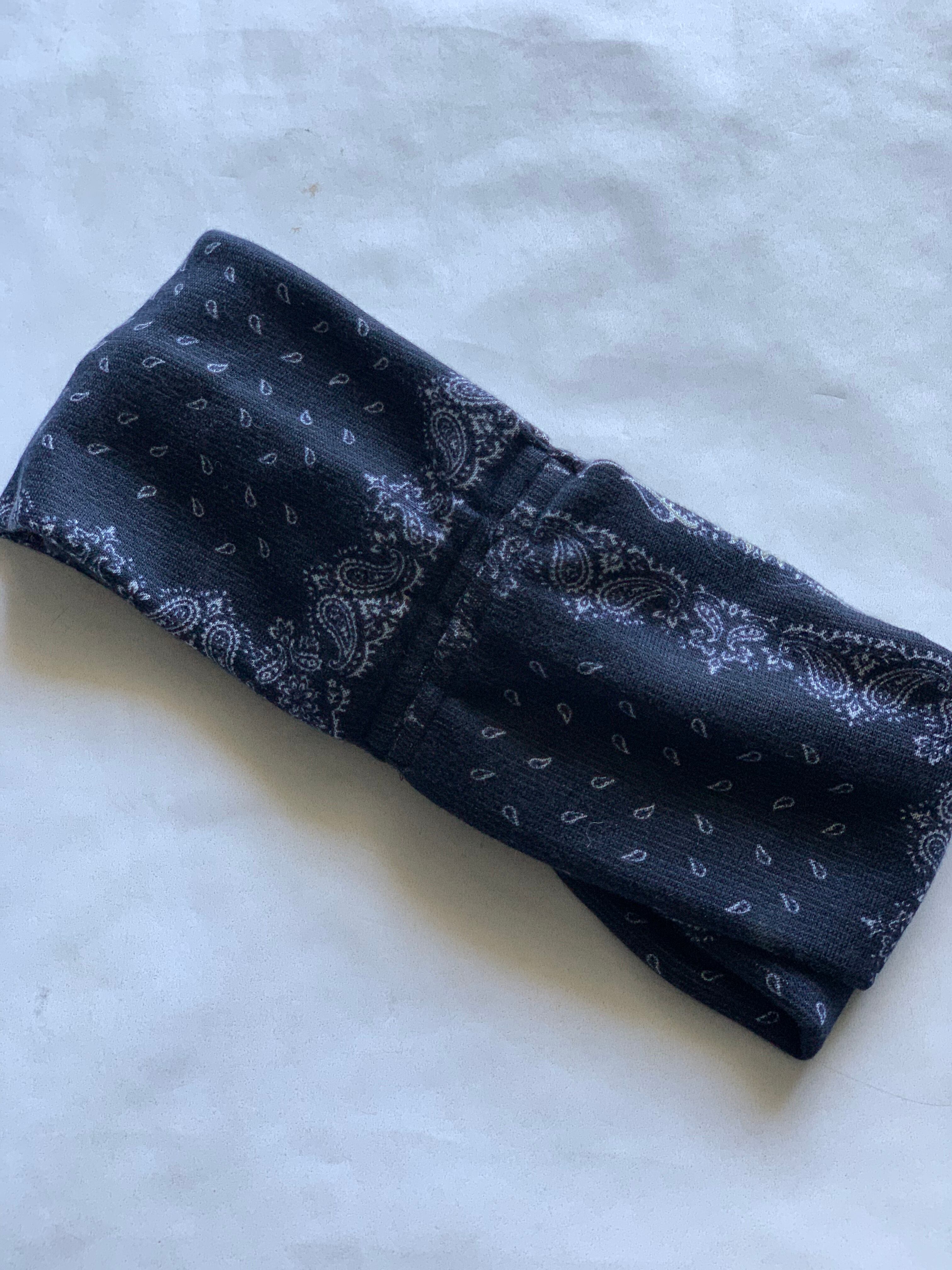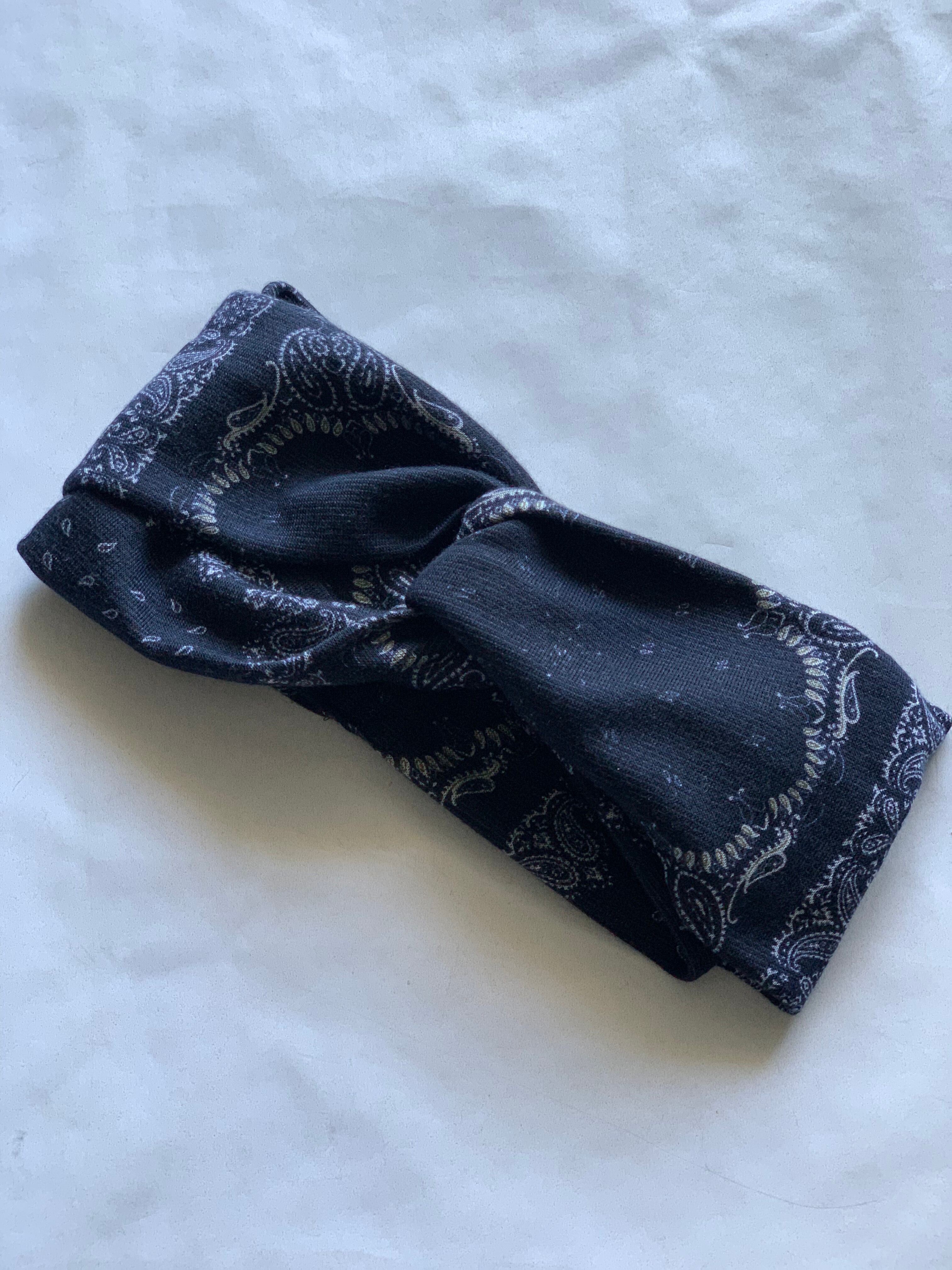 ネイビーのカットソーのような柔らかな伸縮性のある生地のバンダナ柄のヘアバンドです。