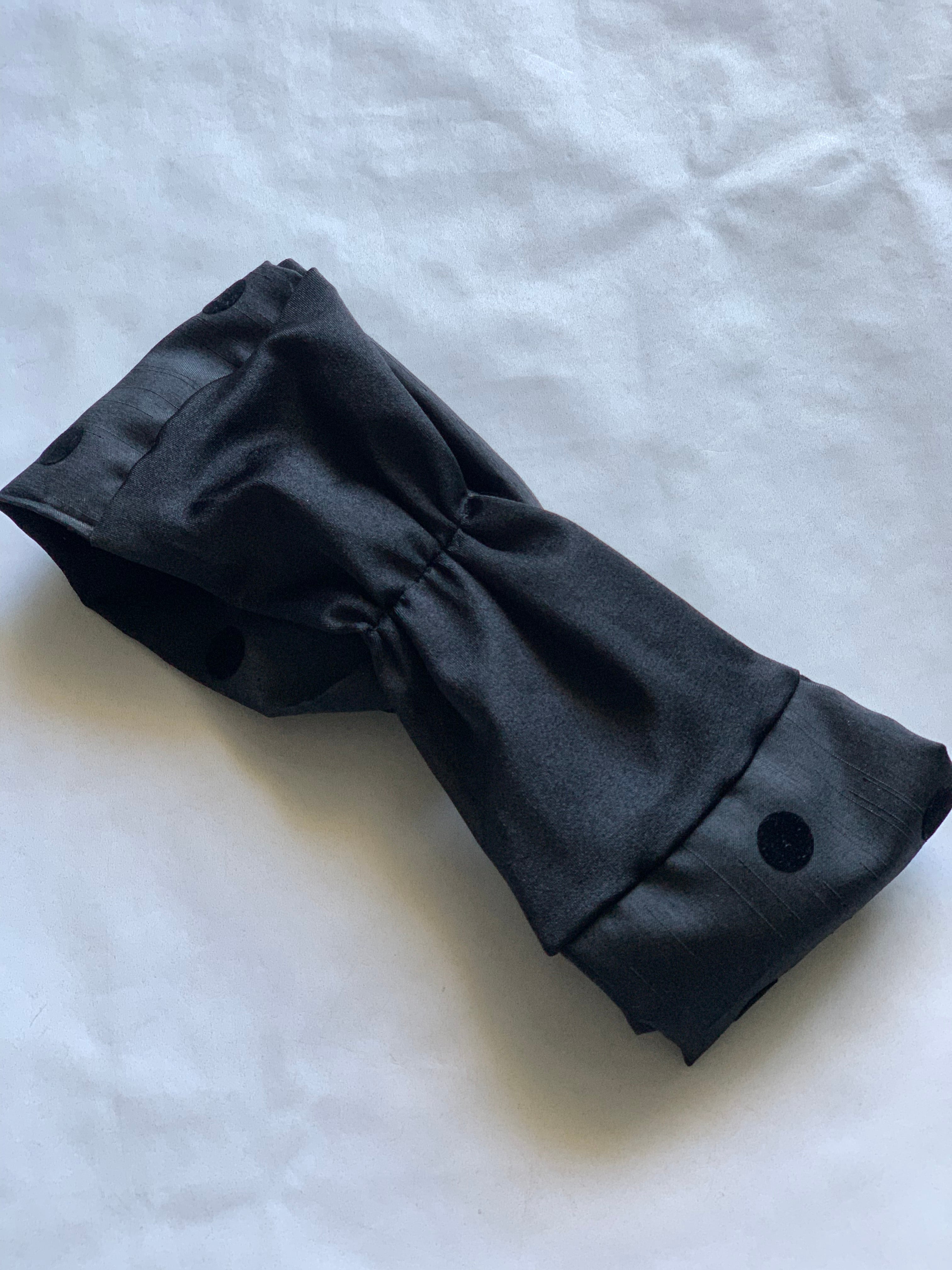 上品かつモードな雰囲気のフロッキープリントドットのシャンタン生地のヘアバンドです。