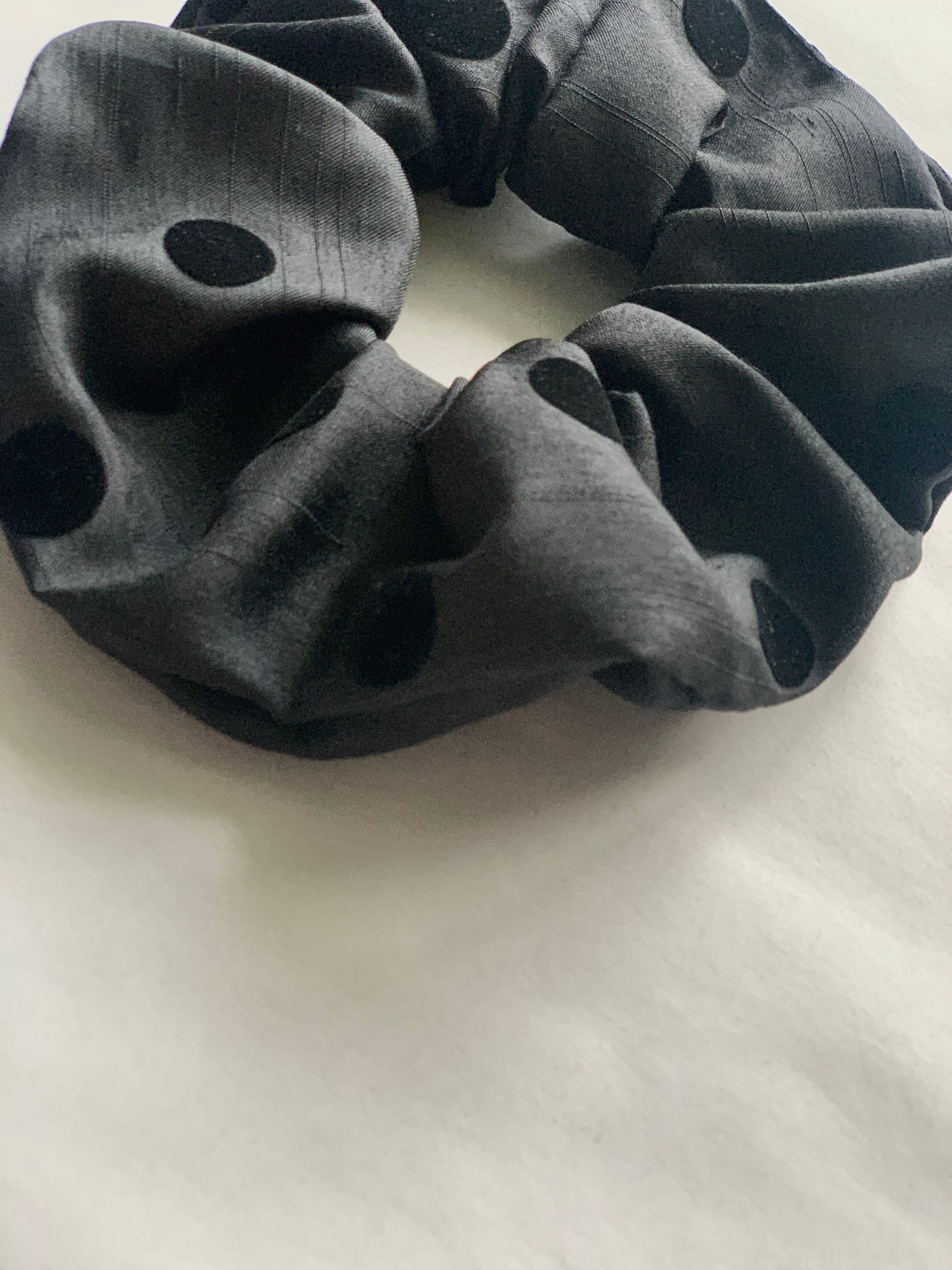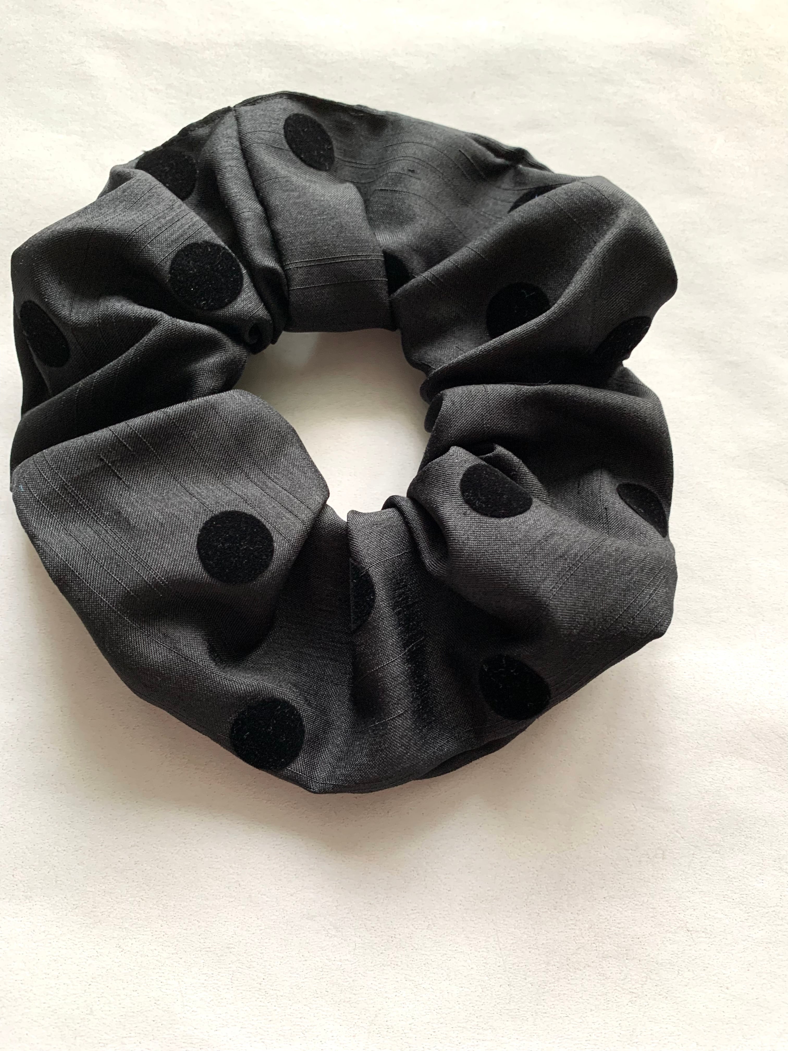 黒のシャンタン生地に黒のフロッキープリントのドットのモード感のある生地のミドルサイズのシュシュです。