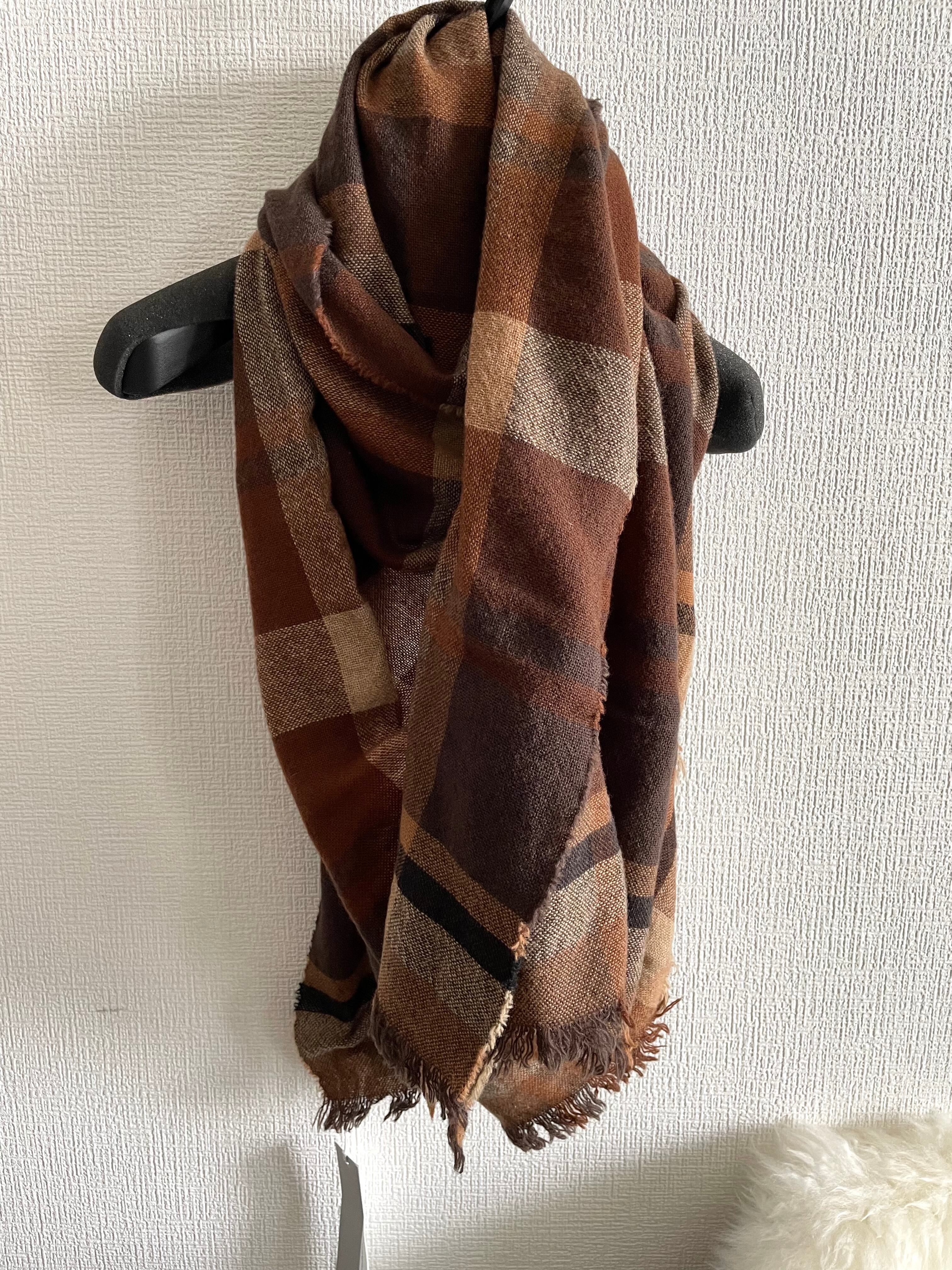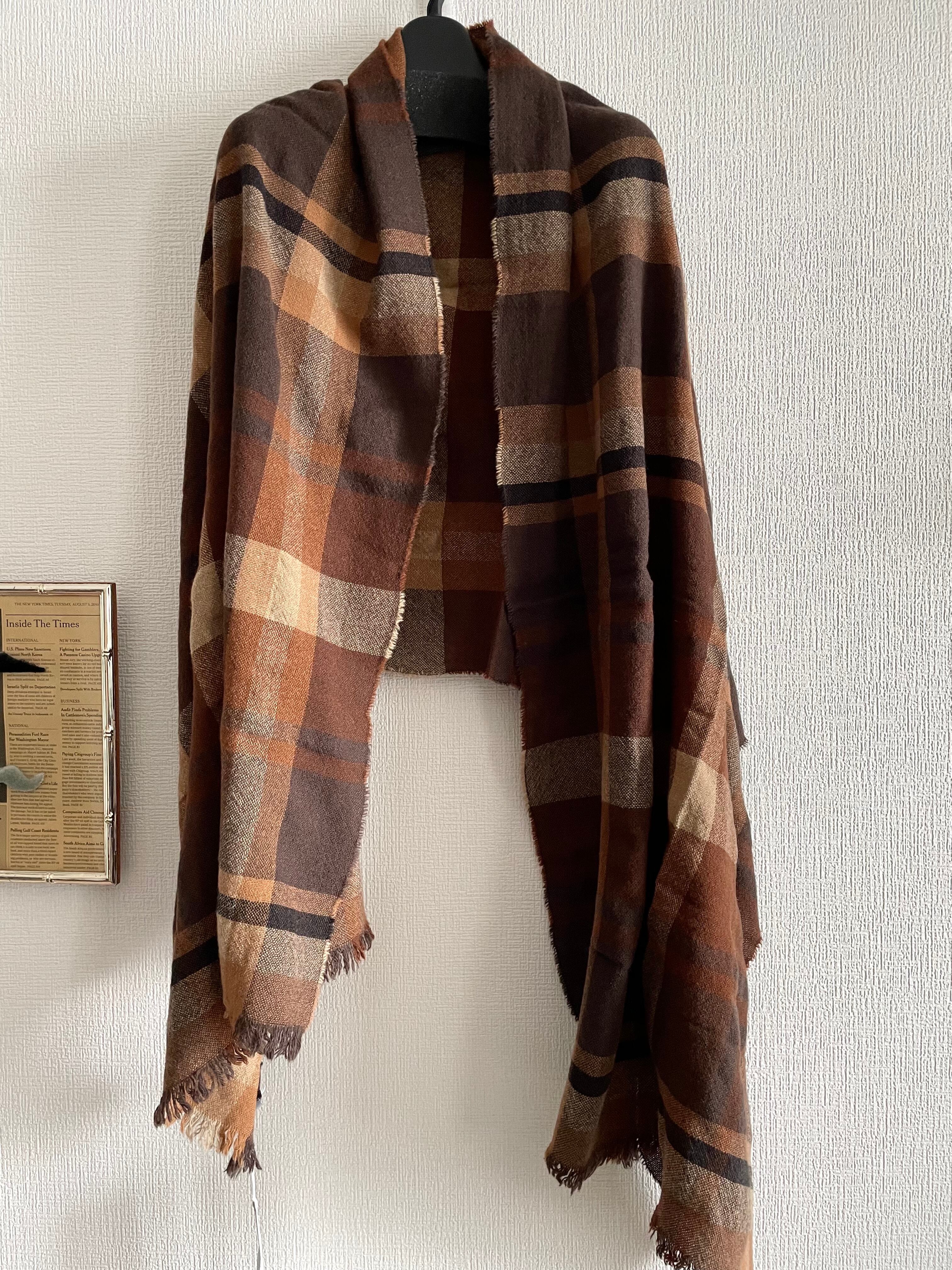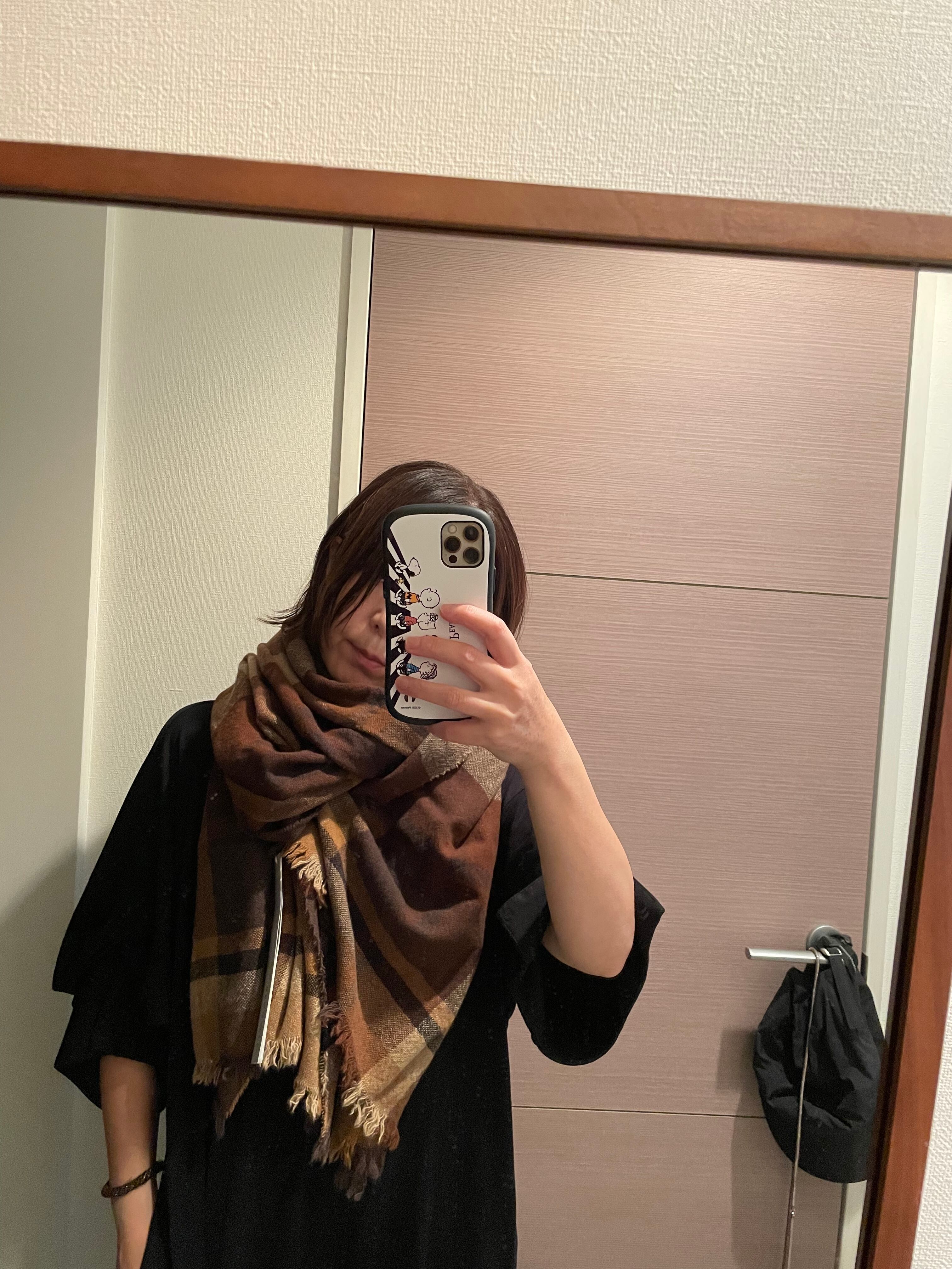 黒のコート、ベージュのコート、単色になりがちな冬のコーディネートにアクセントでお洒落なチェックのストールを是非取り入れてください。