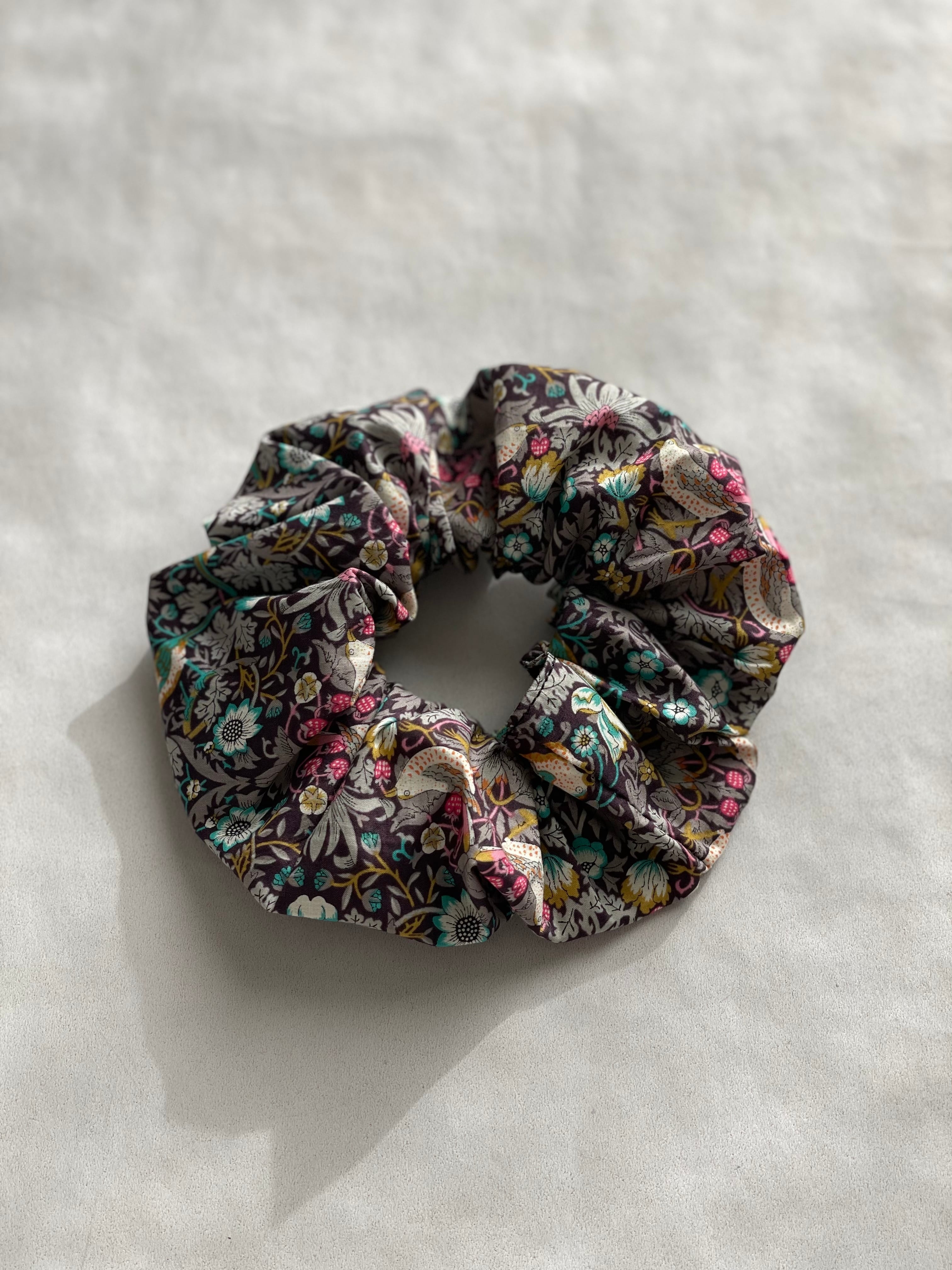 リバティプリントで茶色地に鳥花木の柄のシュシュです。