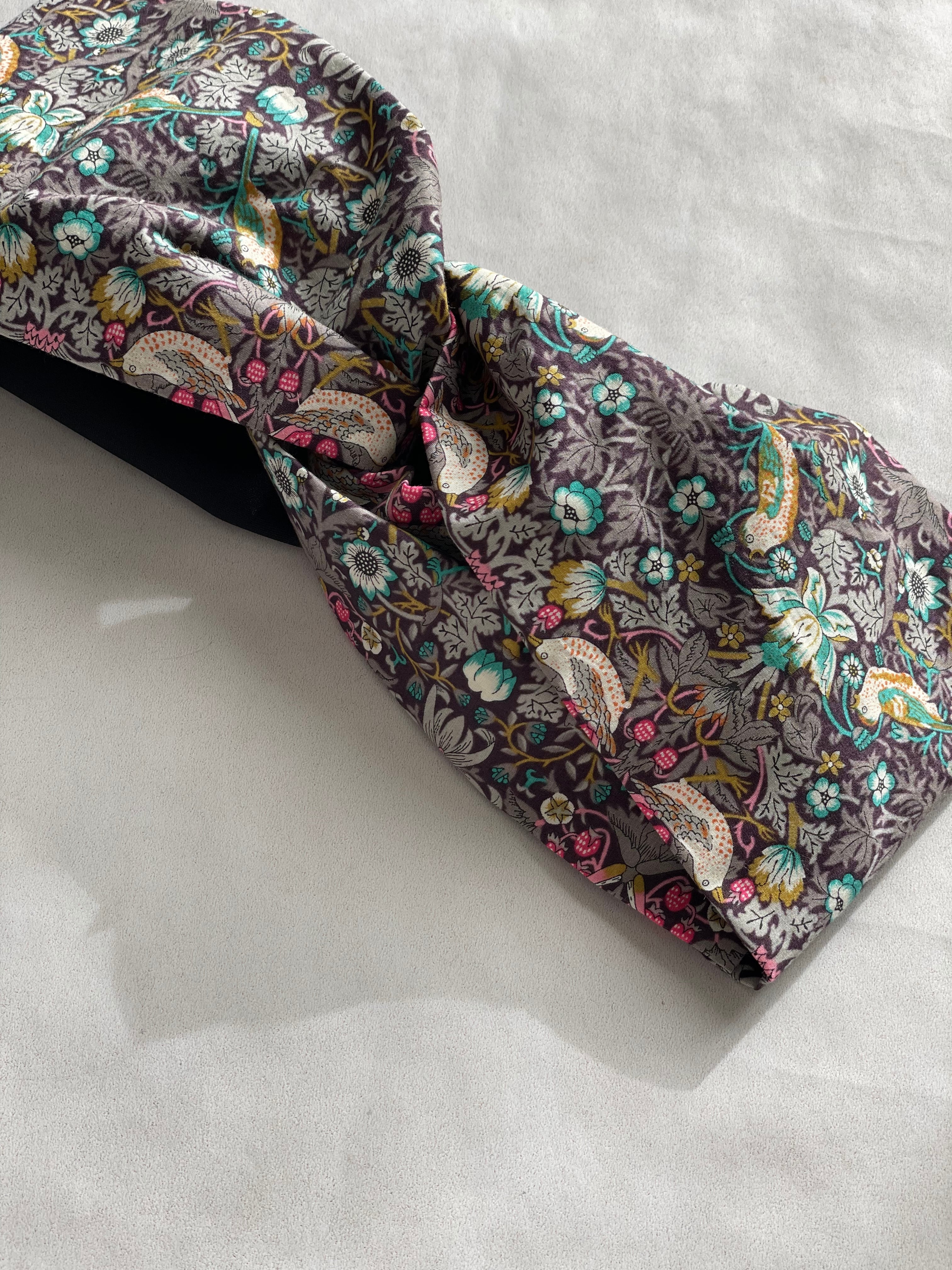 リバティプリントで茶色地に鳥花木の柄の派手すぎず、地味すぎず、リバティならではの上品なプリントでコーディネートのポイントに。
