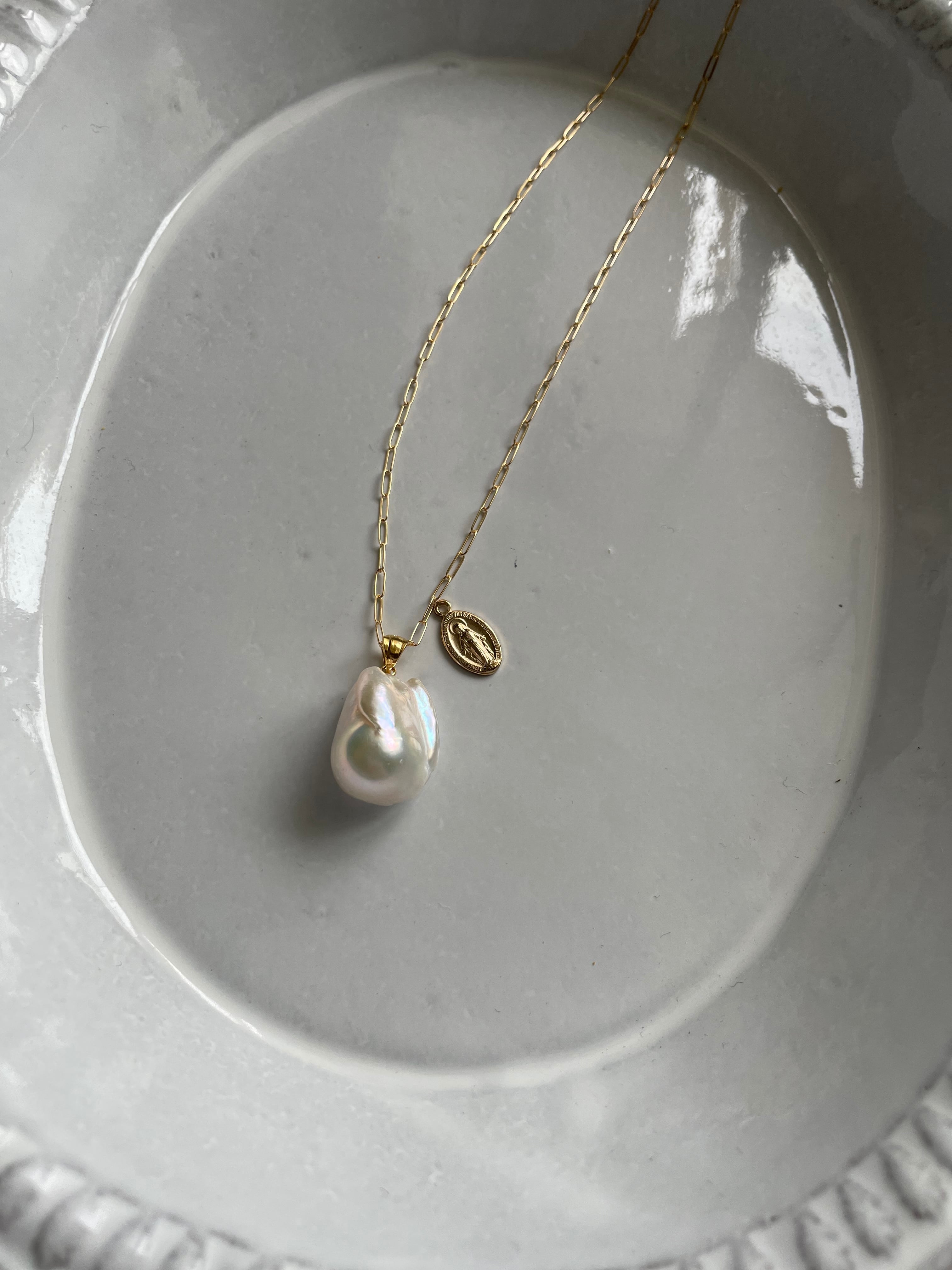 テリがとても良く艶々のバロックパールのペンダントトップに14kgfチェーンと14kgfのメダイチャームをお付けしたネックレスです.