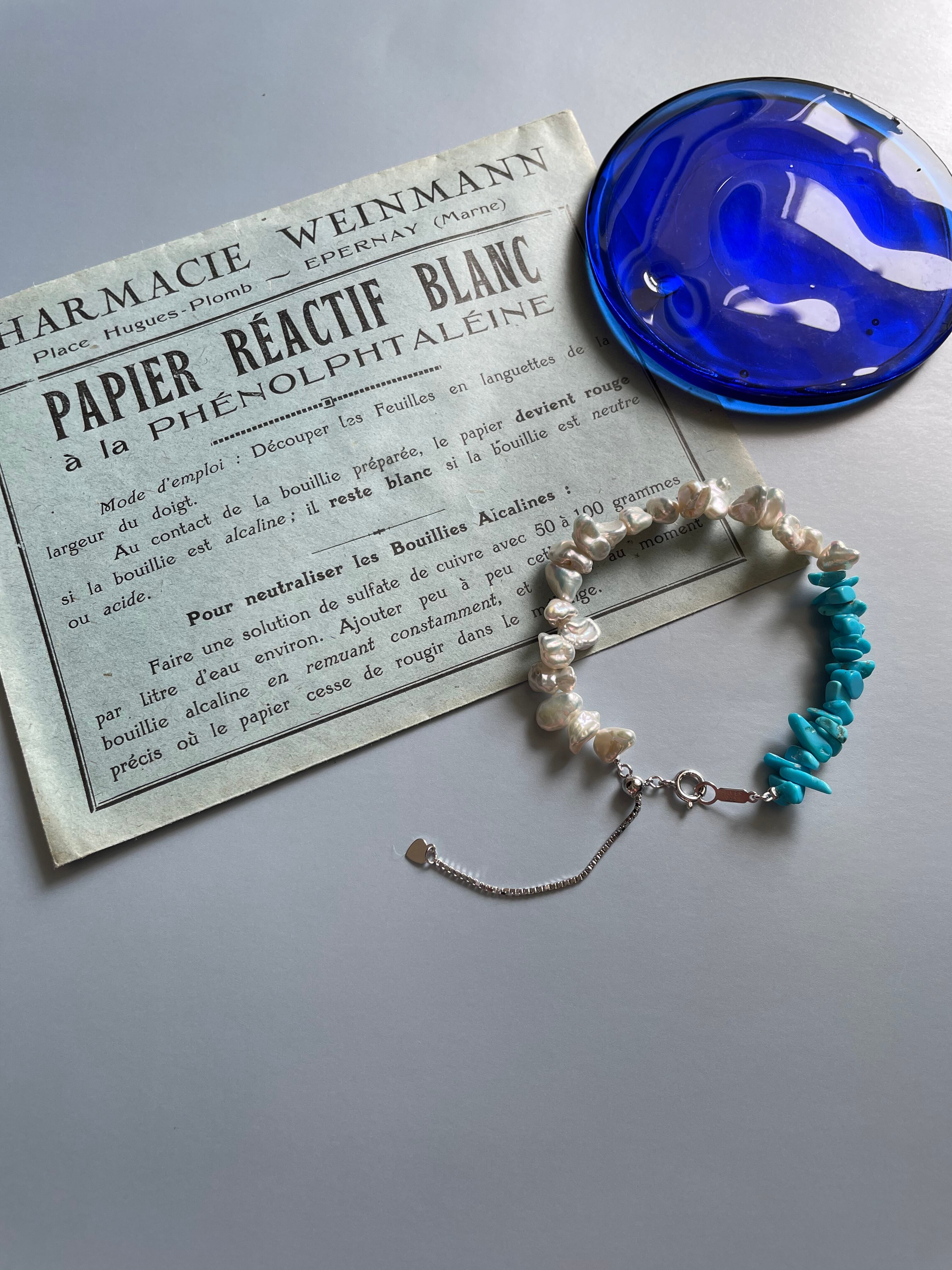 ランダムなケシパールとスリーピングビューティーターコイズのユニークな形がとても個性的なブレスレットです。