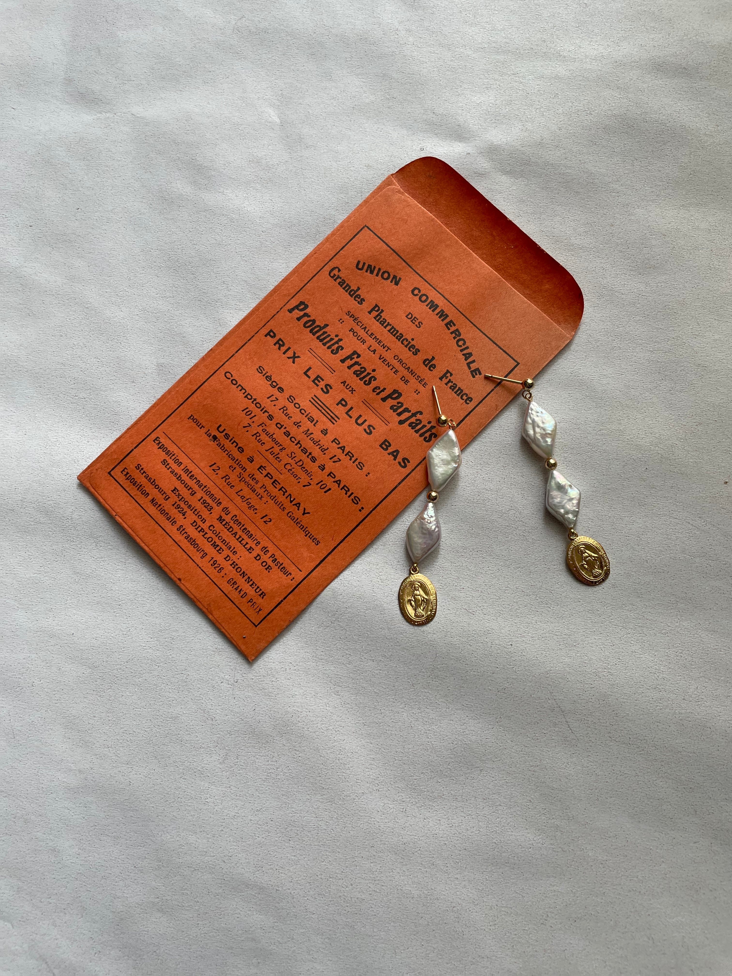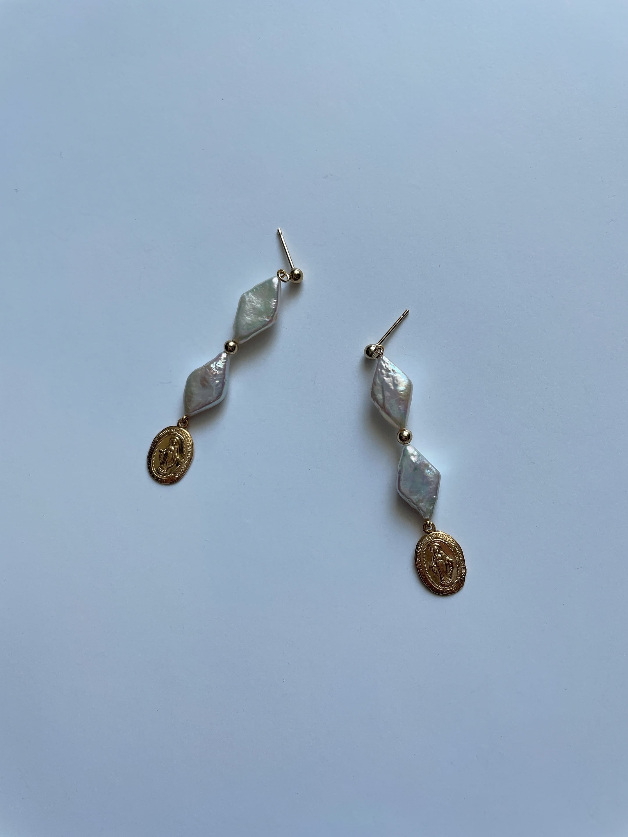 とても貴重なダイヤ形の淡水パール14KGFのメダイチャームのピアスです。