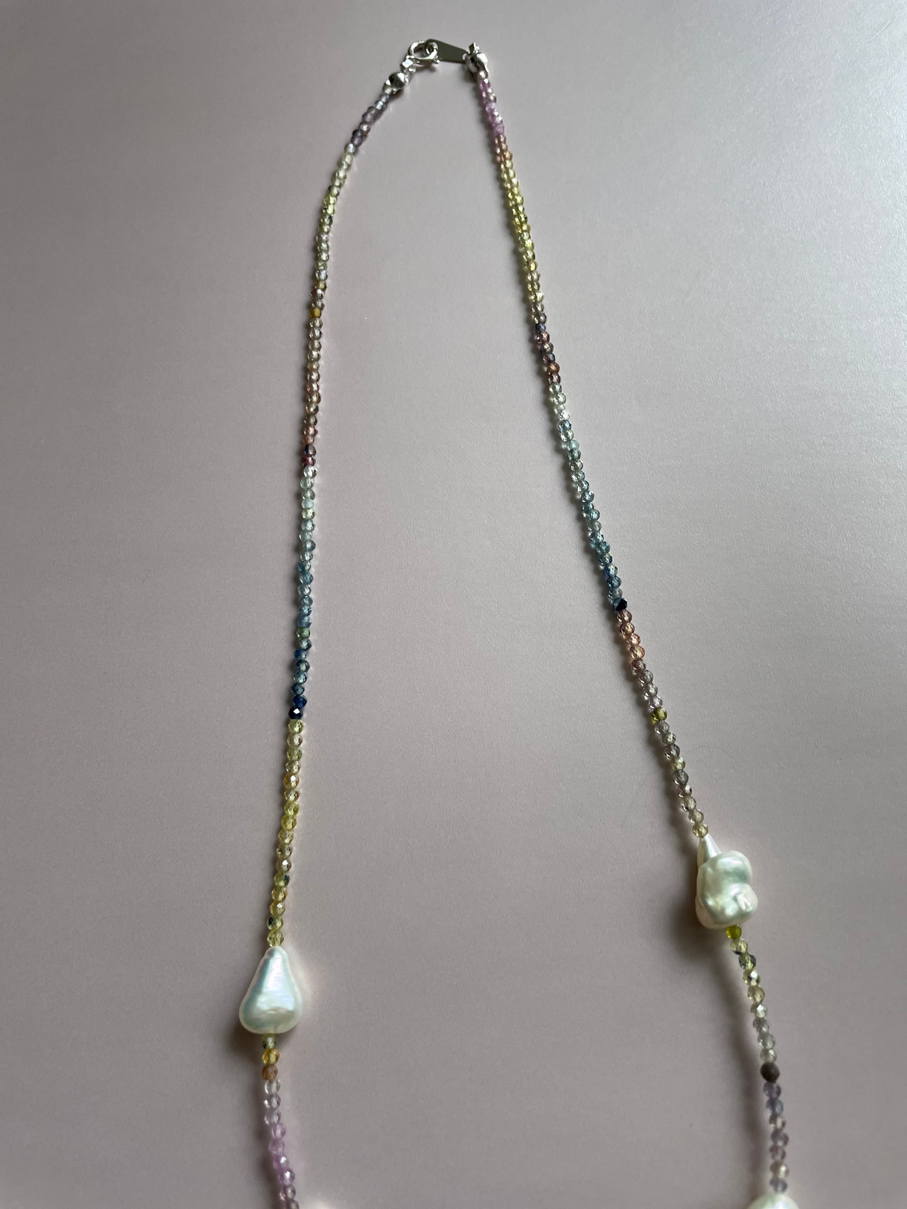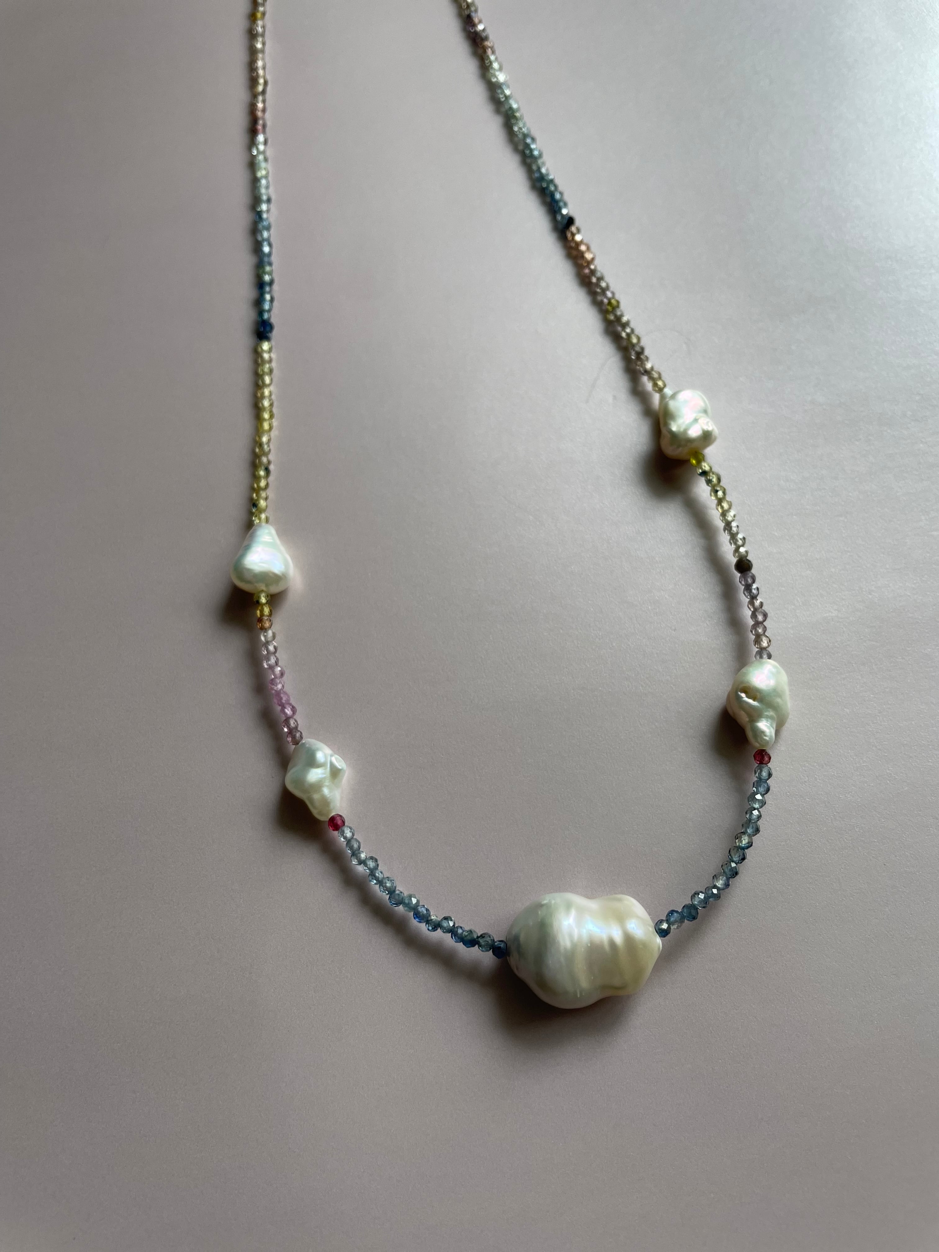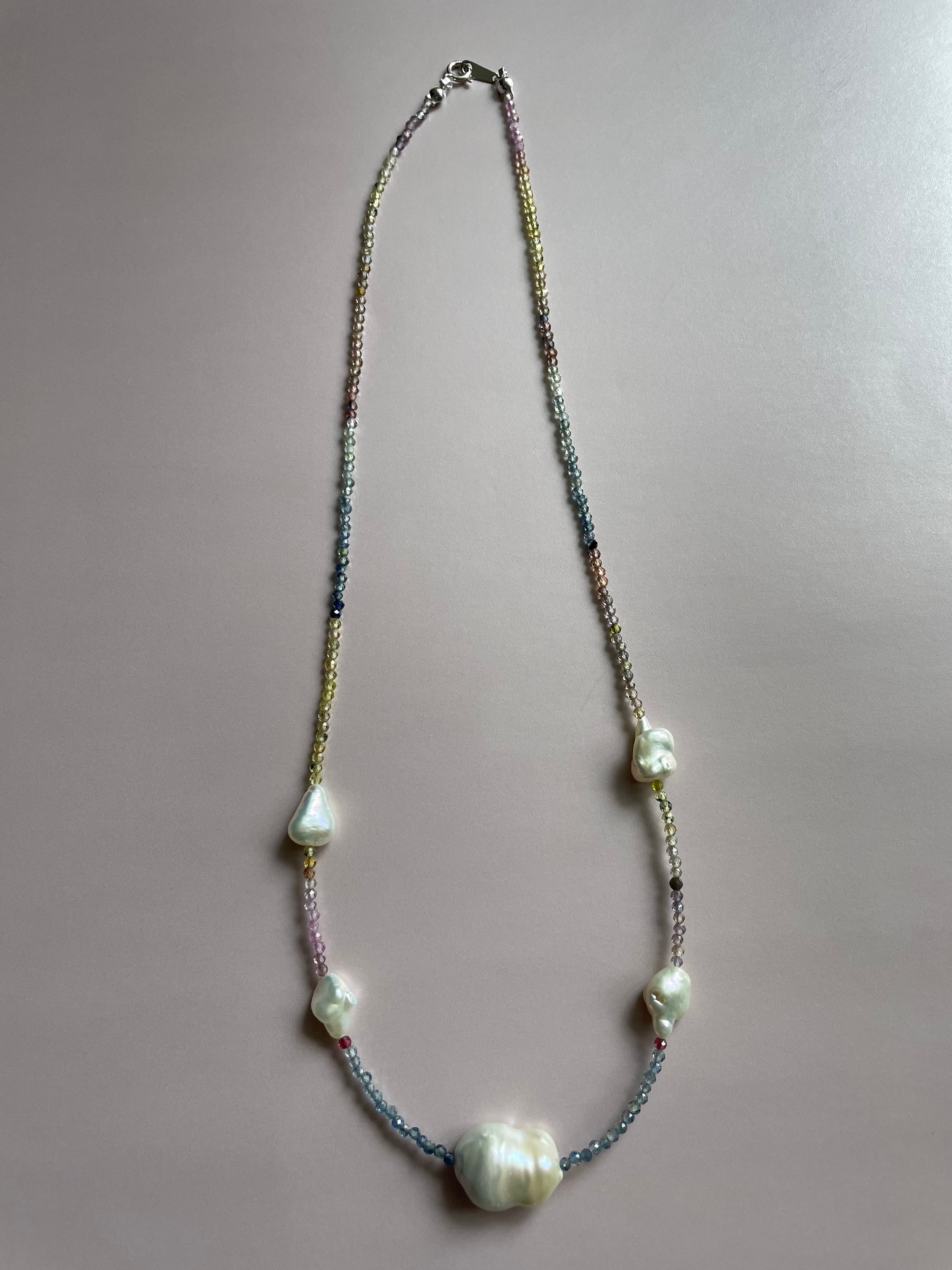 ブルー、ピンク、イエロー、オレンジ、、のサファイアは透明度の高い物を選んでマルチカラーの中に艶とテリの良い淡水バロックパールを大小入れたネックレスです。