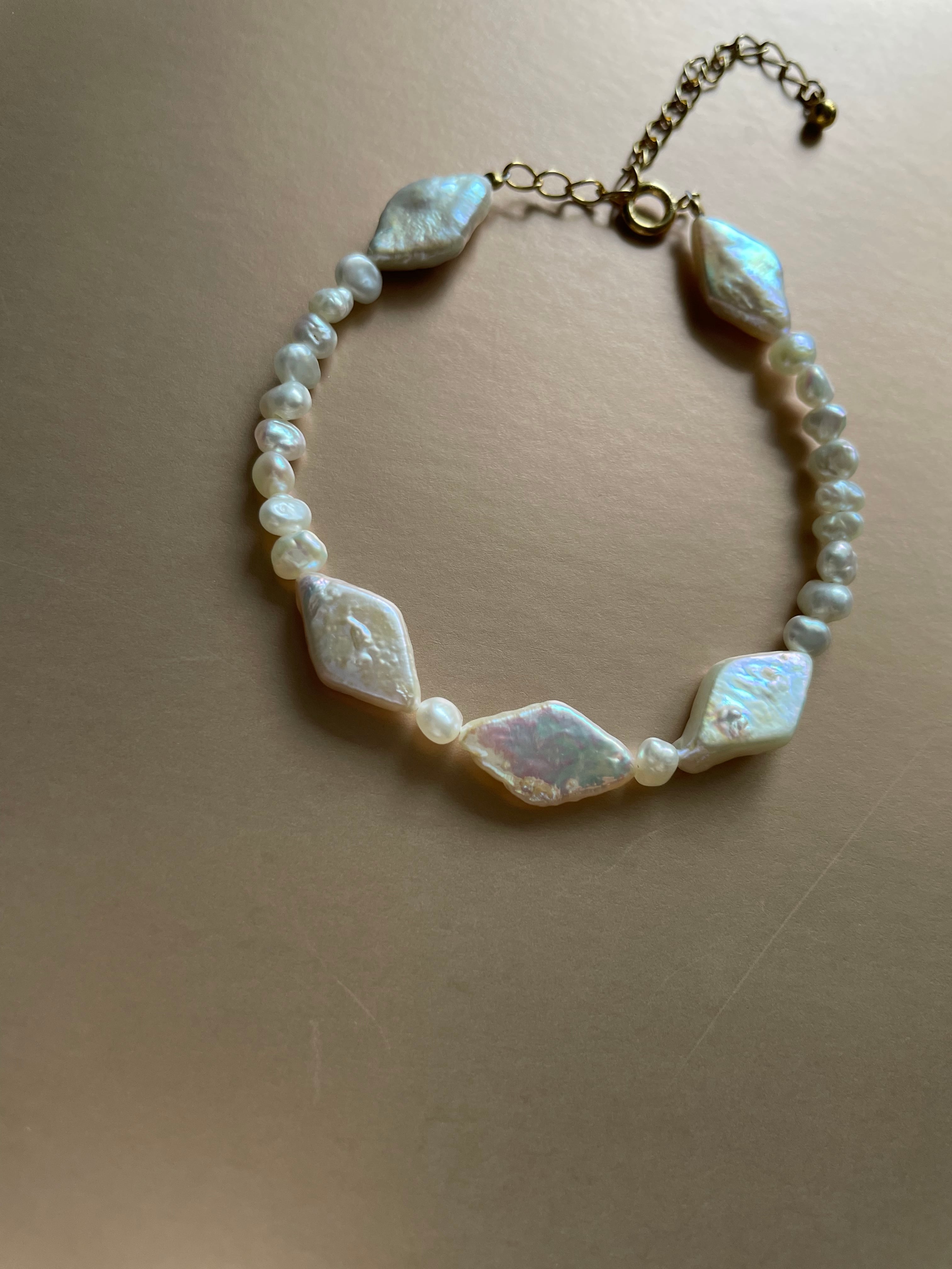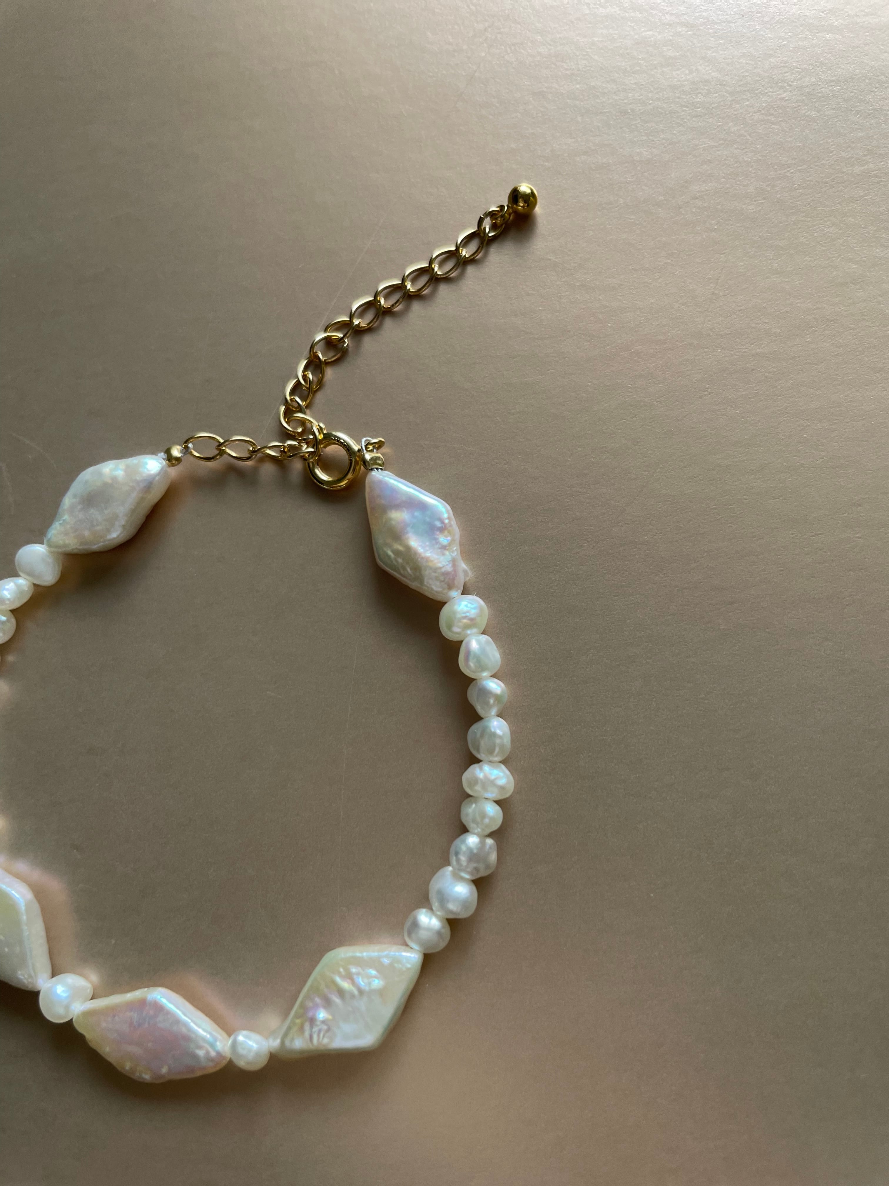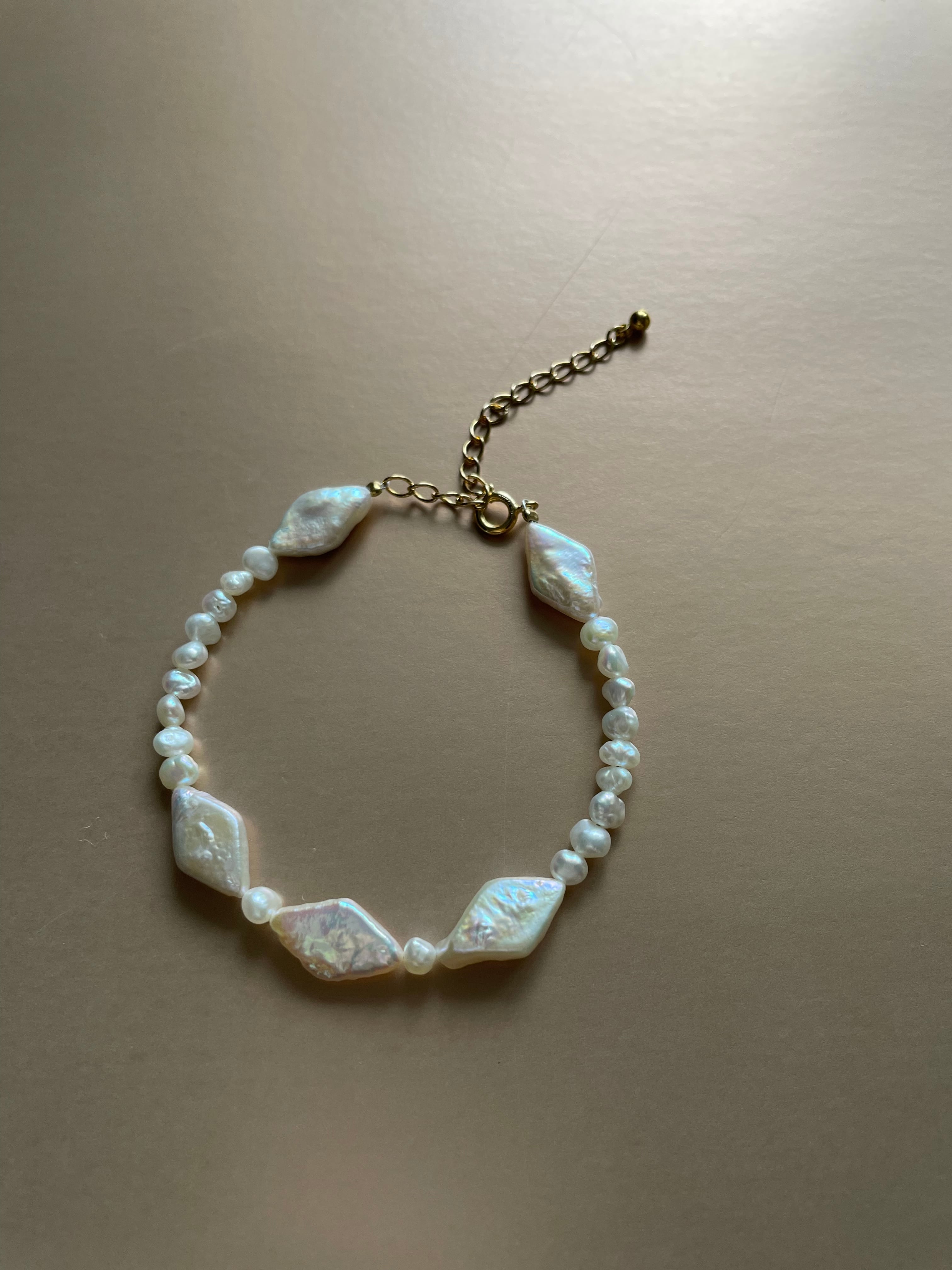 とても珍しいダイヤモンド型の淡水パールとbaby pearlのアジャスター式bracelet。