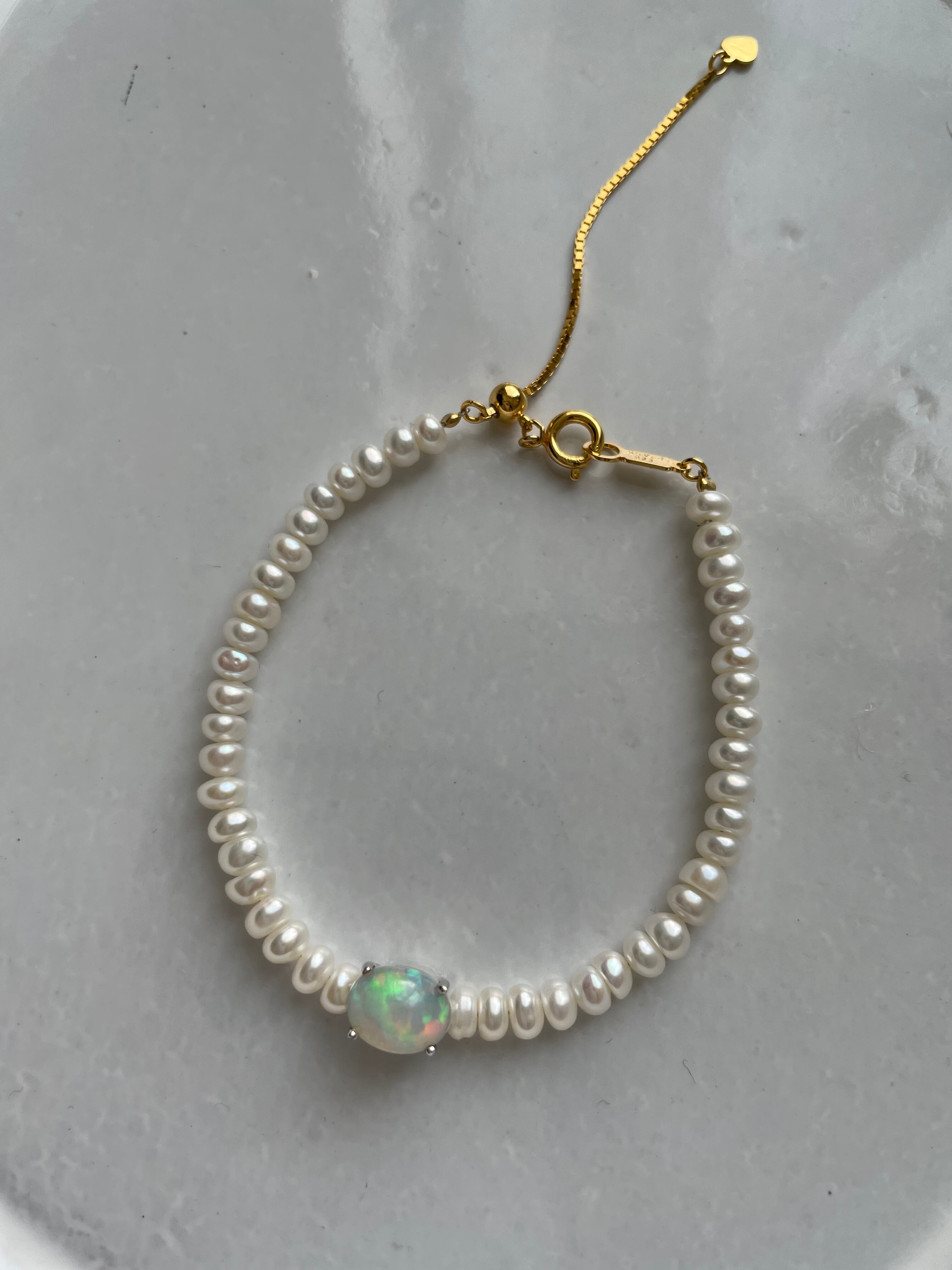 オパールは角度によって変化する虹色のきらめきがとても美しく、いつも目に入る手元を輝かせてくれるブレスレットです。