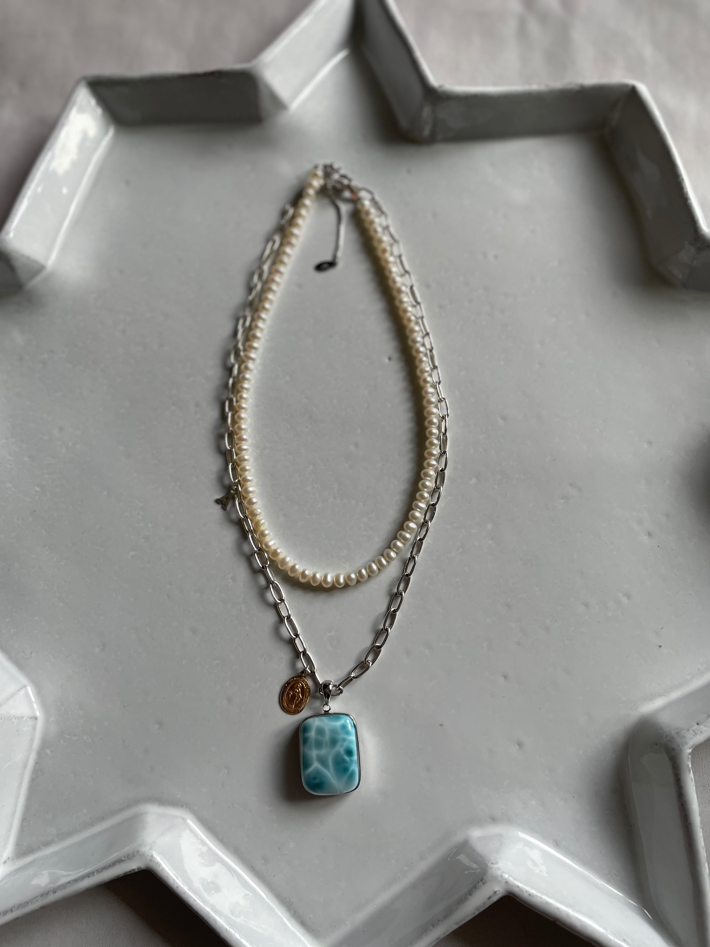 ラリマーの石のサイズもしっかりと存在感のある大きさなのでこれからの冬のざっくりしたタートルやニットなどに合わせて頂くと、バランス良く、とても綺麗なブルーが冬のニットスタイルに映えます。