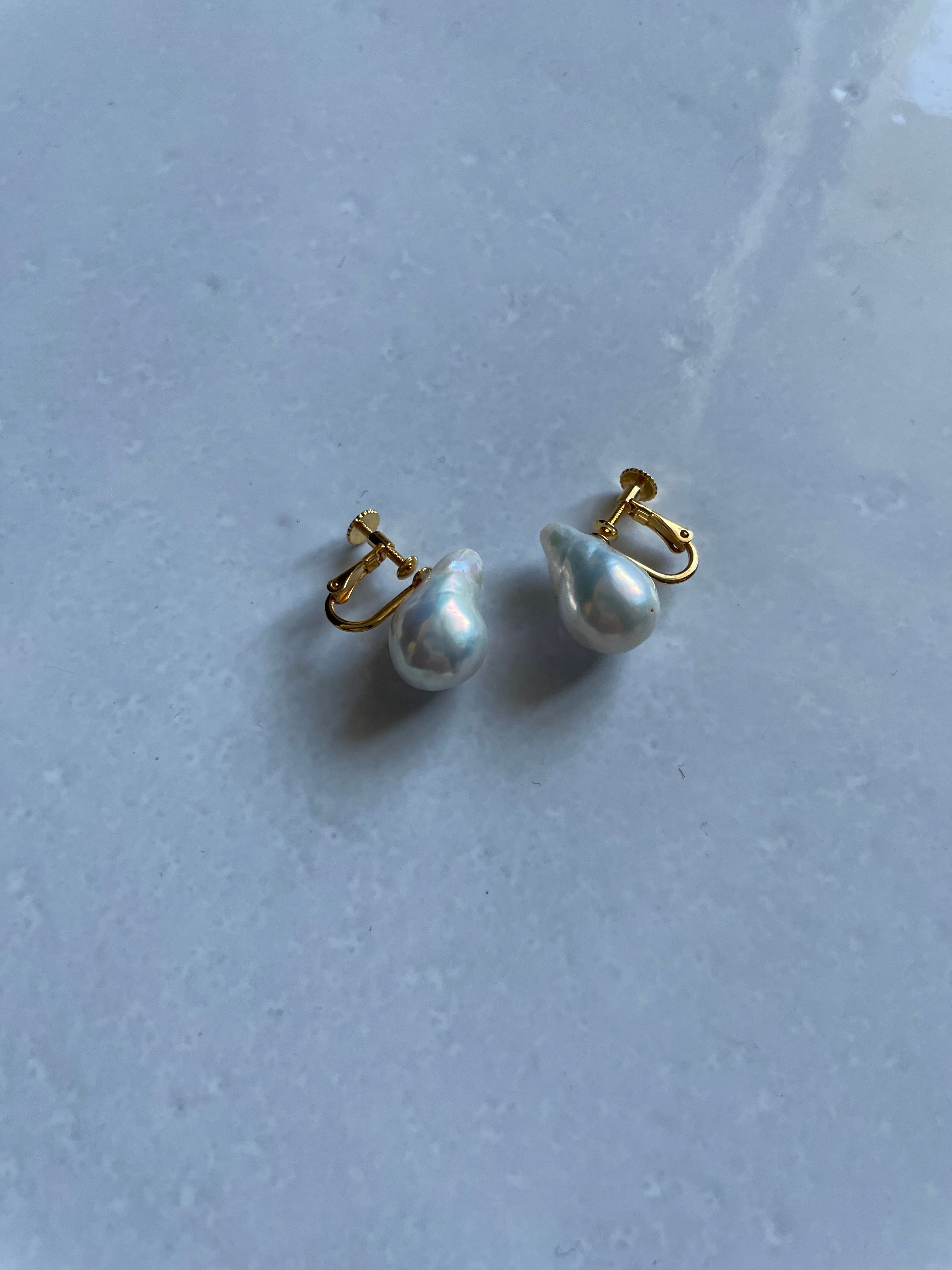 テリと艶がとても良い淡水バロックパールのドロップ型でデイリー使いにぴったりのサイズ感のイヤリングです。