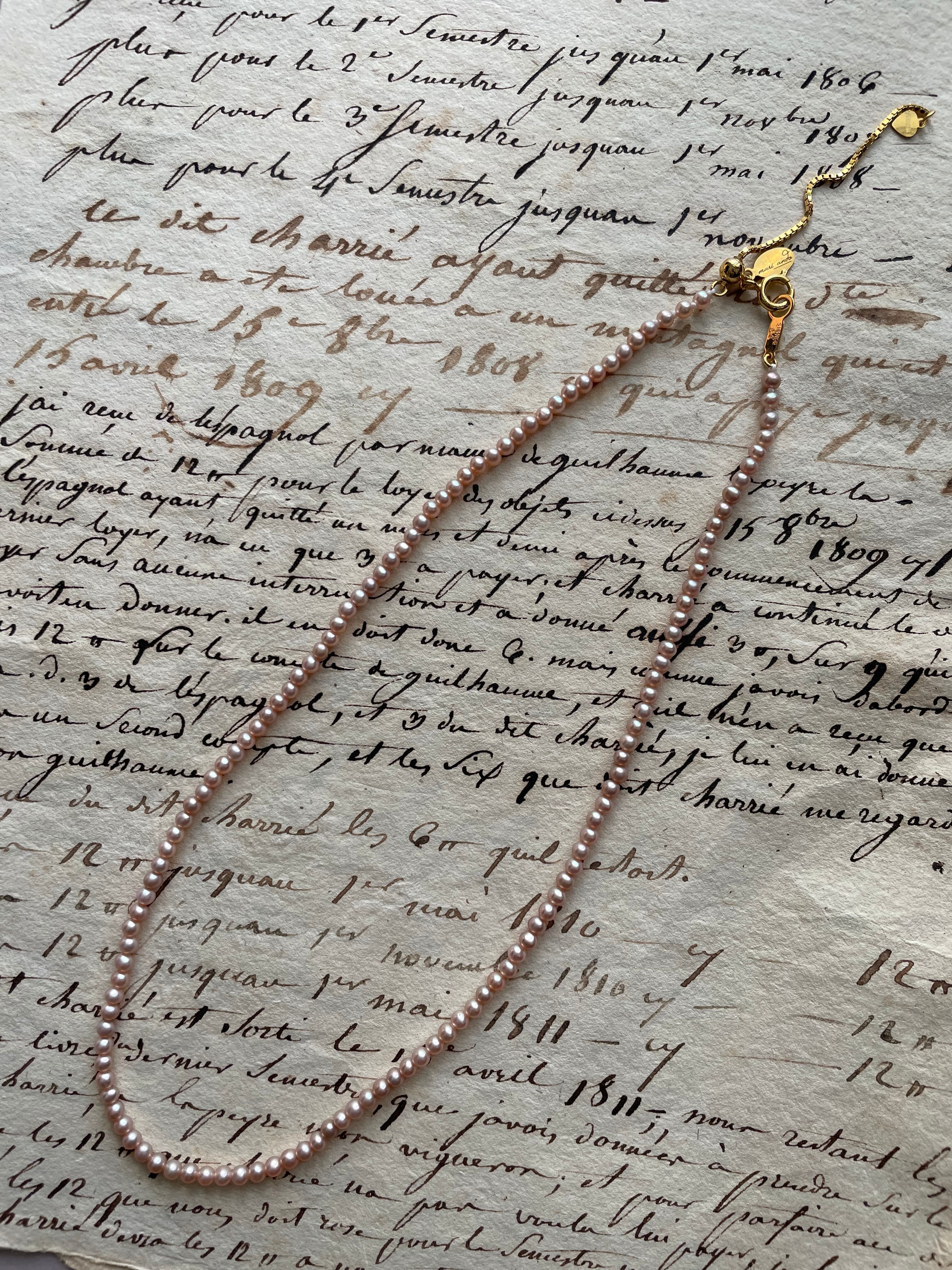 そんなテリも艶も抜群な上品なピンク系のナチュラルカラーのシンプルなネックレスはチョーカー風にもアジャスターで調節して長くもできます。