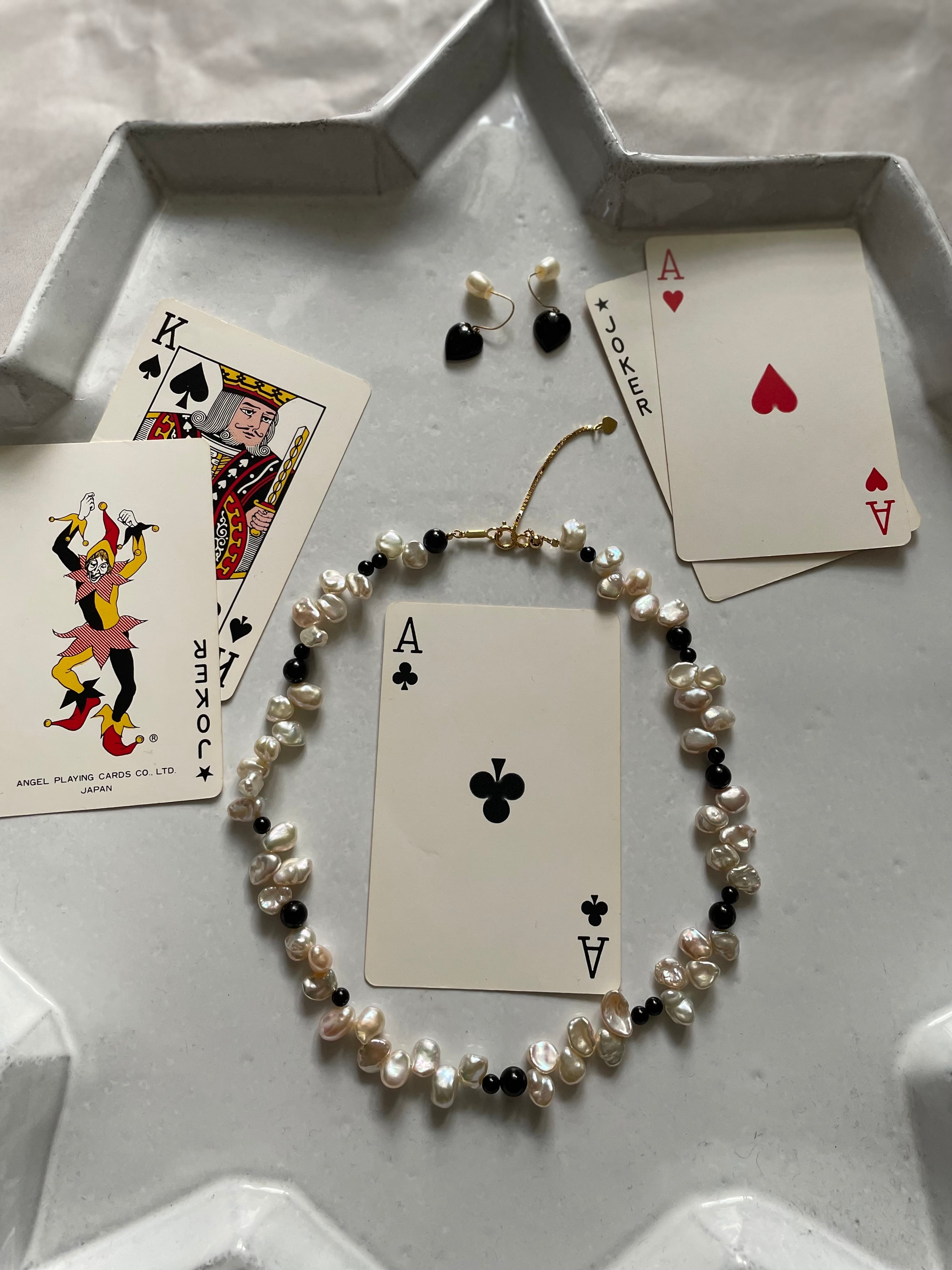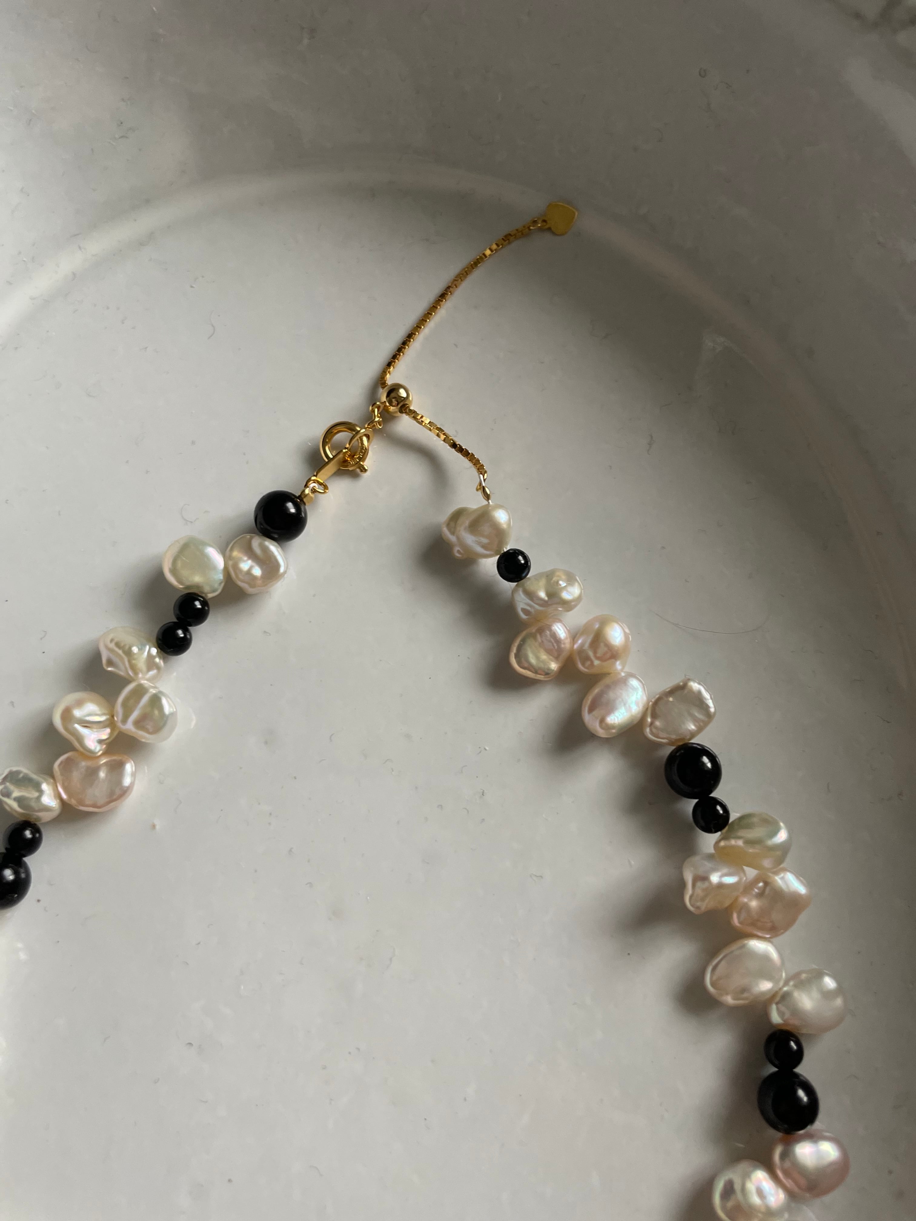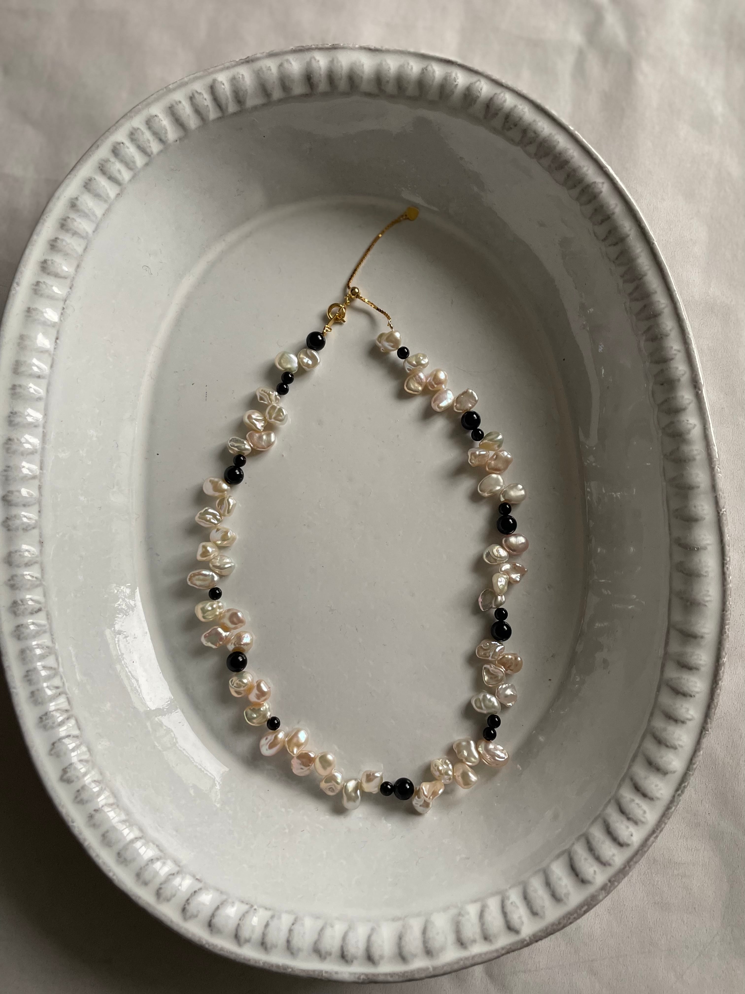 約8mmの花びらの様なクレオパトラ型の淡水パールとジェットをイレギュラーに組み合わせて、モノトーンで甘過ぎないネックレスに組み上げました。