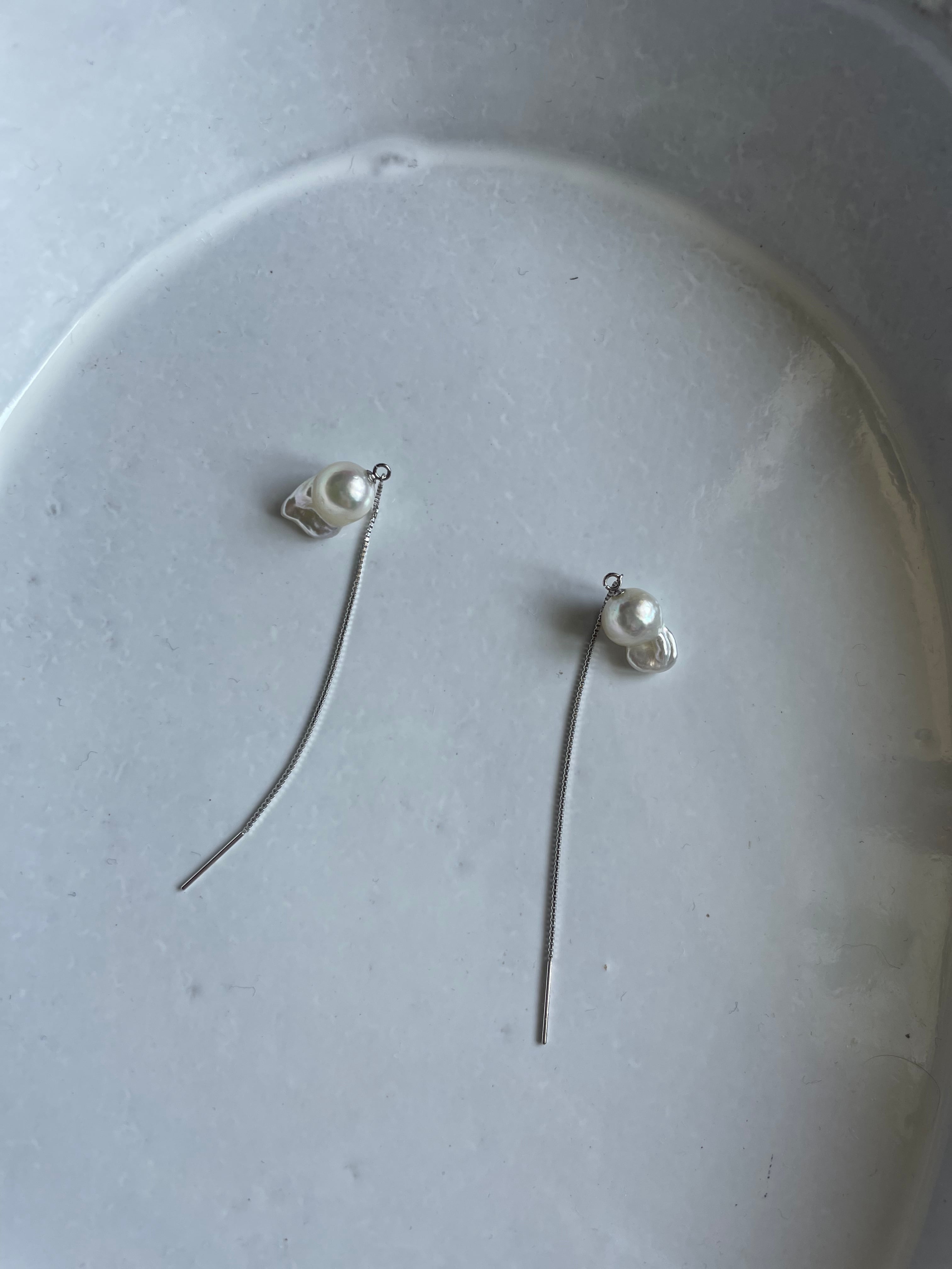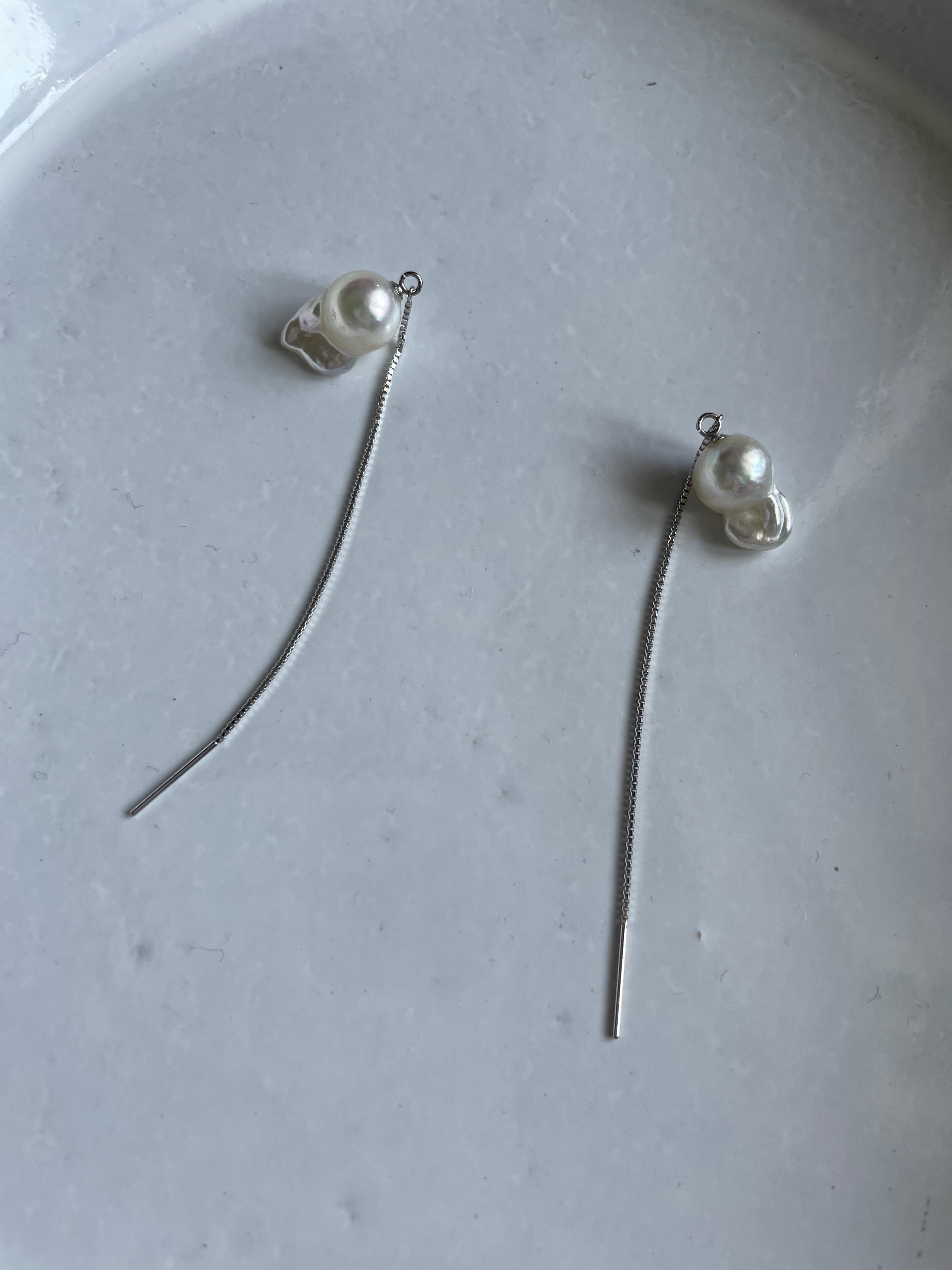 アコヤのバロックパールはウサギのような金魚のような形のとても稀少なアコヤバロックパールとベネチアンチェーンのピアスです。
