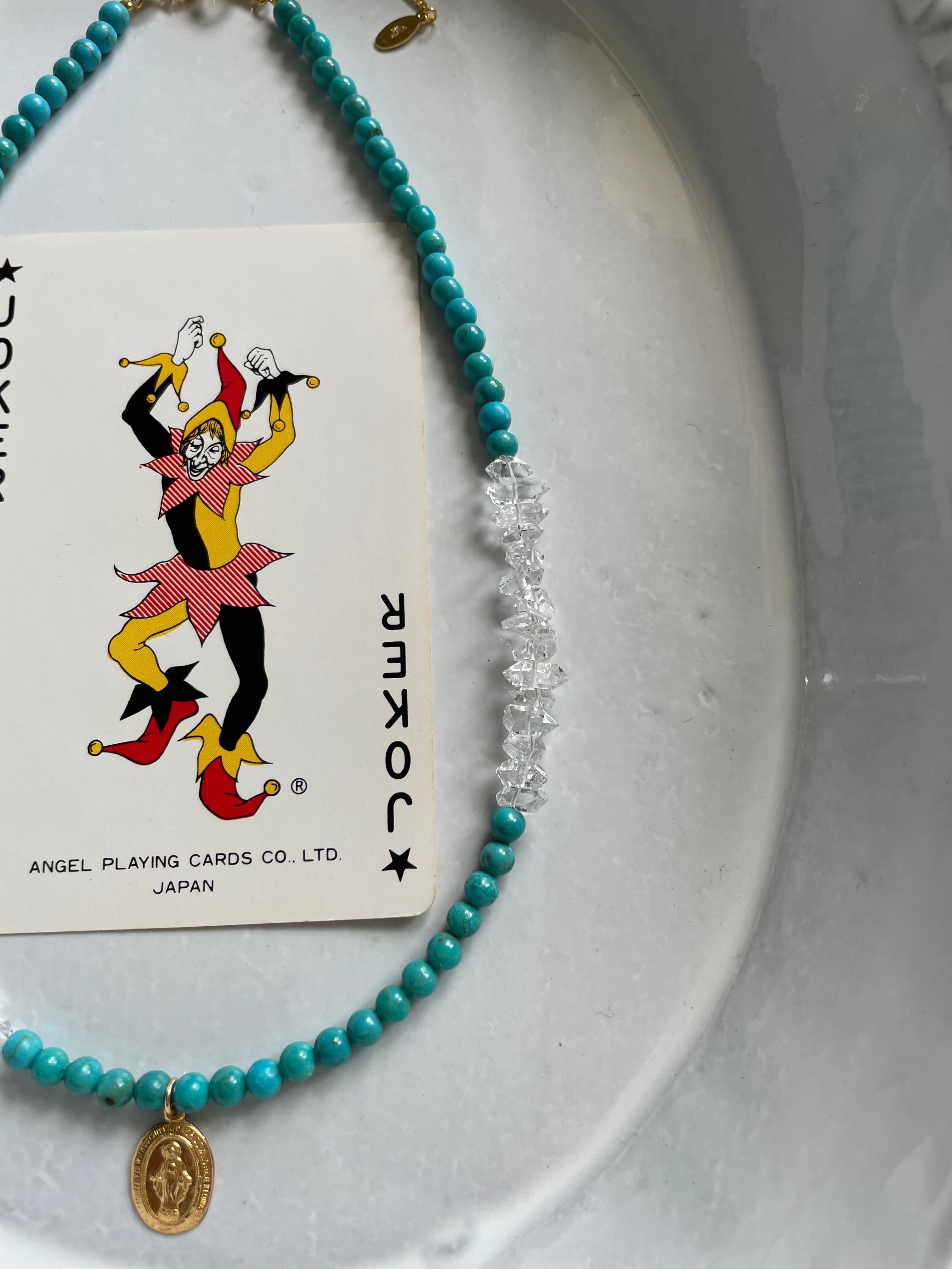 ダブルターミネーティッドという大変希少な両方が尖った約3.5〜4.0㎜の水晶(両剣水晶)と約3.5㎜upのターコイズのネックレスです。