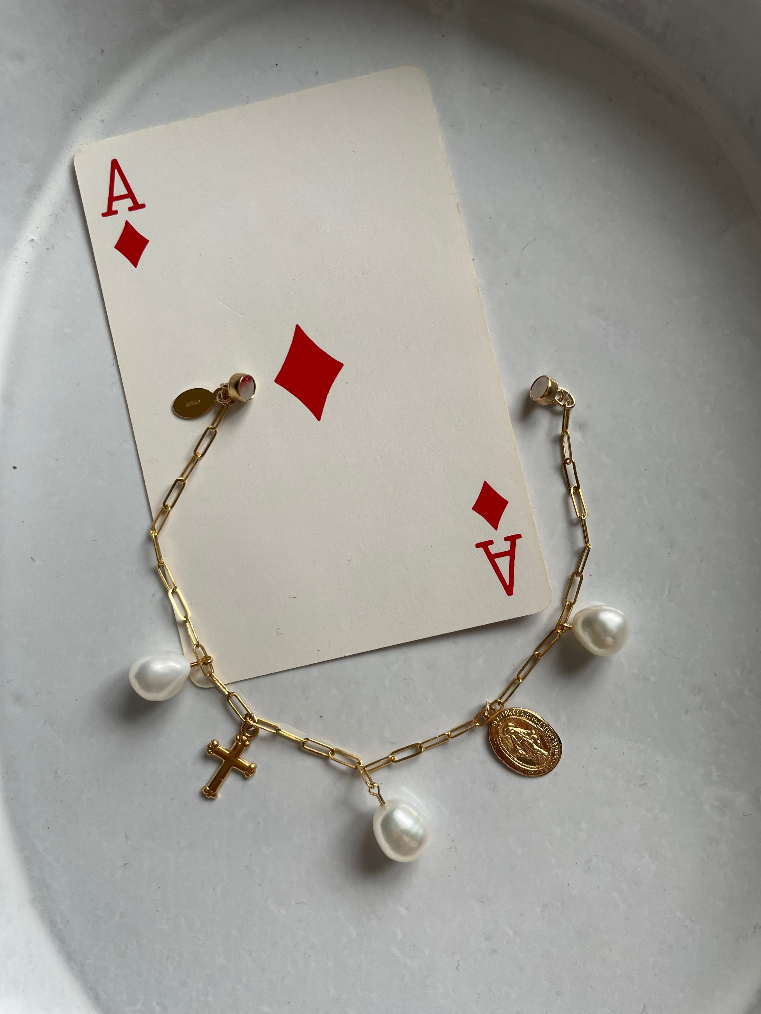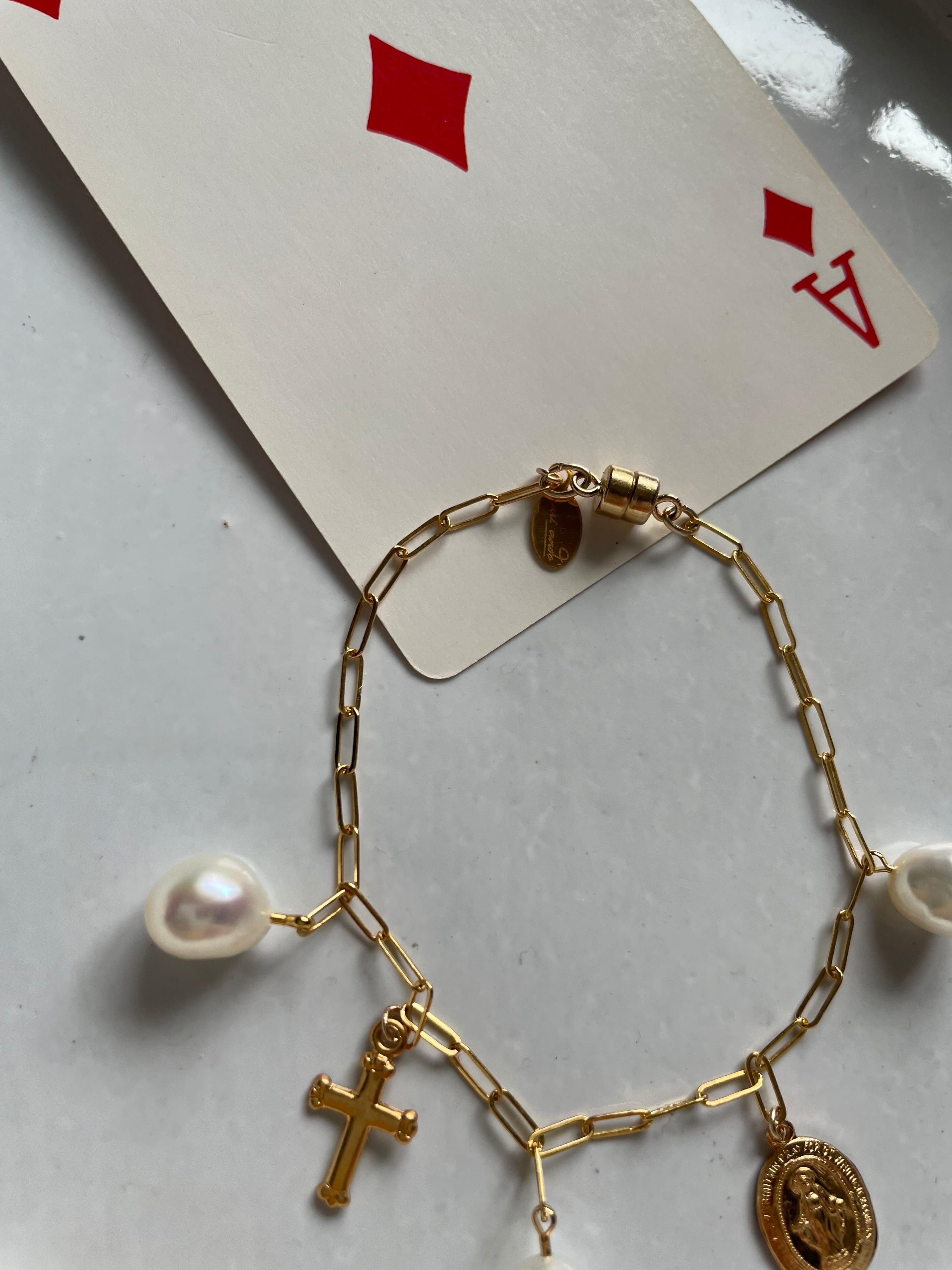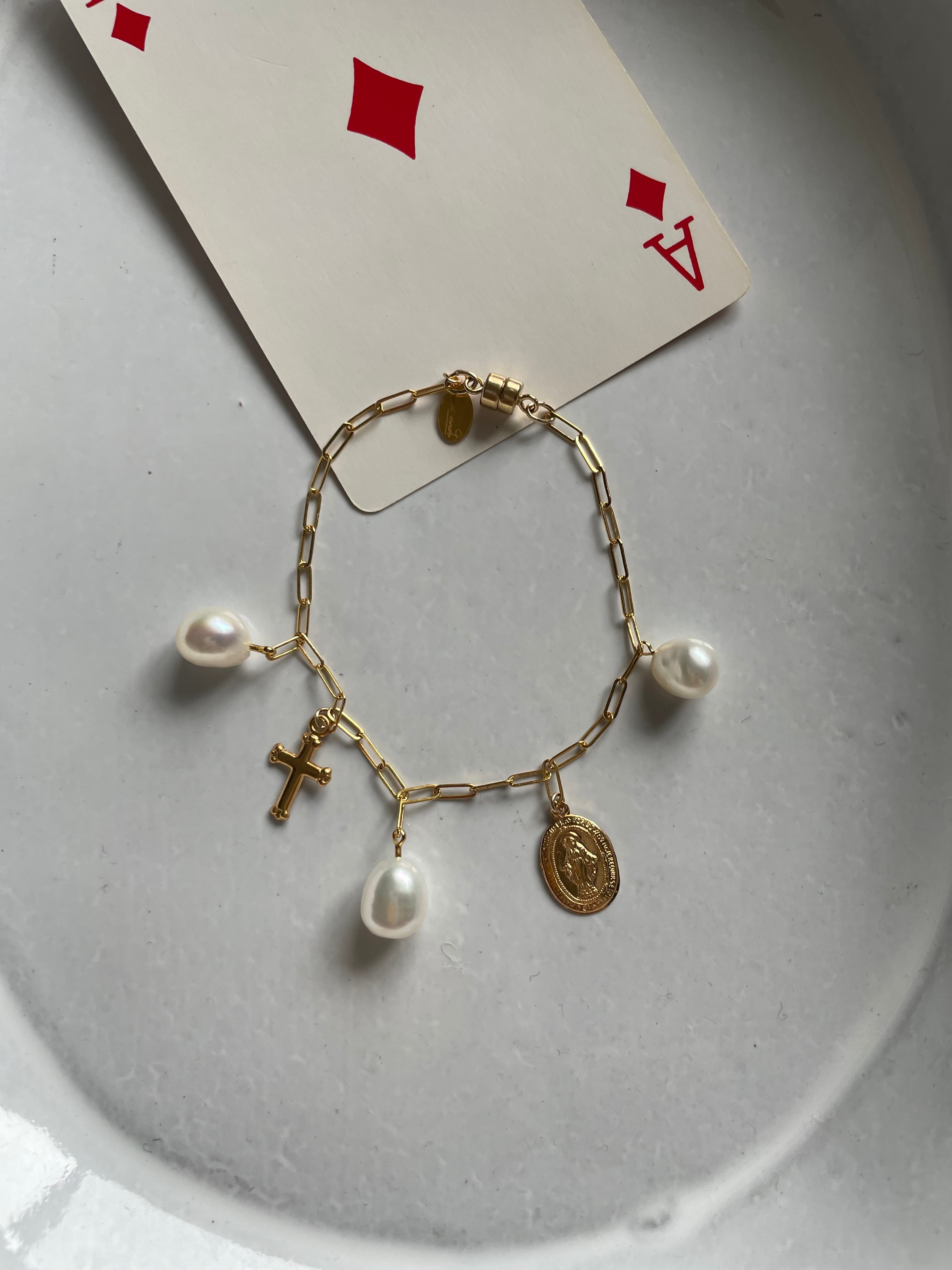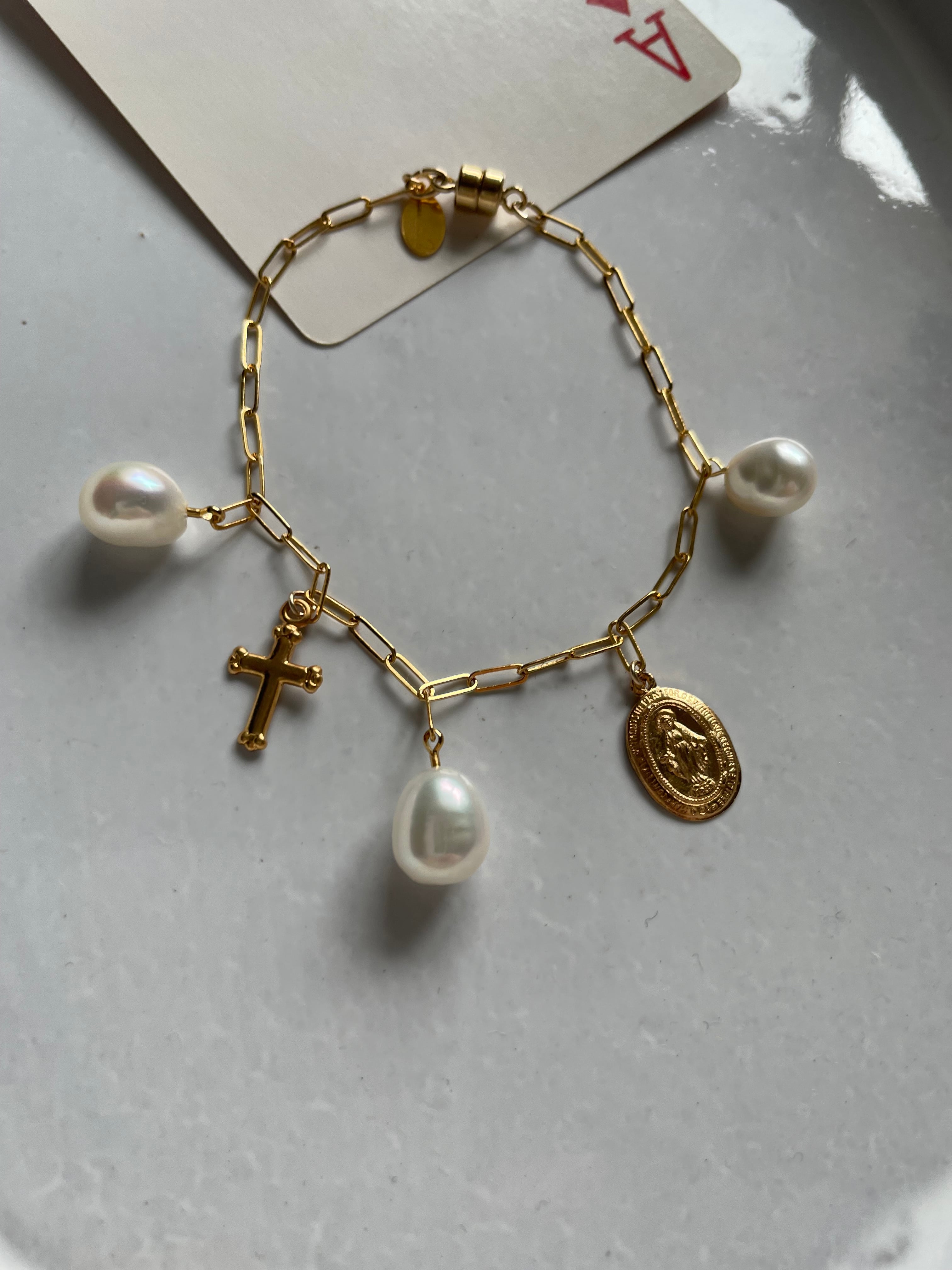 14KGFのチェーンに14KGFメダイチャーム、クロスチャーム、淡水パールを付けたブレスレットです。