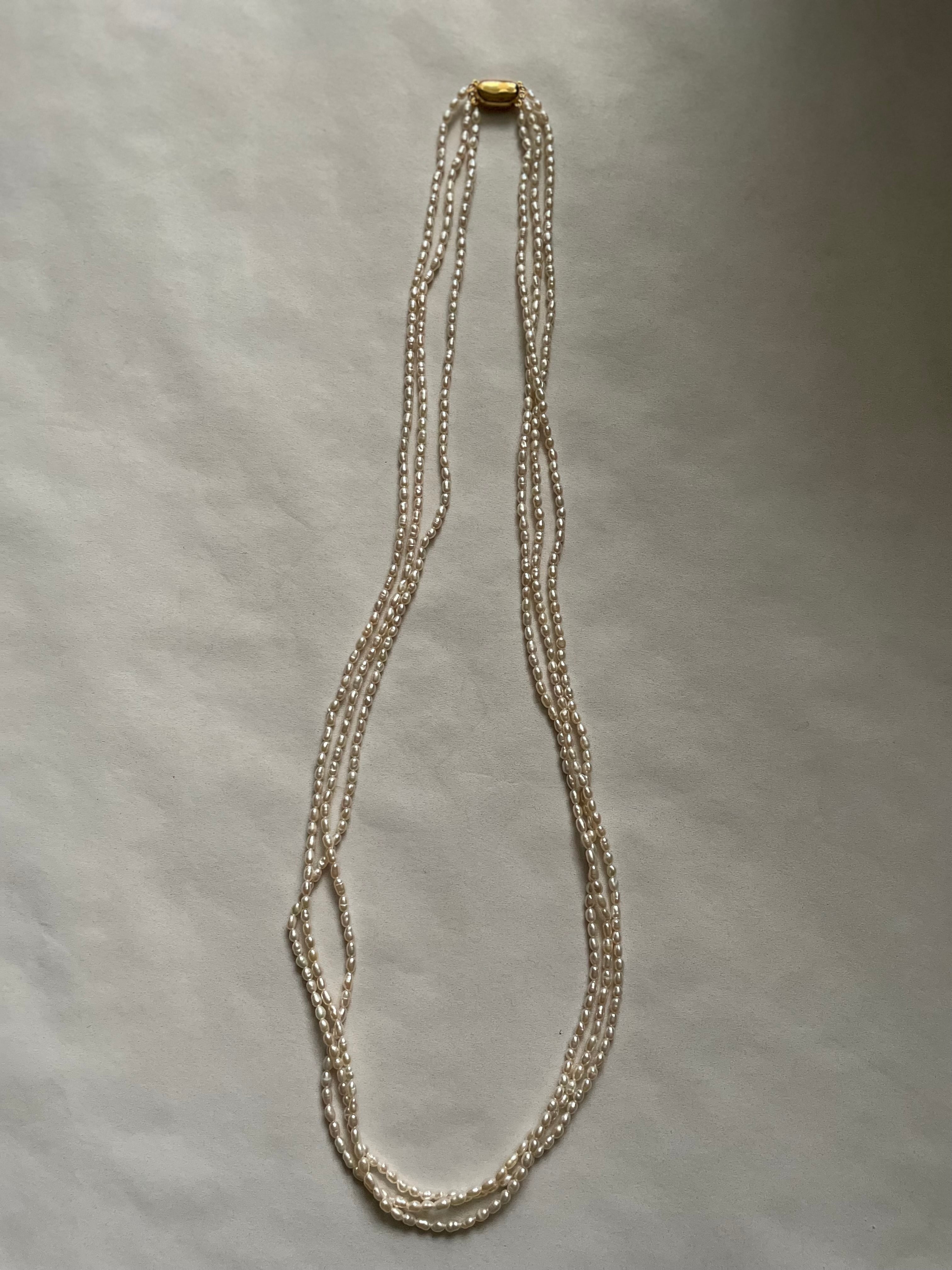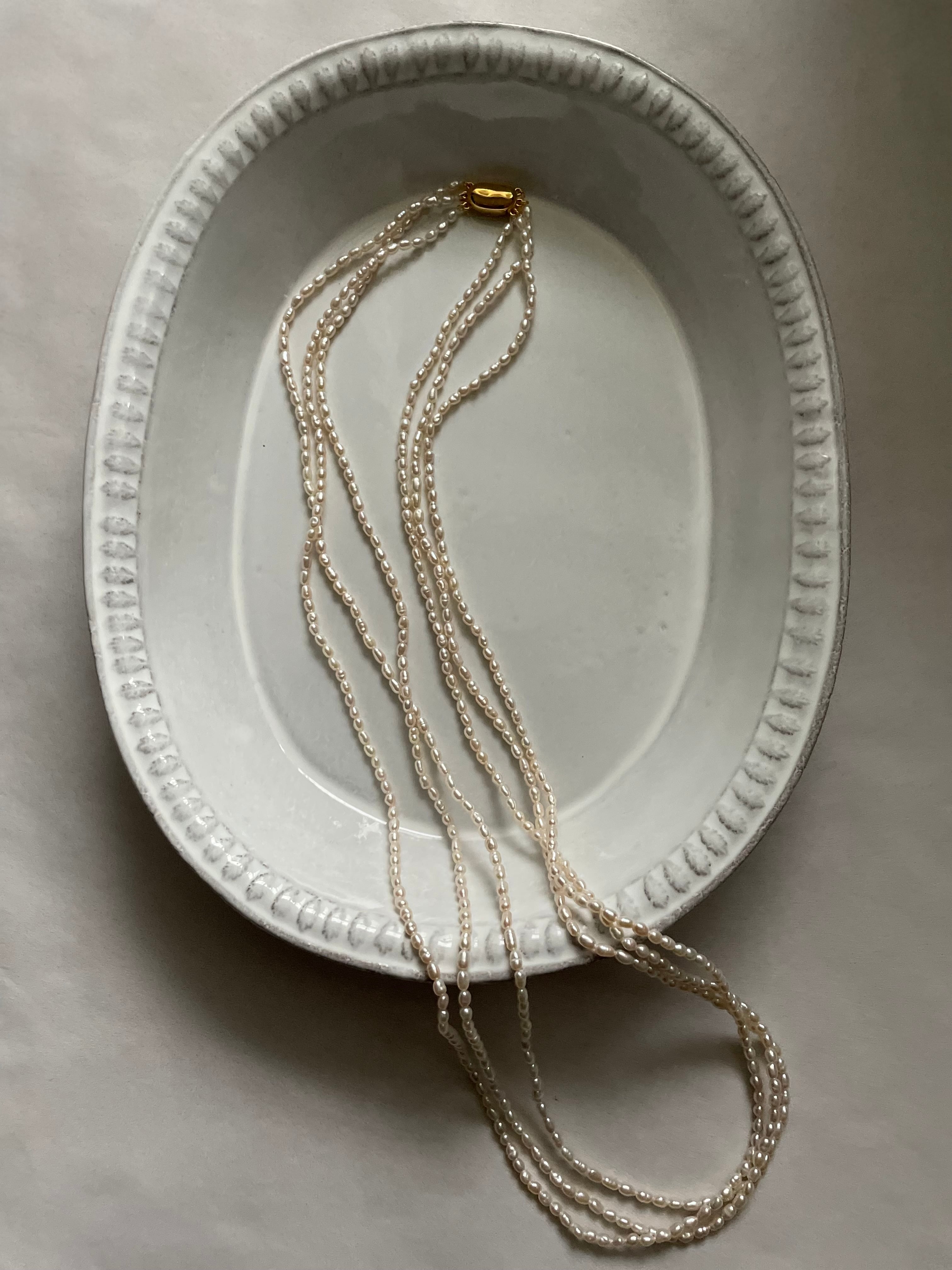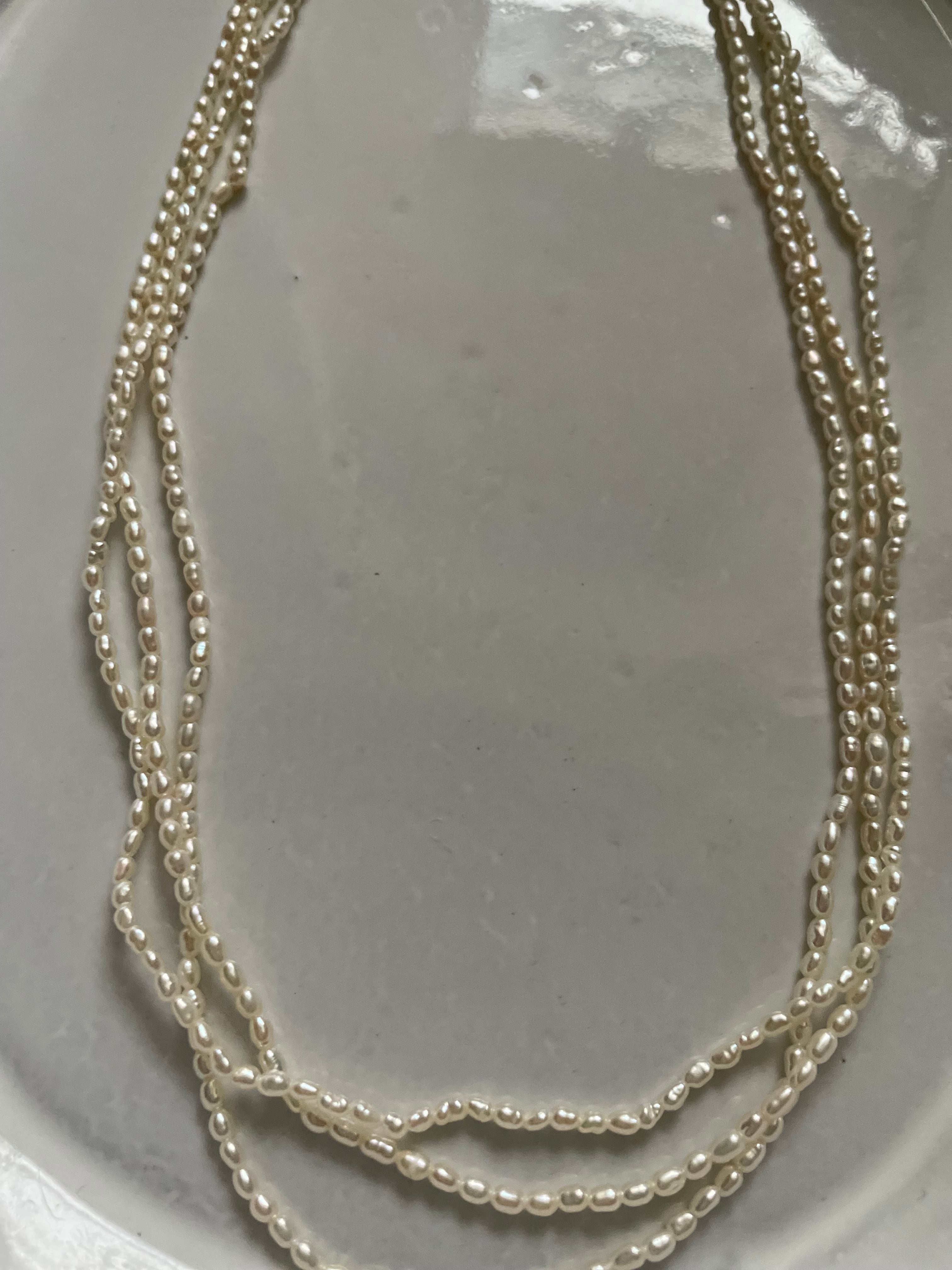 ここ最近はとても希少となってしまい、更に人気が高まっているbabyサイズの約4×2.5㎜upライスパールを贅沢に3連に繋ぎ、長さも77㎝で、4枚目の写真の様に2周させて6連というボリュームにもできるようにしました!