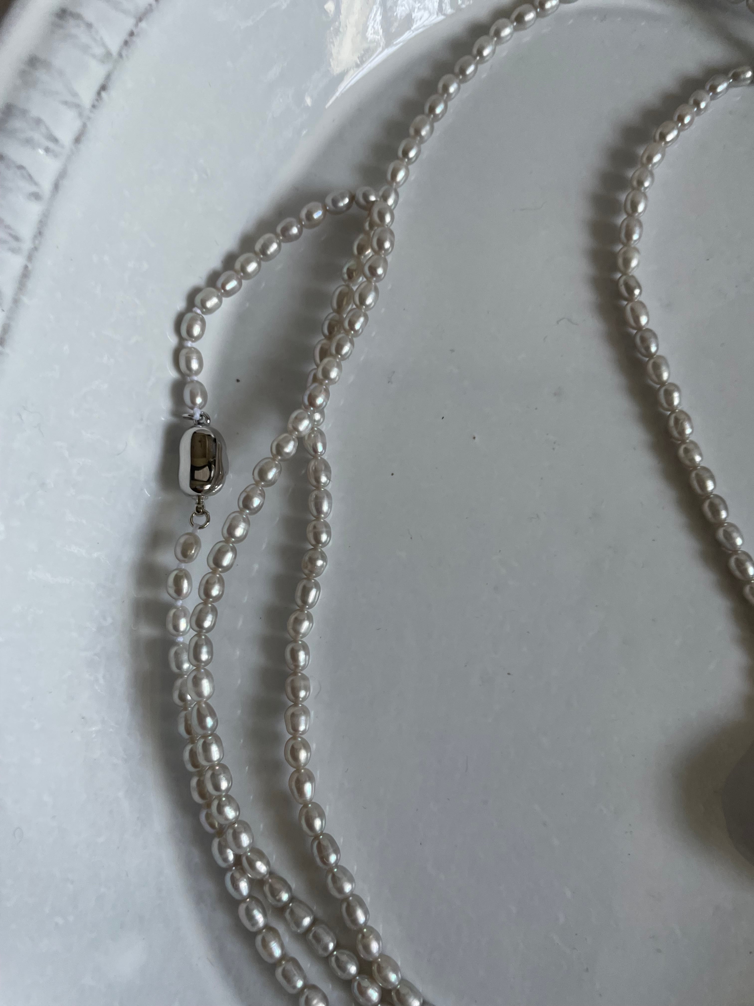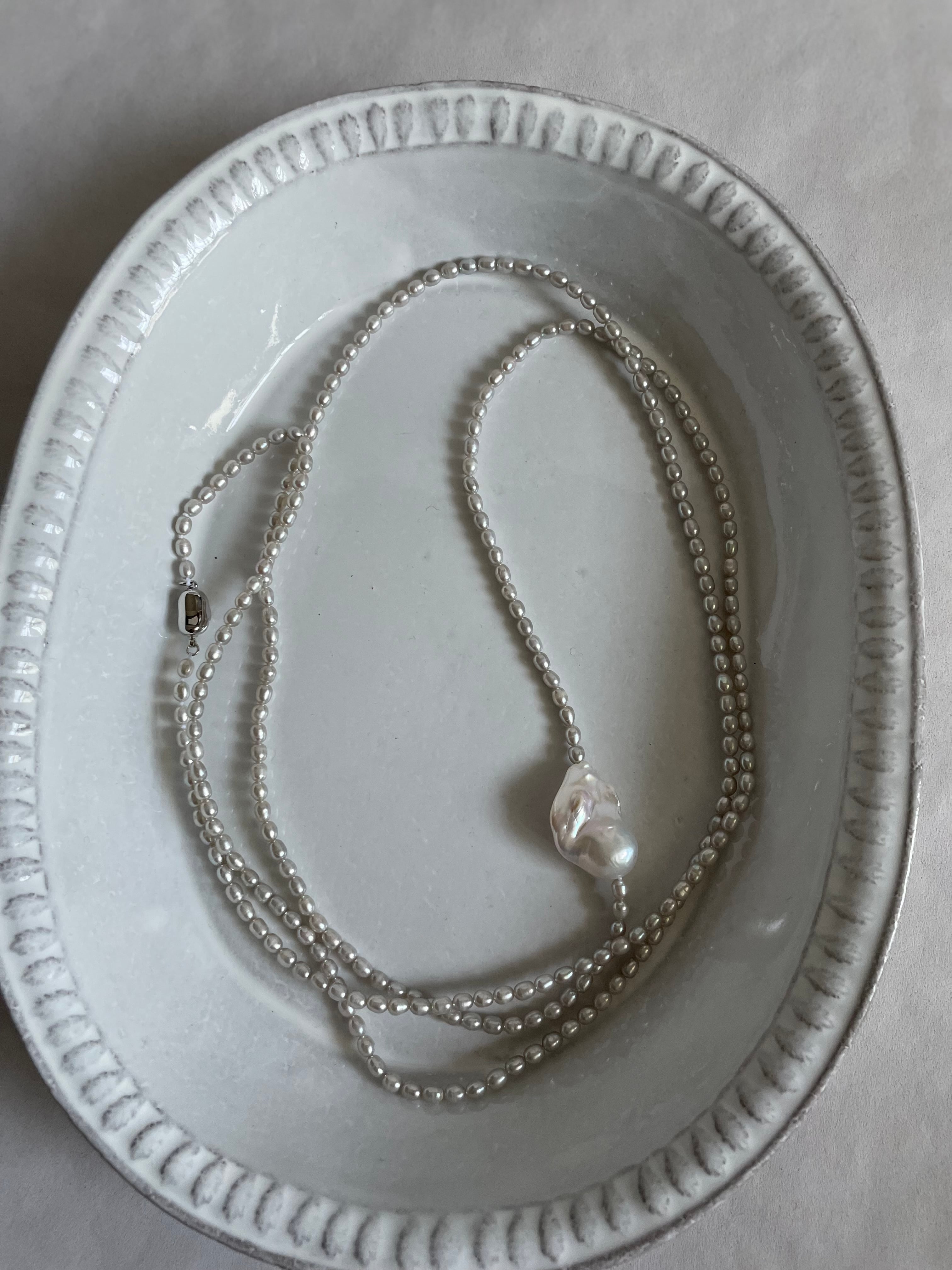 silver色の希少な小粒のライスpearlを贅沢に120センチの長さに組み上げて、大振りの艶テリの良いバロックパールを組み込みました。