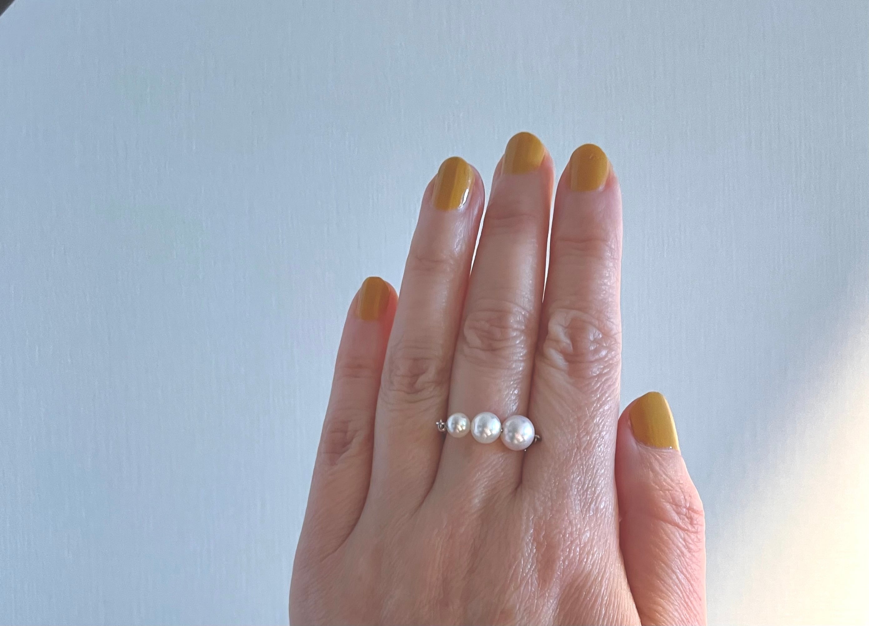 大中小の本当にテリも艶も最高に美しいアコヤパールを3つ厳選してK18WGのチェーンで少しクールで大人っぽいリングに仕上げました。