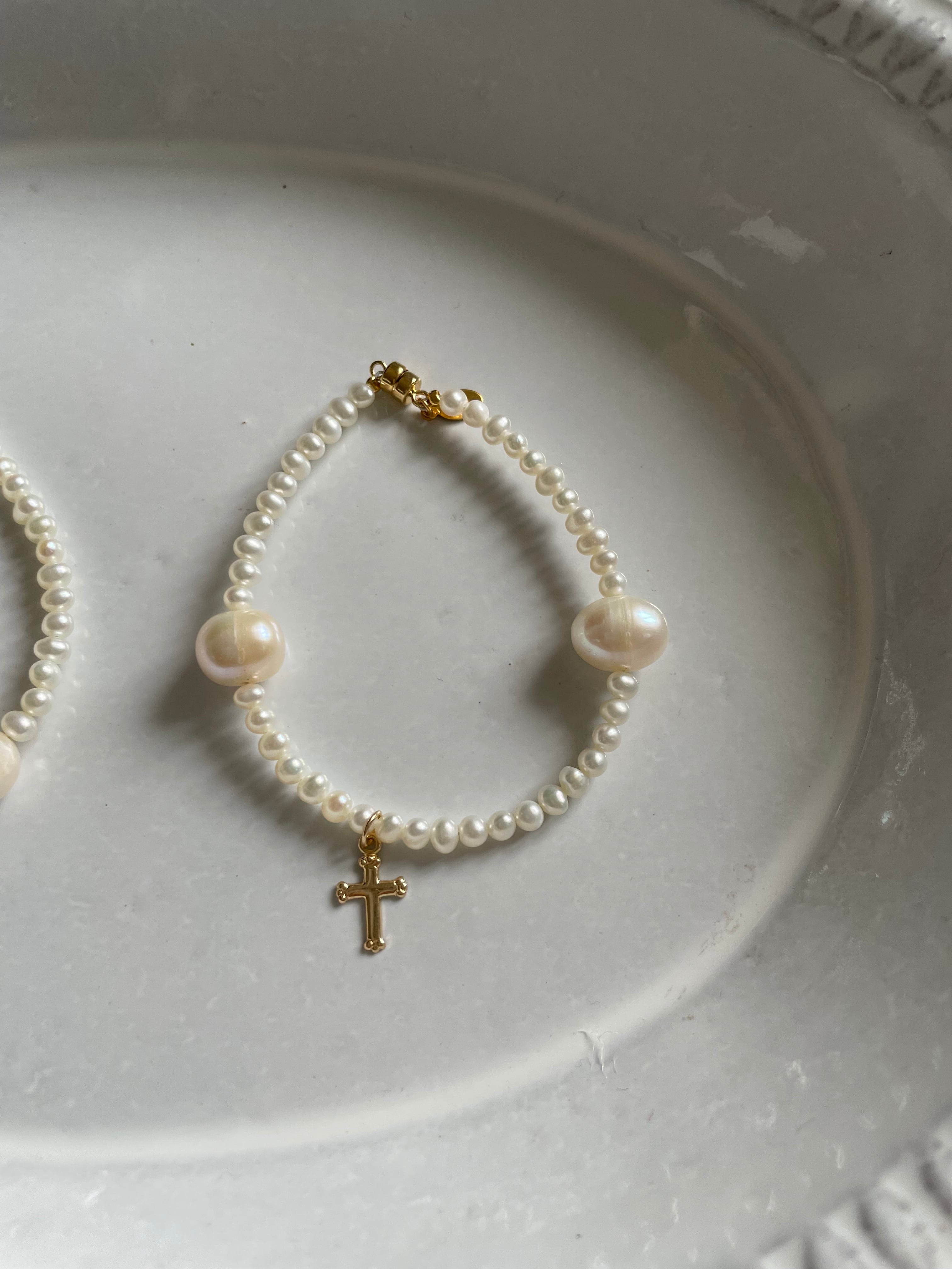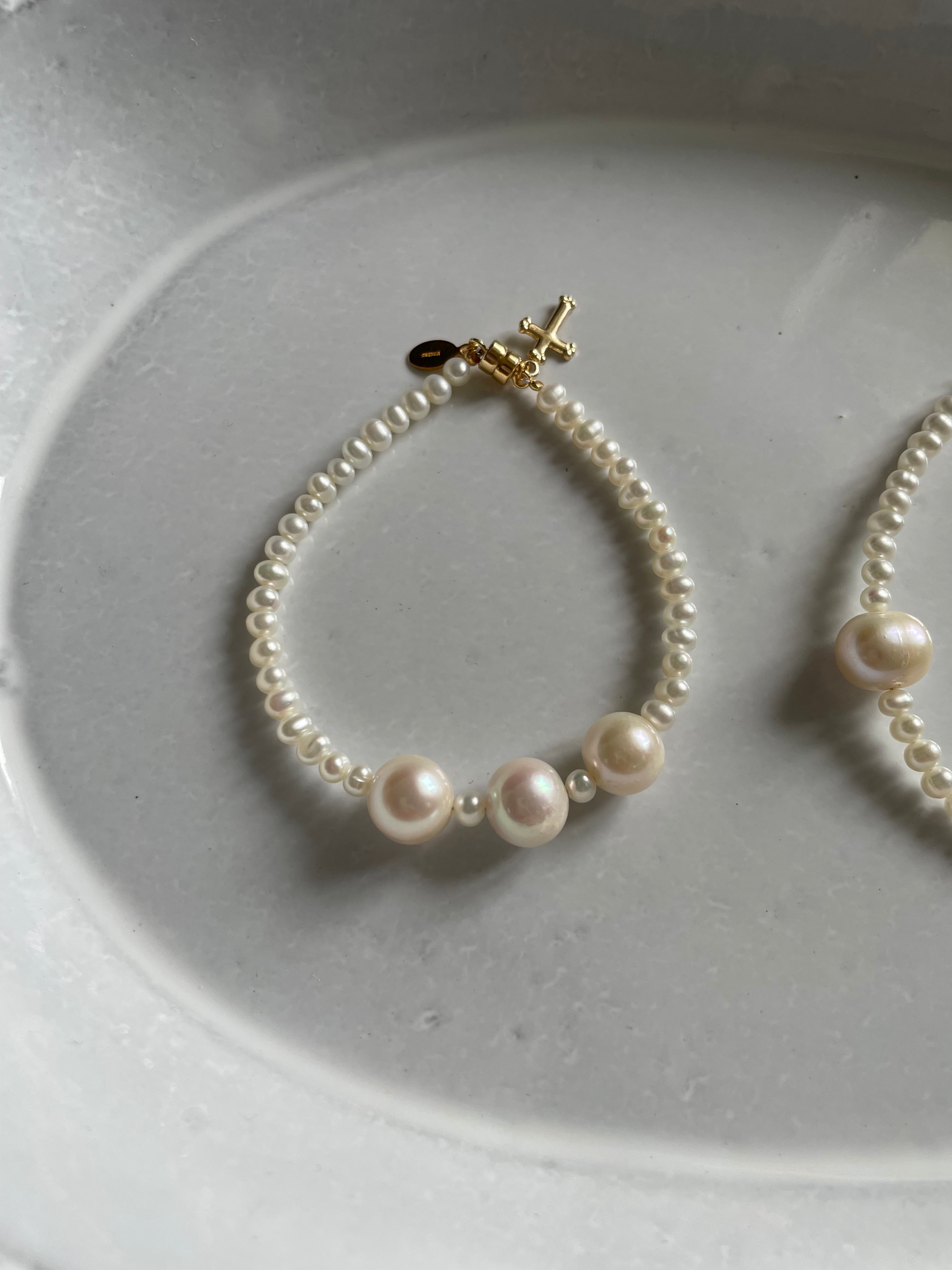 大小のpearlをmixさせて、クロスチャームをおつけしたマグネットブレスレットです。
