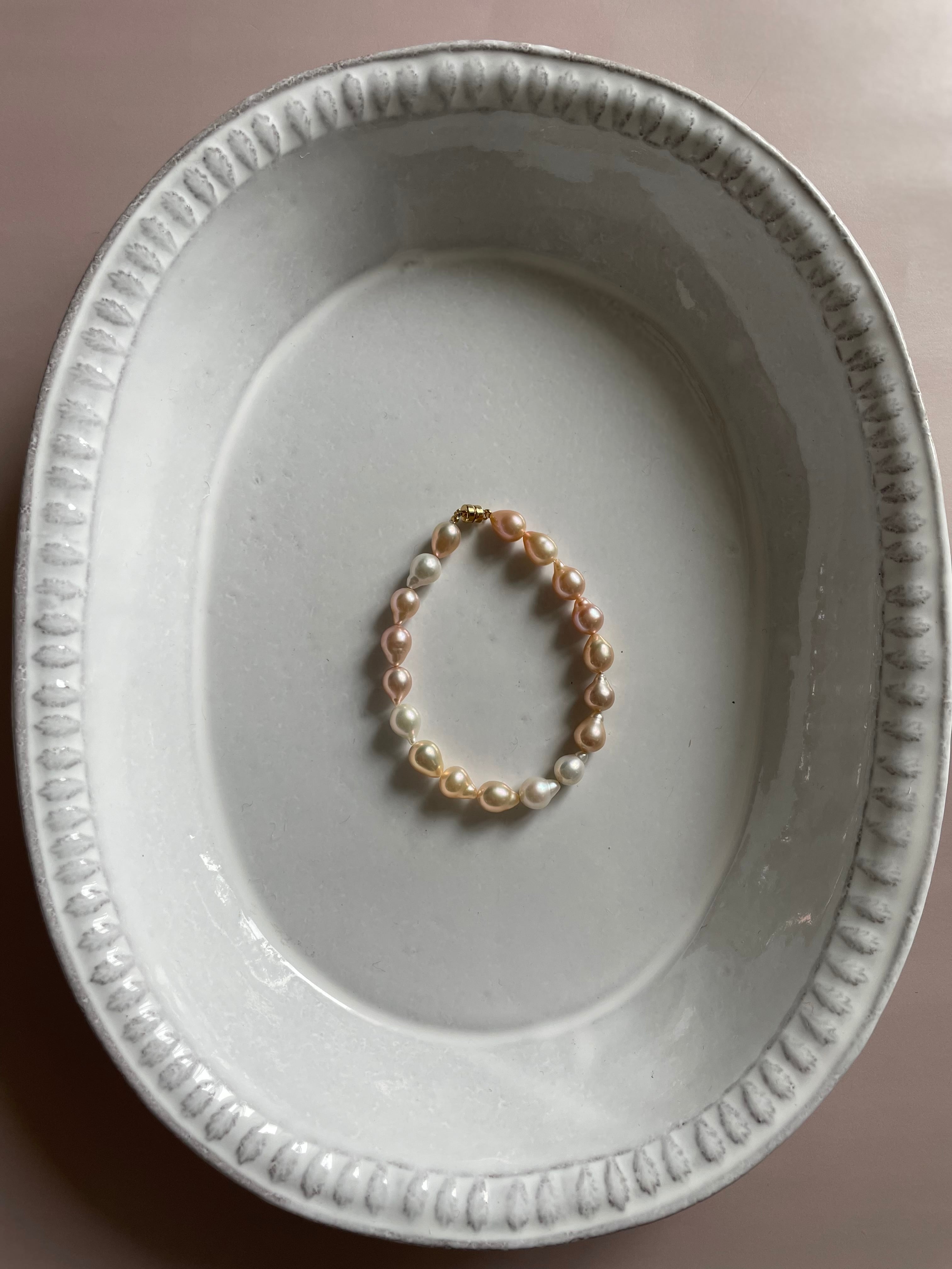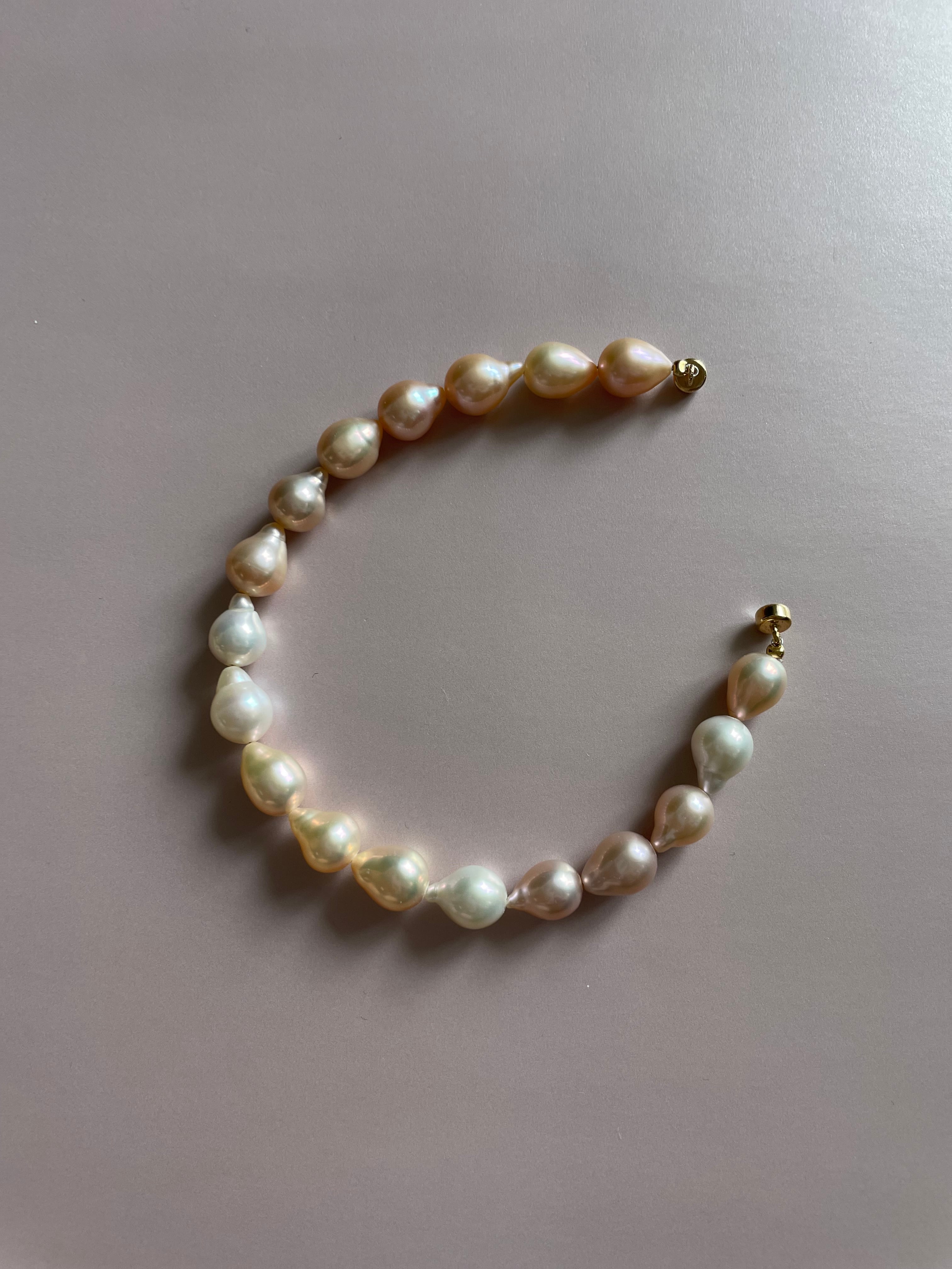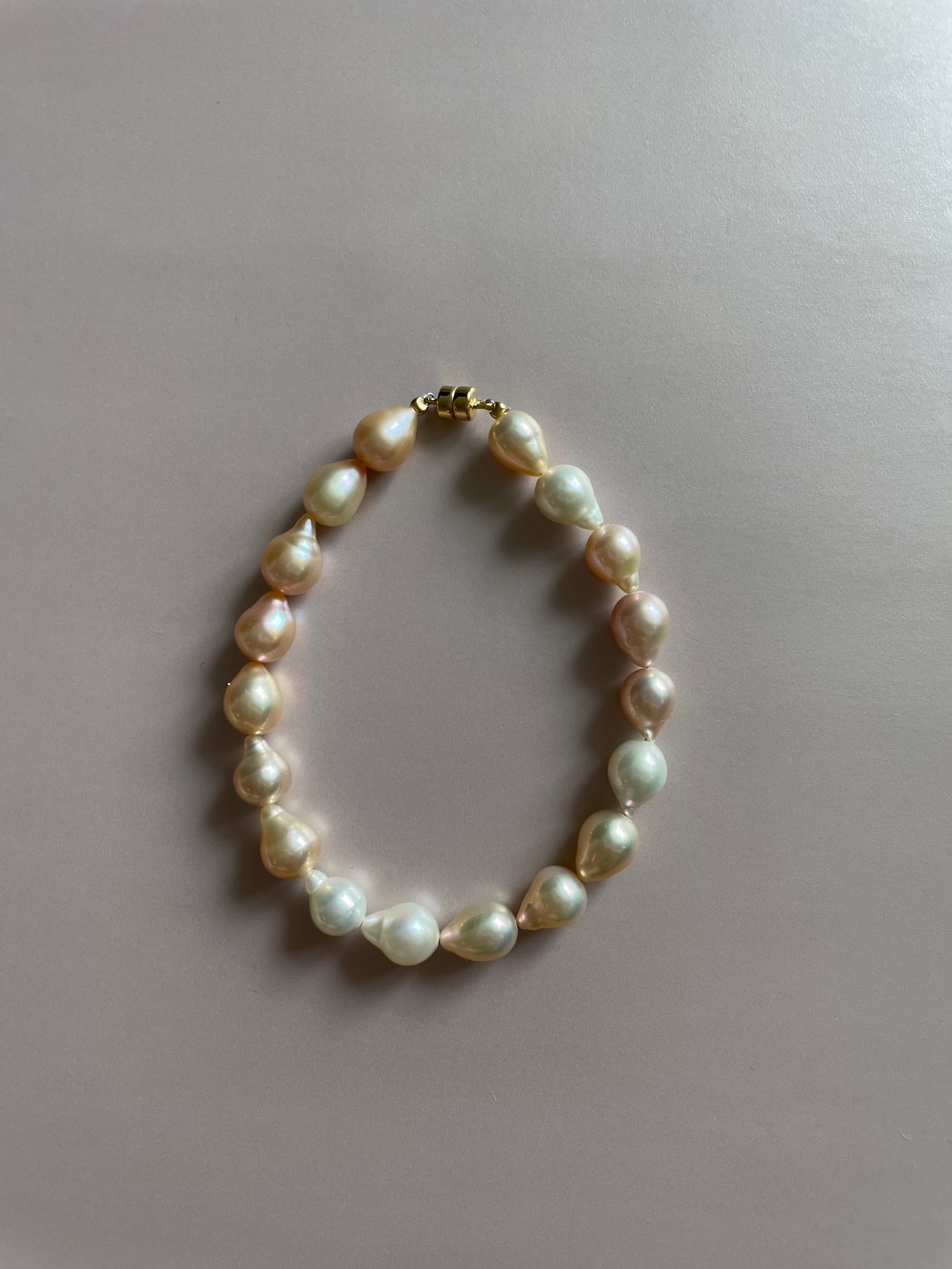 ほんのりピンクががった天然のcolorの白からピンク、シャンパンピンクのグラデーションがとても美しいドロップパールを繋げてブレスレットにしました。
