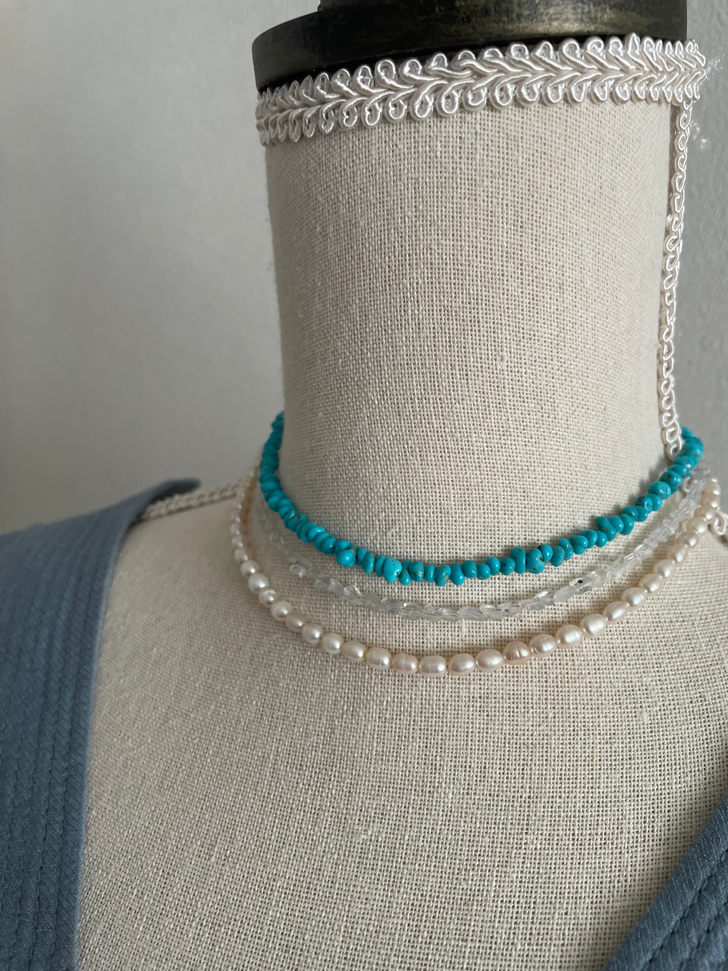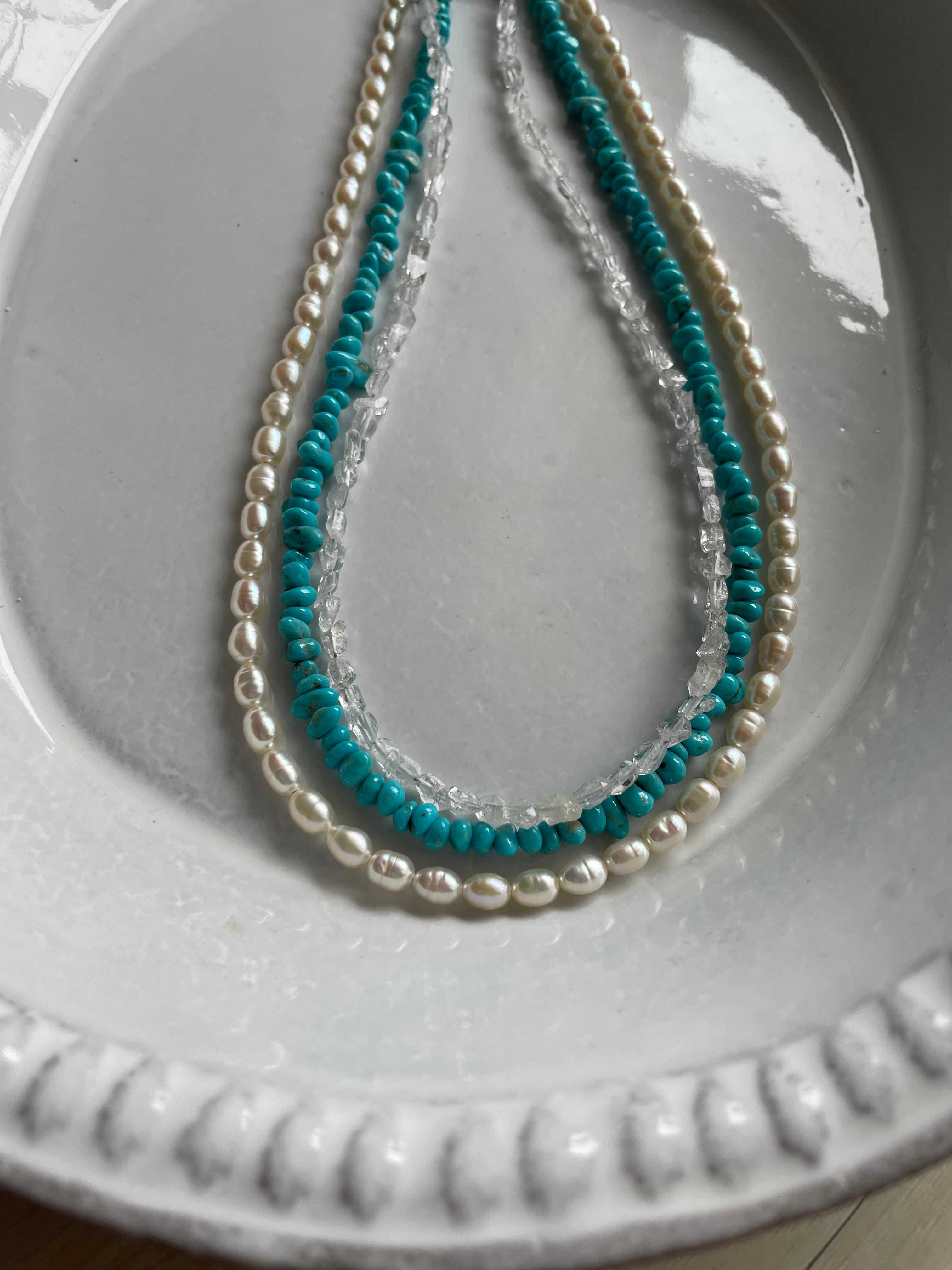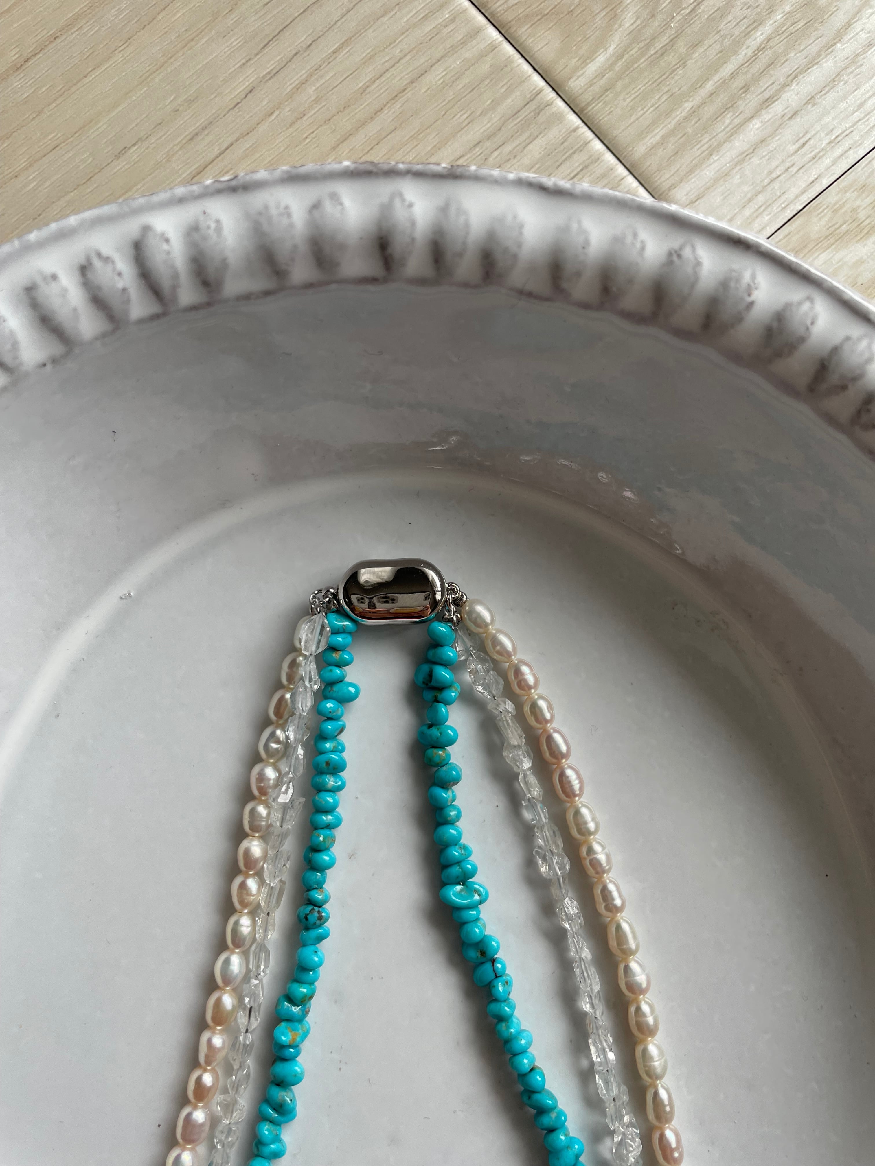 ダブルターミネーティッドという大変希少な両方が尖った約3.5〜4.0㎜の水晶(両剣水晶)とターコイズと3.5〜4.0㎜のbabypearlとのtriplemixnecklaceです。