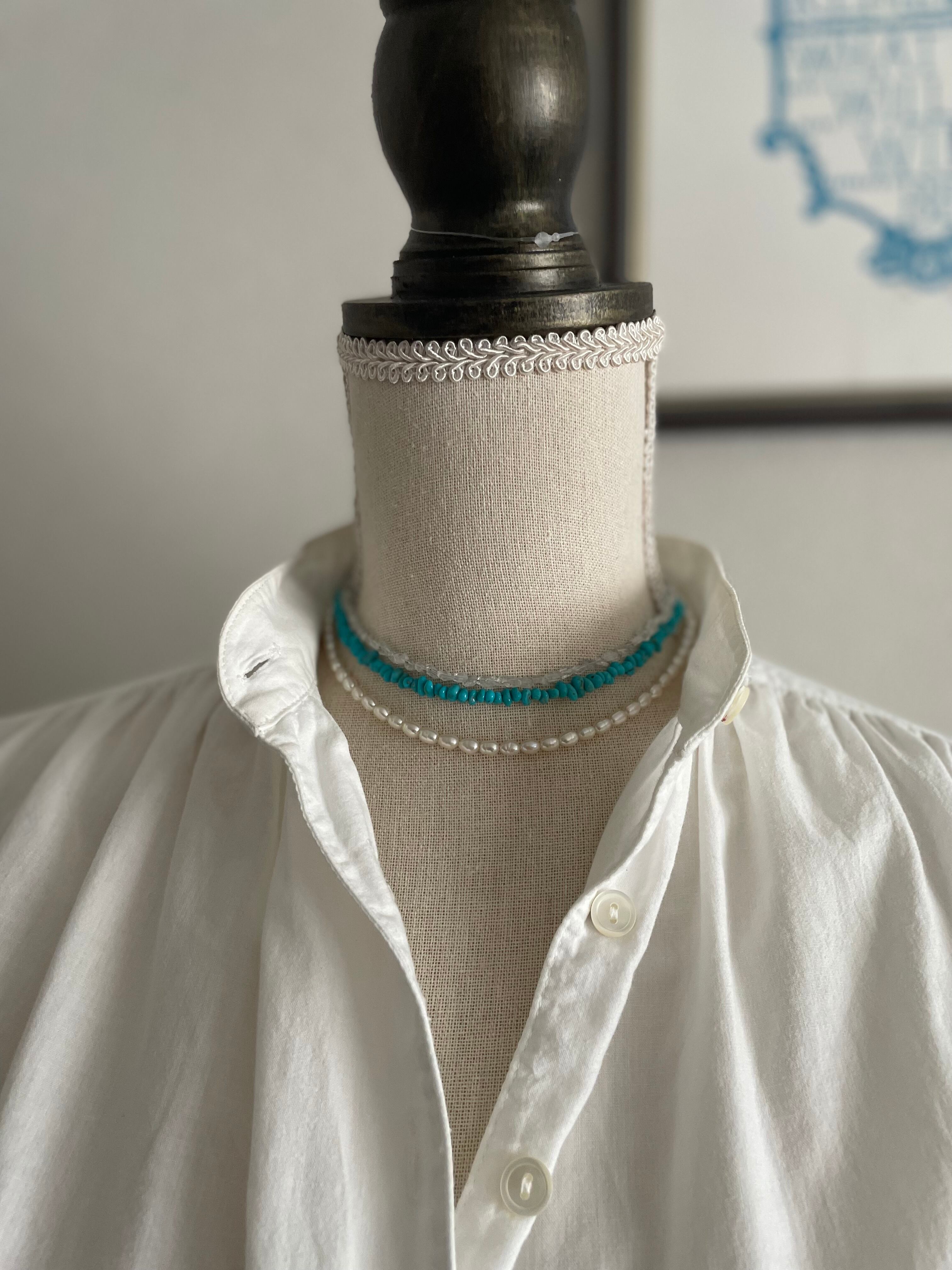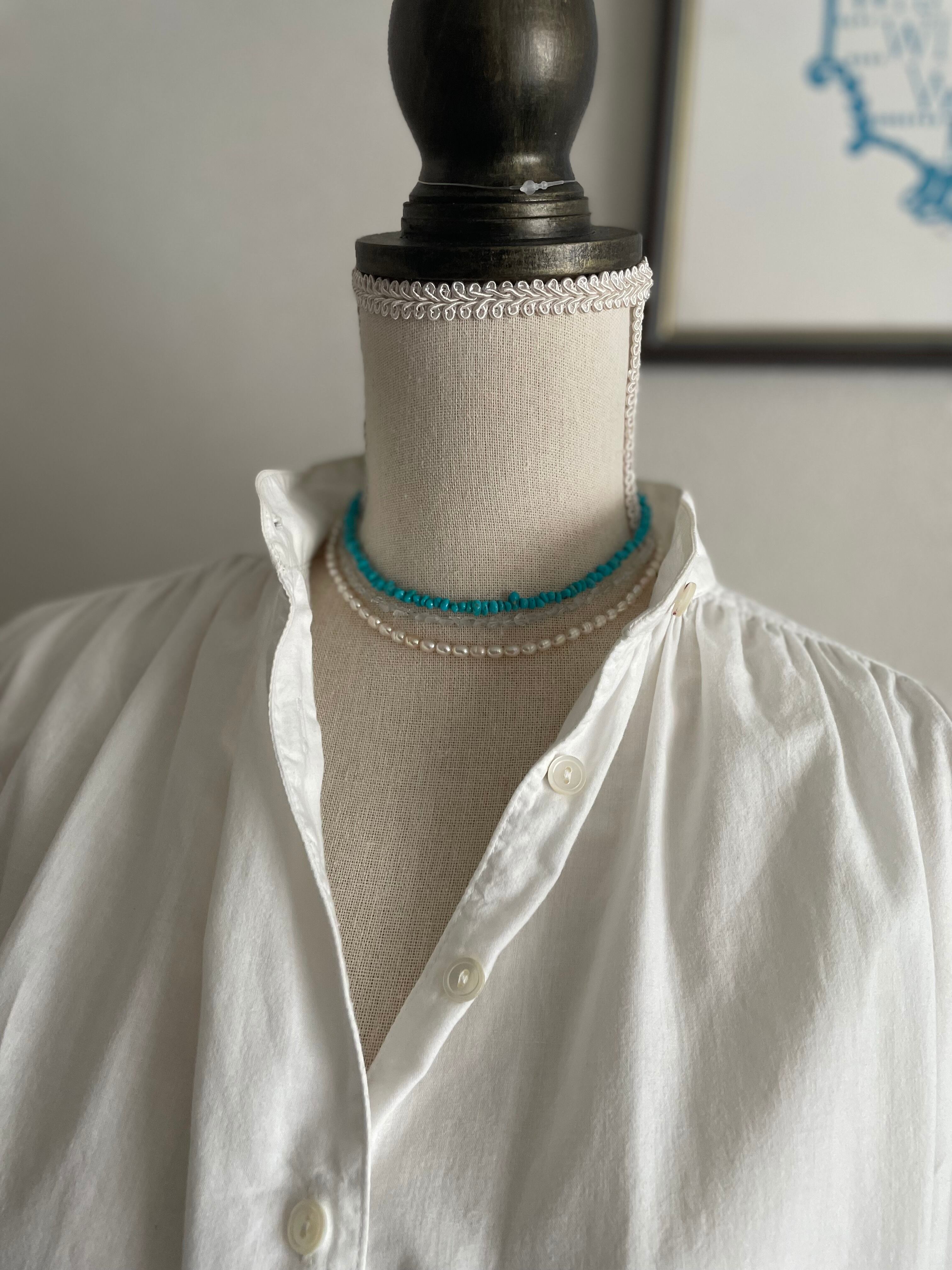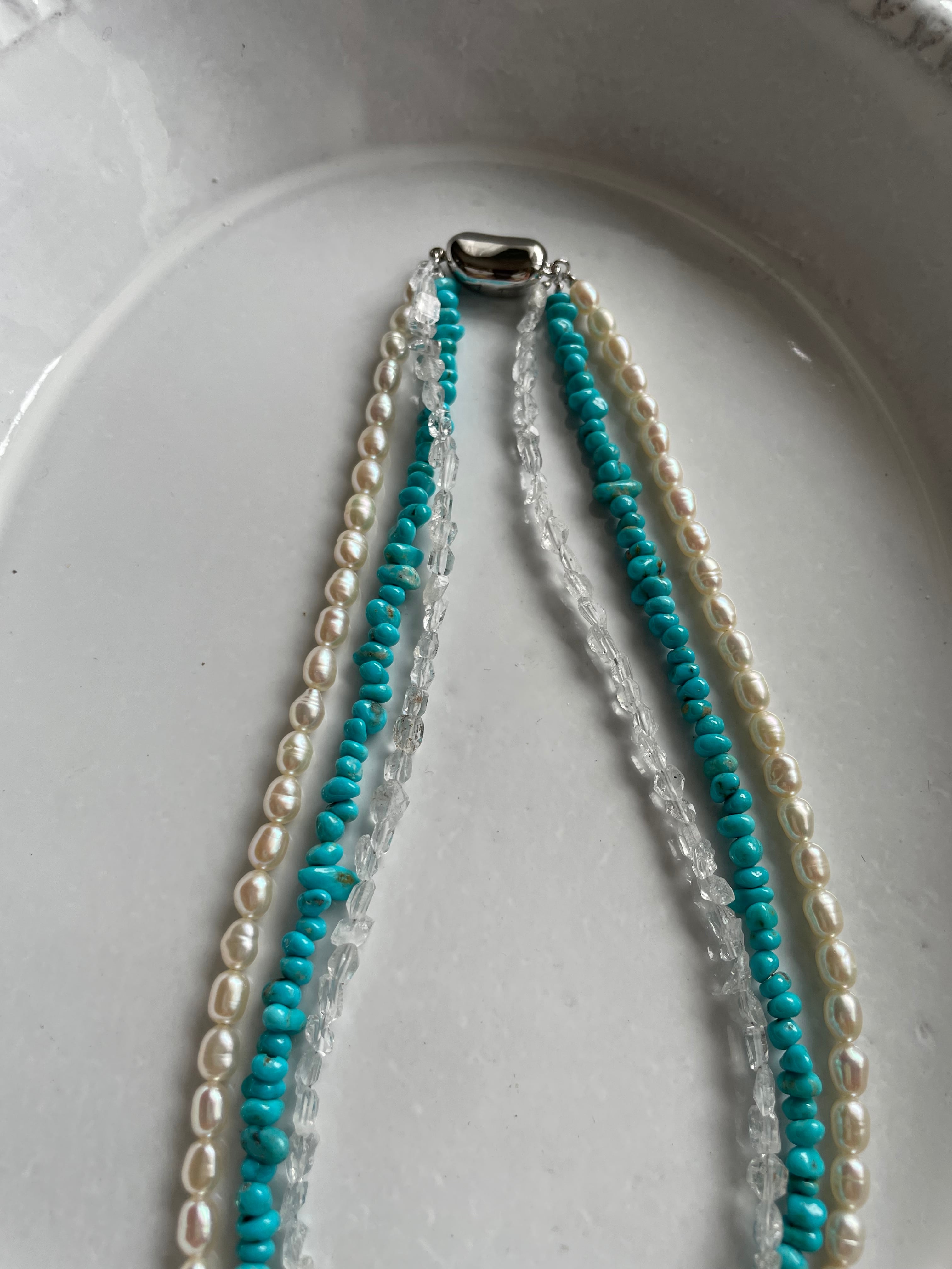 ダブルターミネーティッドという大変希少な両方が尖った約3.5〜4.0㎜の水晶(両剣水晶)とターコイズと3.5〜4.0㎜のbabypearlとのtriplemixnecklaceです。