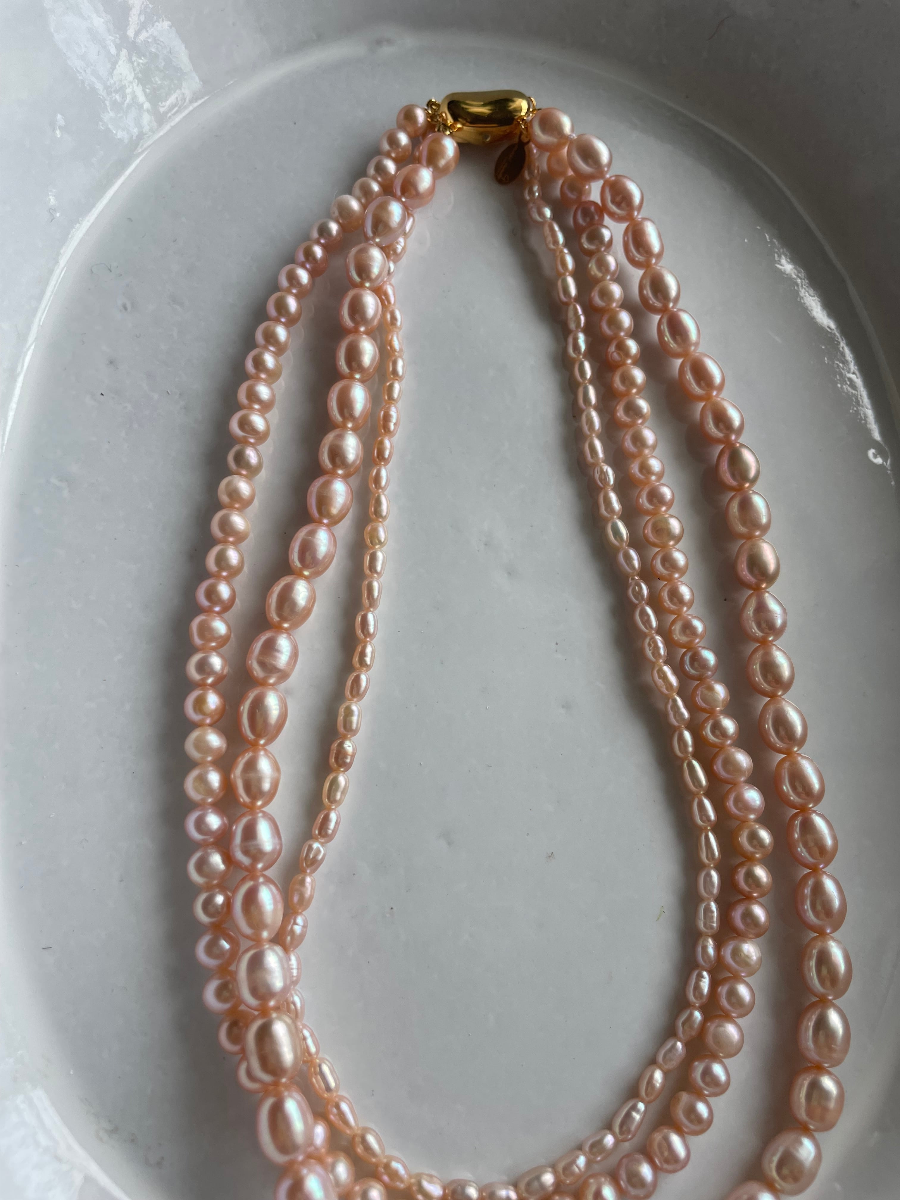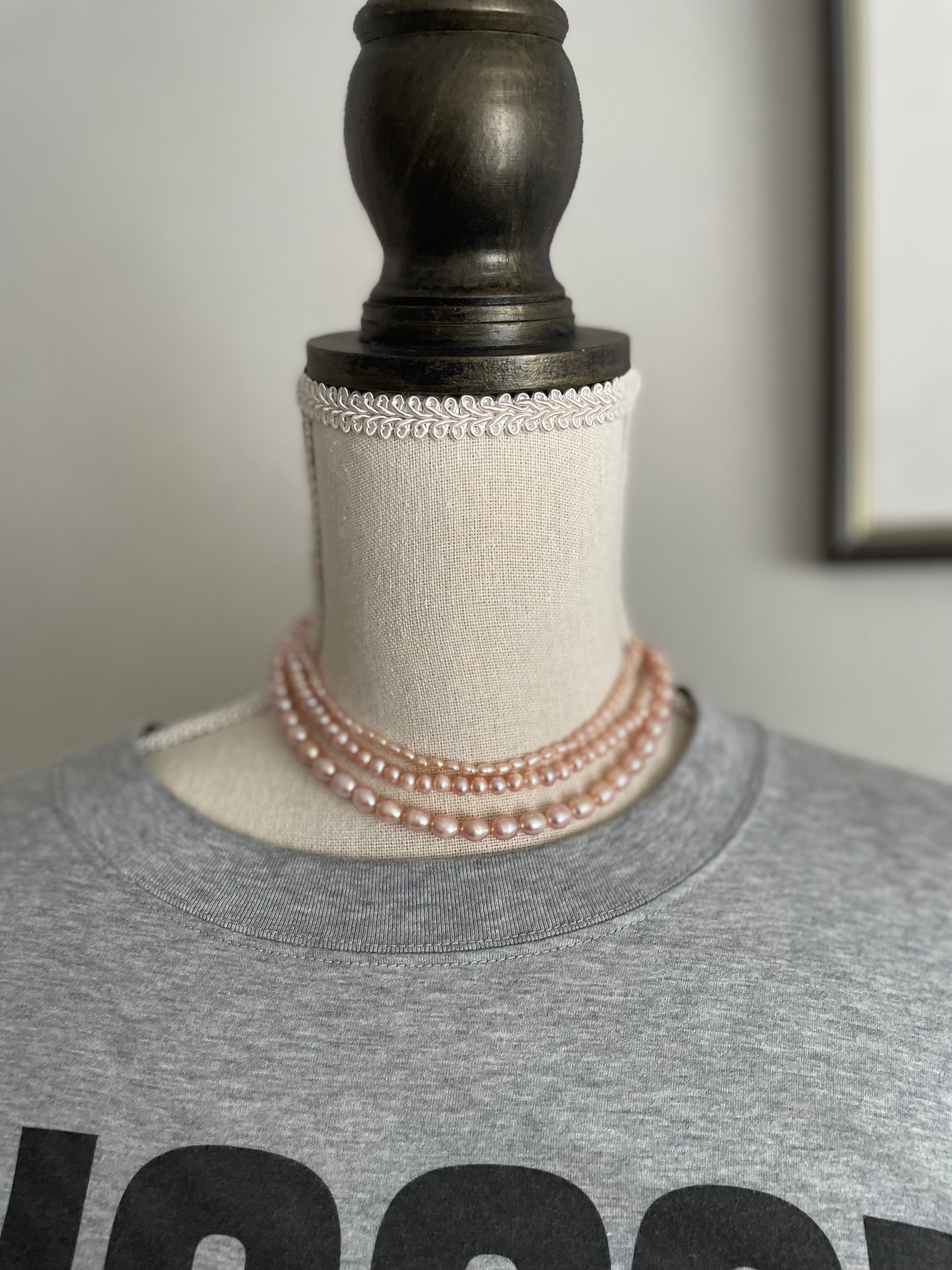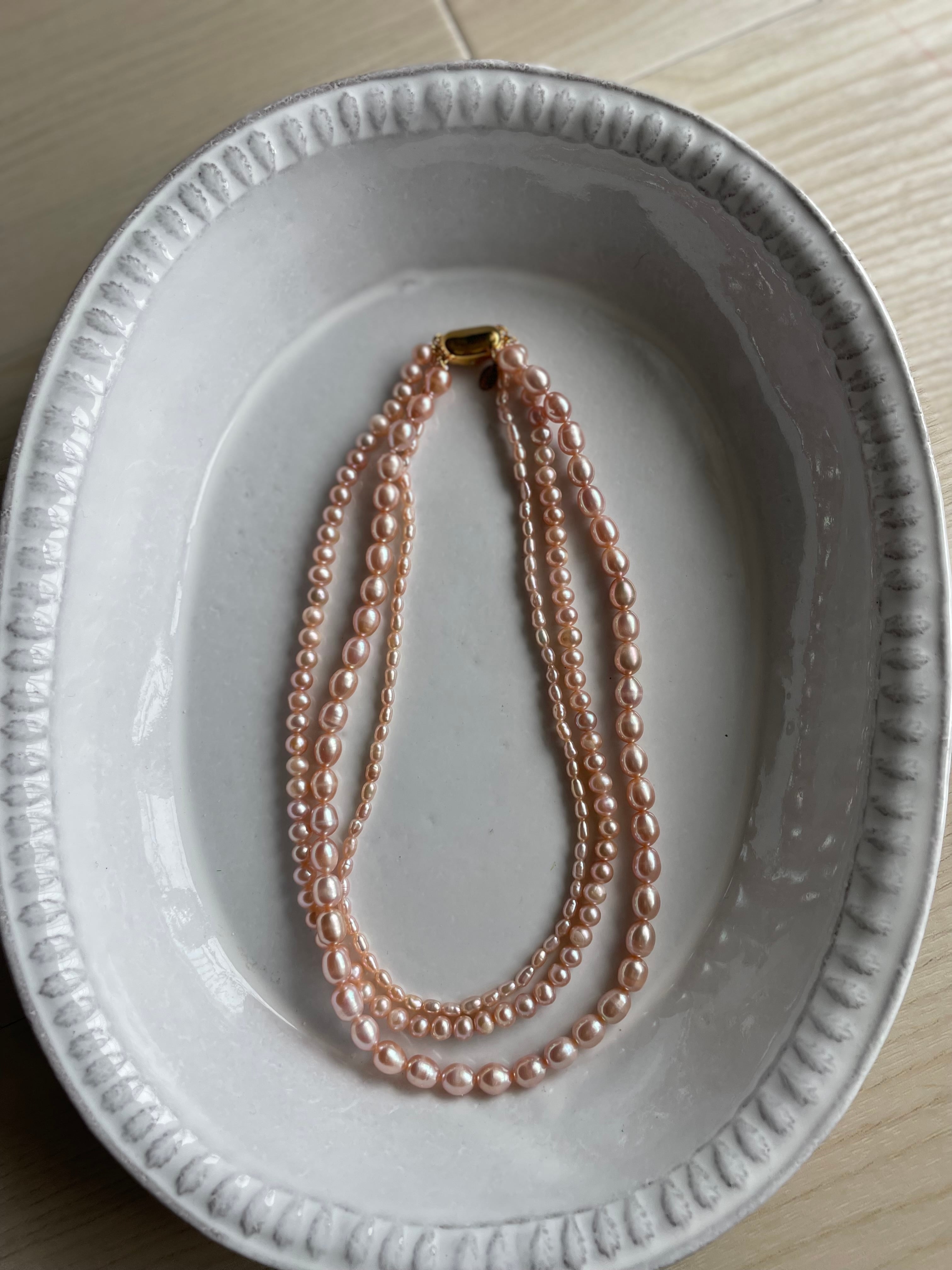 naturalcolorの優しいpinkcolorの大きさの違う3つのpearlを組み合わせたネックレスです。